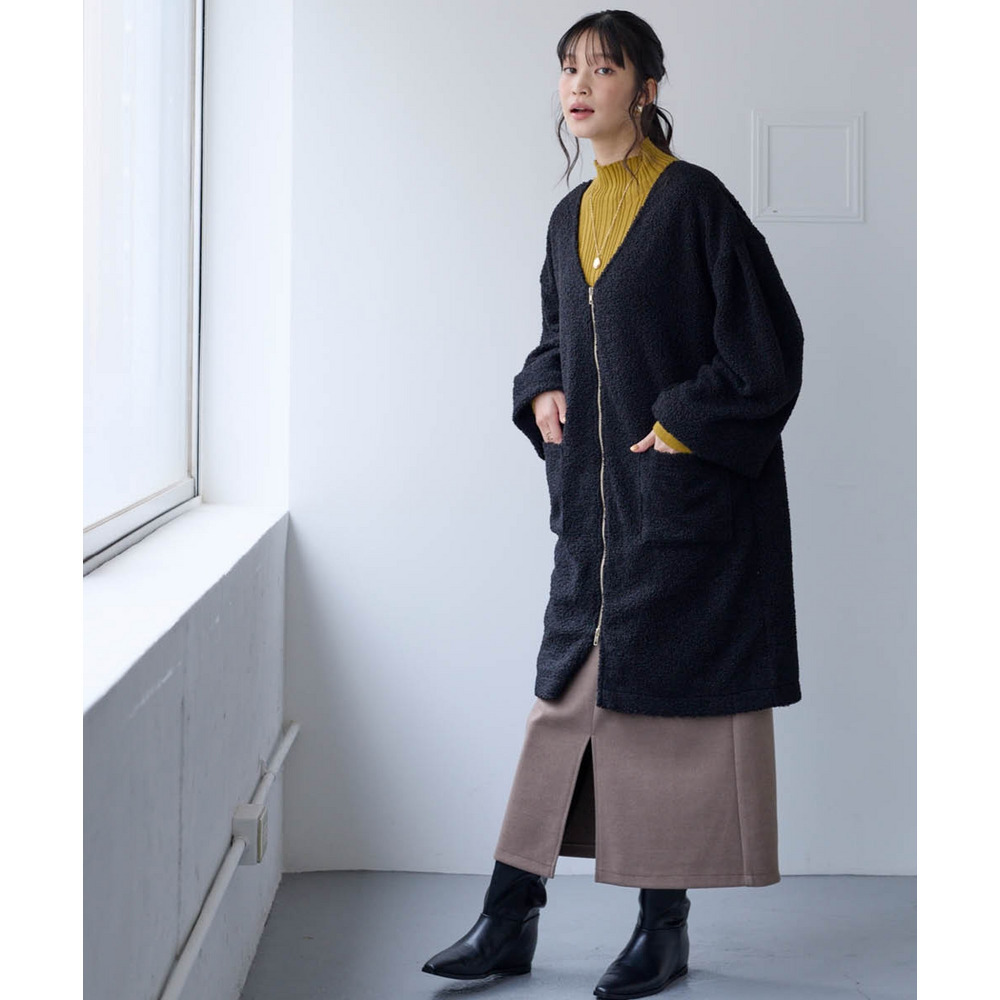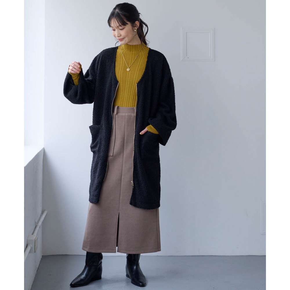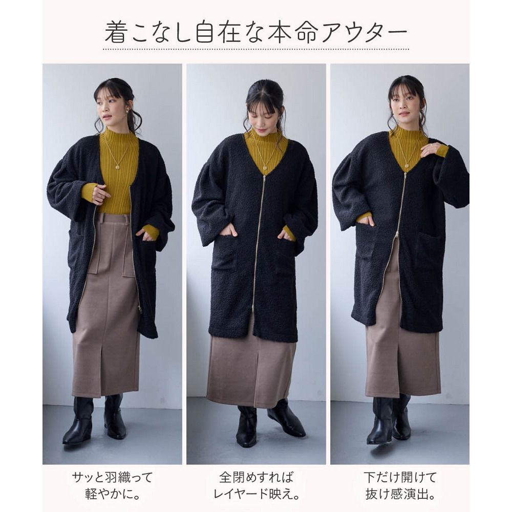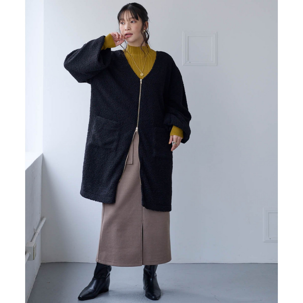 ロング丈が体型をまるっとカバーしつつ、長いファスナーが縦ラインを強調してスタイルアップ。
