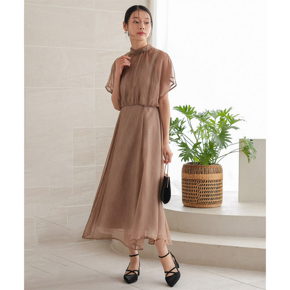 ハイネック風のネックラインがクラシカルな雰囲気を演出