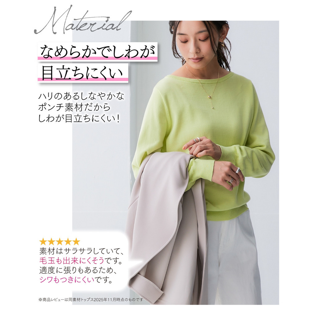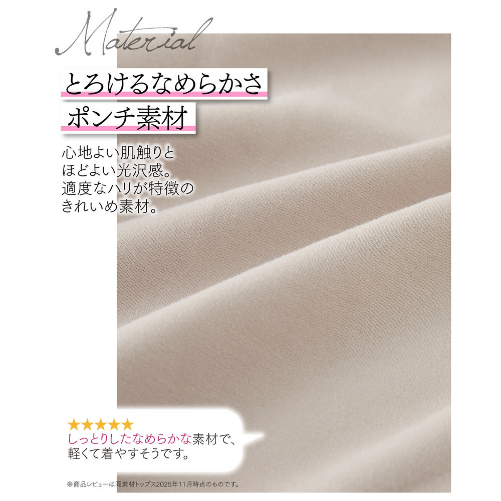 | 素材 | 品質=ポリエステル80%・レーヨン15%・ポリウレタン5% 透け感:なし 伸縮性:あり 生地の厚み:普通 光沢感:なし 裏地:なし ポケット:あり(両脇) >季節:春・秋向き シルエット:ややゆったり |