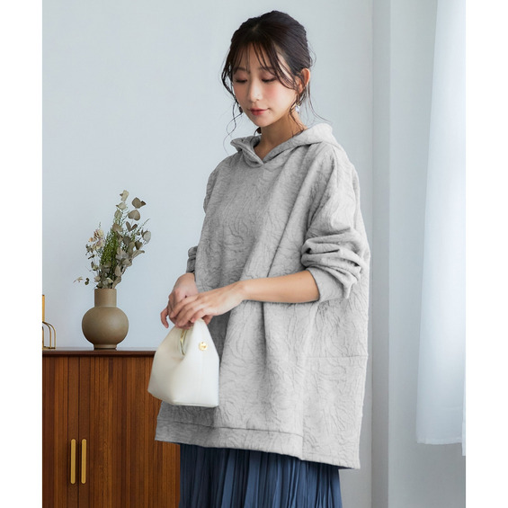 長め丈のチュニックパーカーとして、カジュアルになりすぎない上品なフレアラインにこだわり、360度どこから見ても美しいシルエットに仕上げています。