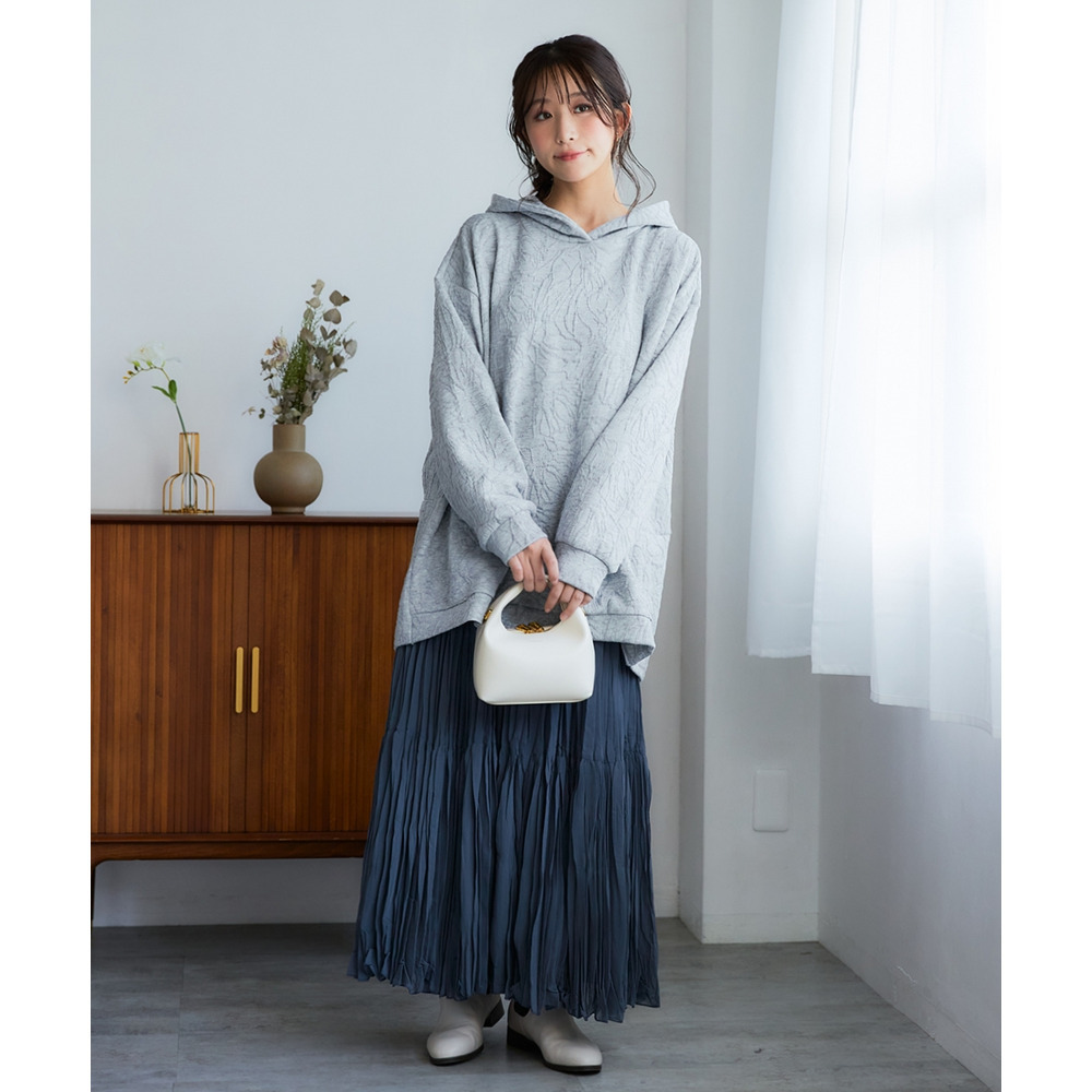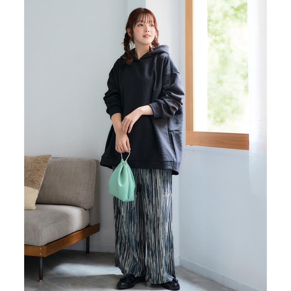 たっぷりとした身幅のオーバーサイズデザインは、気になるお腹周りやお尻をすっぽりと隠し、全身をスッキリとした印象に見せる華奢見え効果を発揮します。