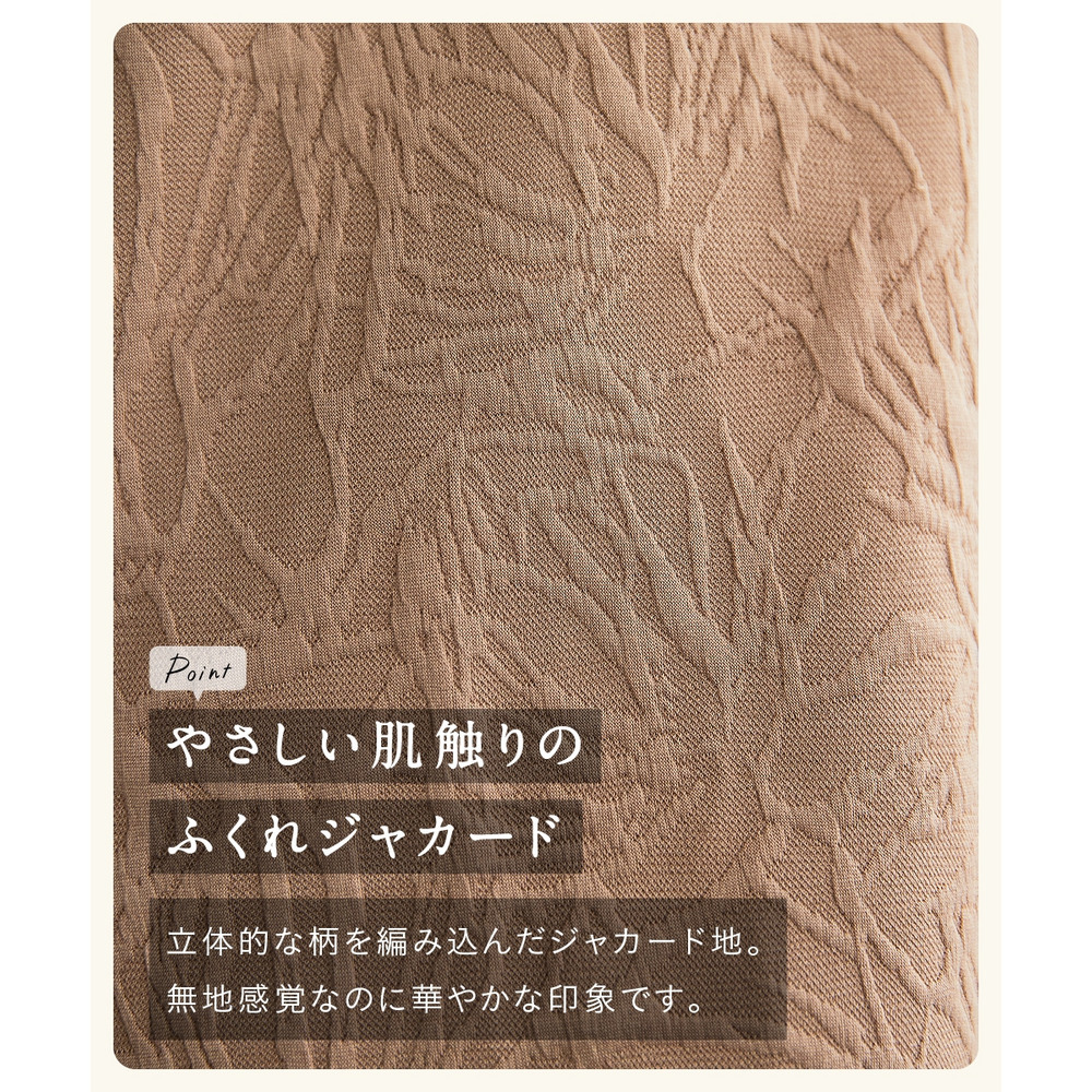 表面に浮き上がるようなボタニカル柄が美しい、贅沢な「ふくれジャガード」素材を採用しています。
