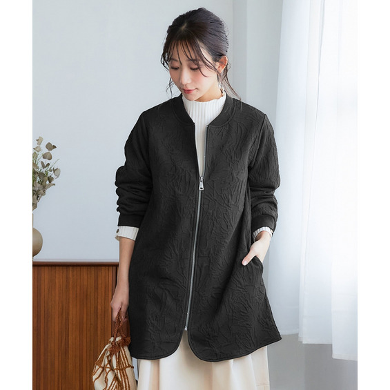 ブルゾンのジャガード柄が華やかなので、インナーはシンプルな無地を選ぶだけで洗練されたお出かけコーデが即完成。