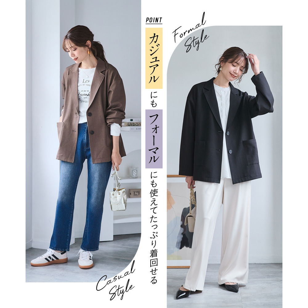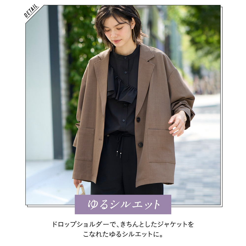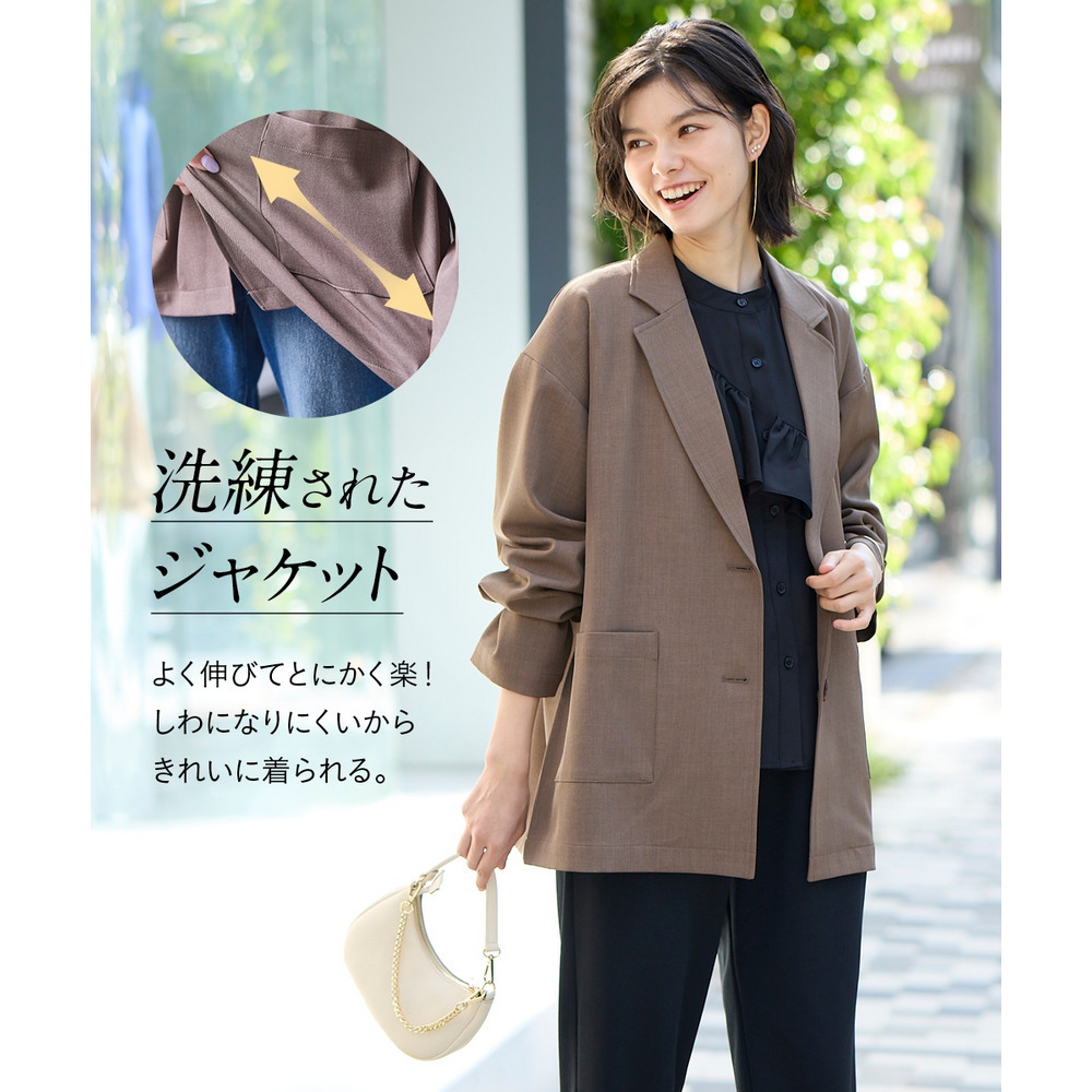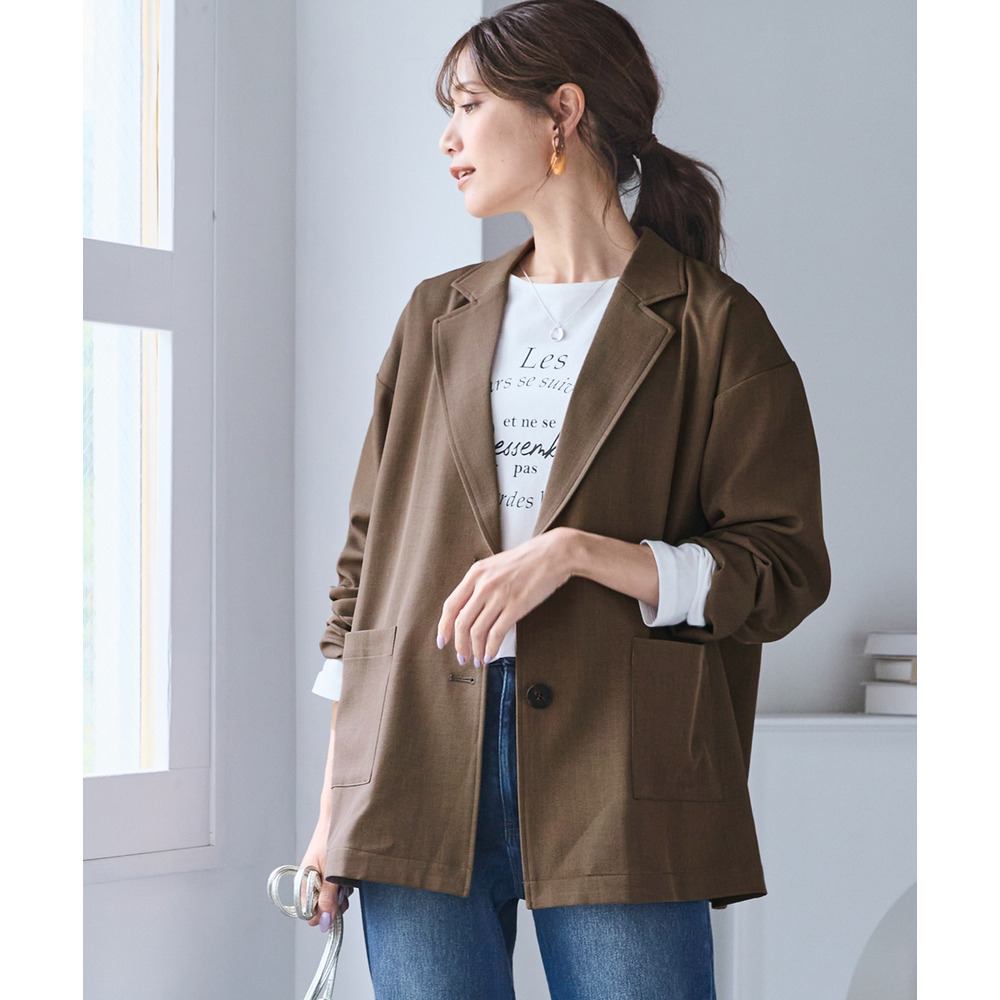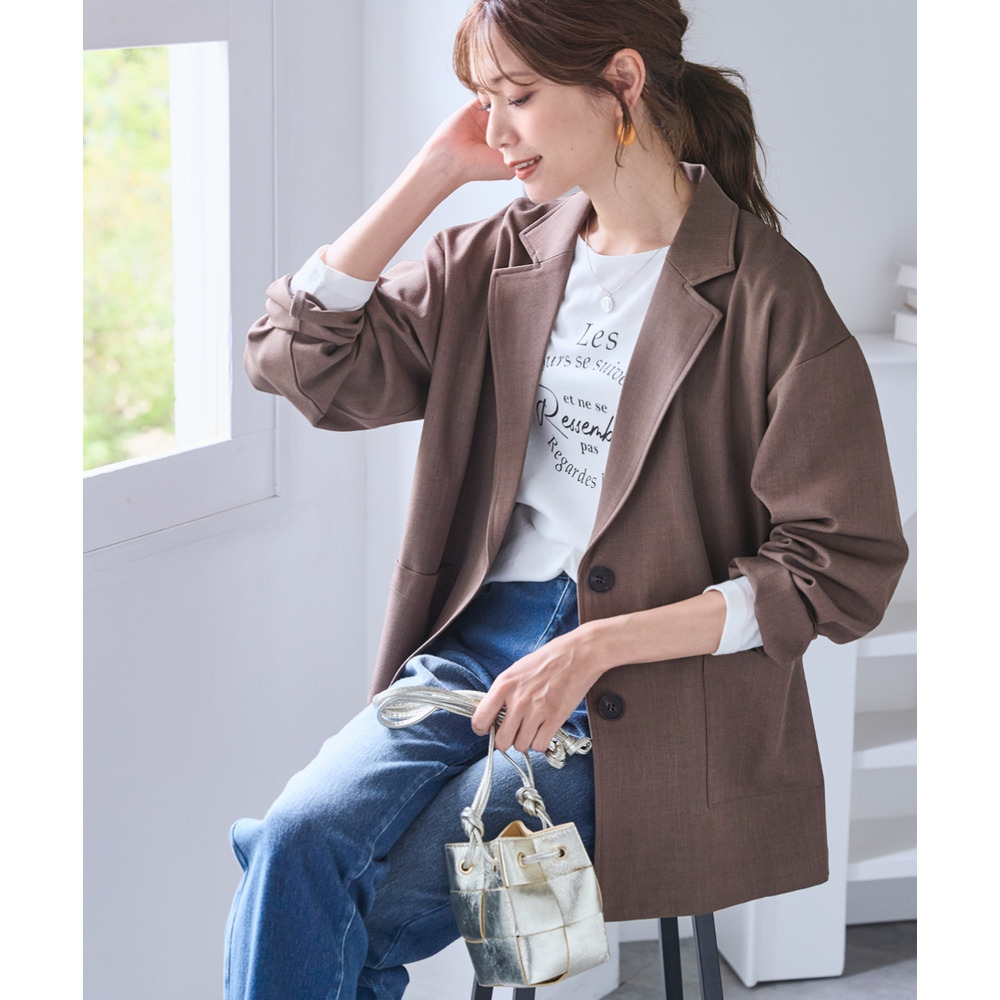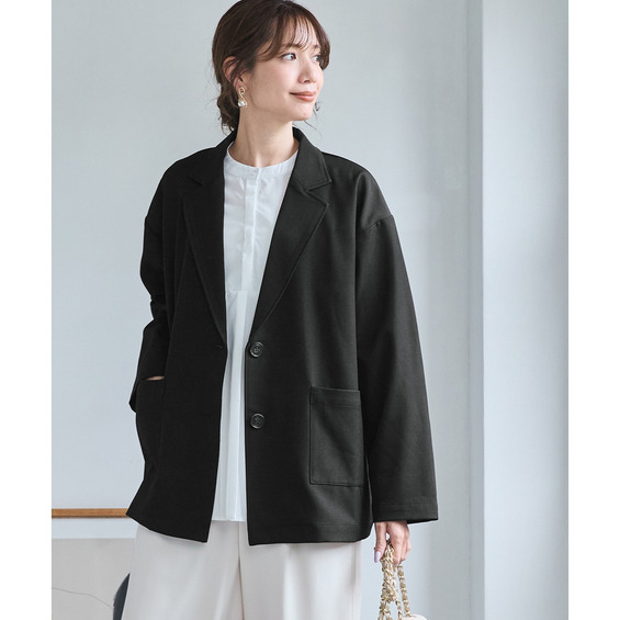 ボウタイブラウスとのコンビできちんとオフィススタイルまで色々着まわせるお役立ちジャケットです。