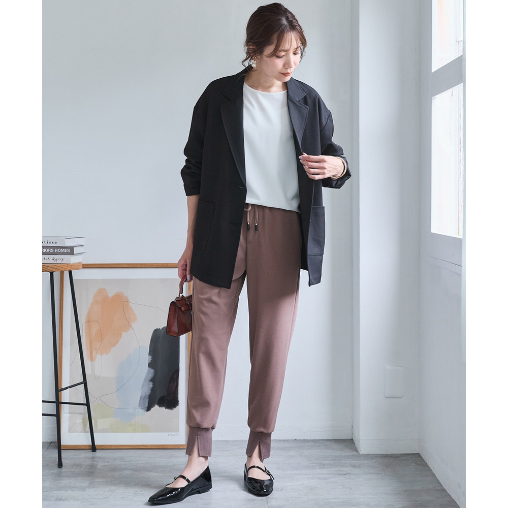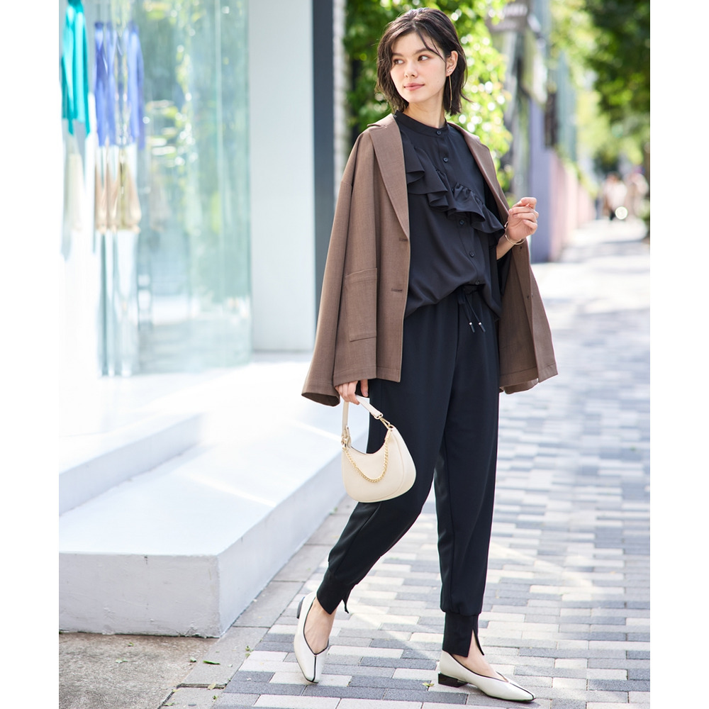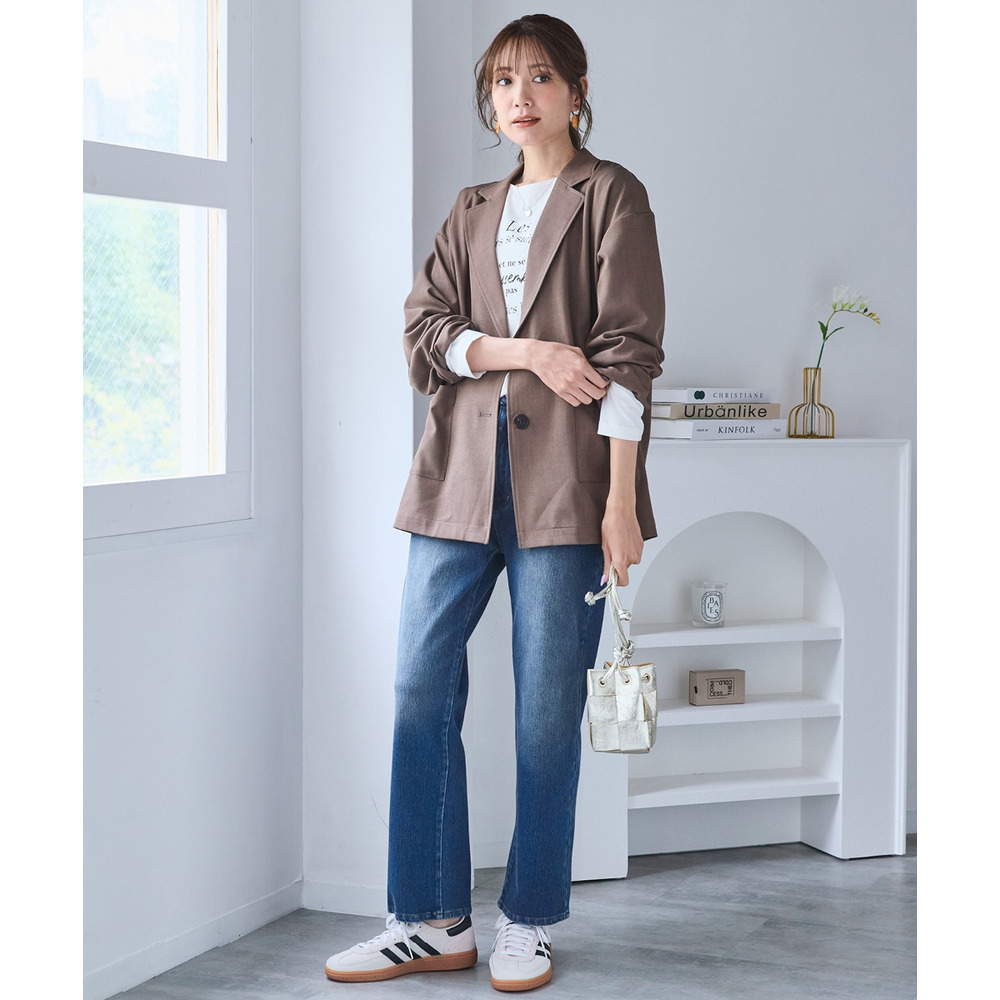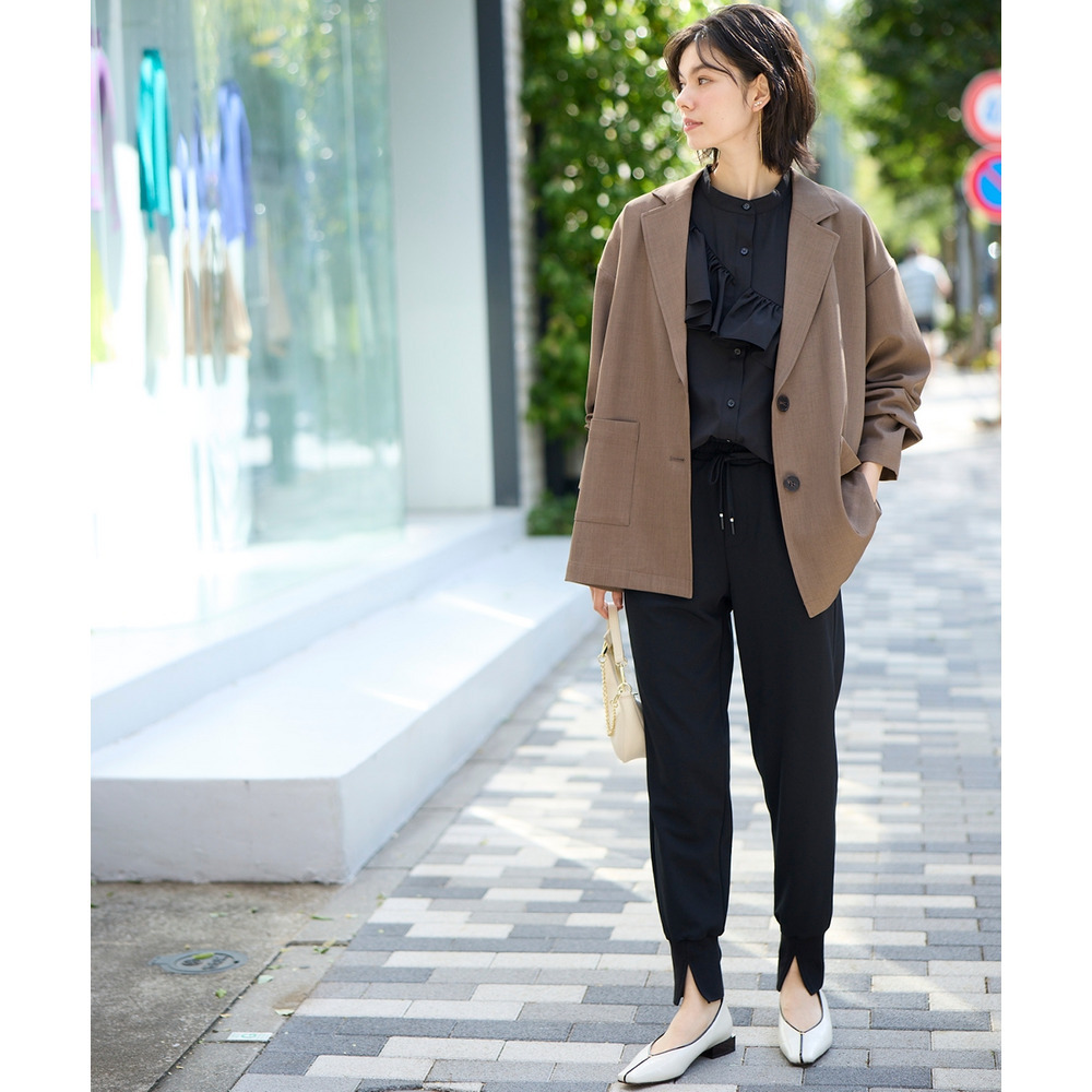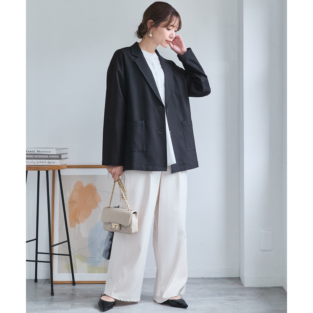 ボウタイブラウスとのコンビできちんとオフィススタイルまで色々着まわせるお役立ちジャケットです。
