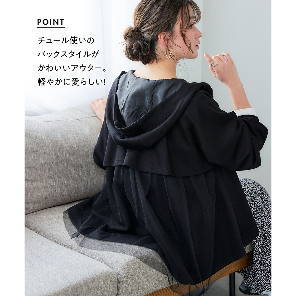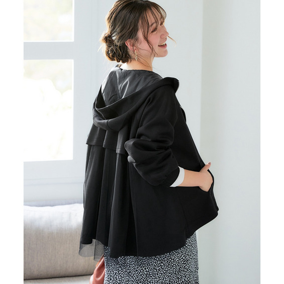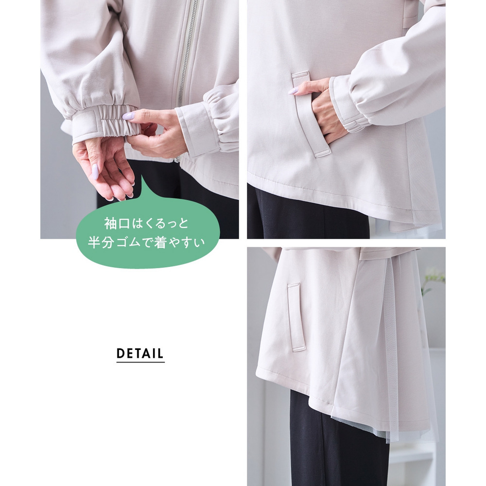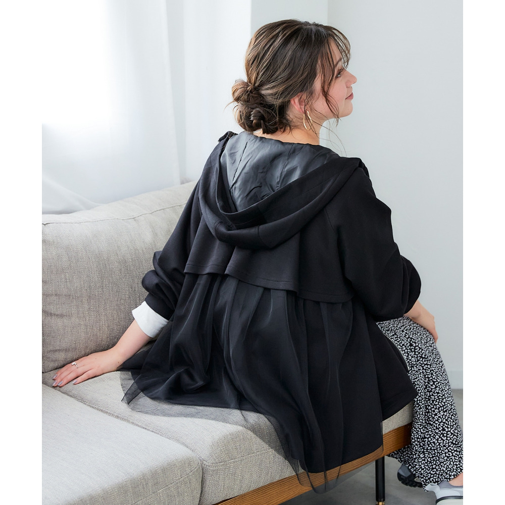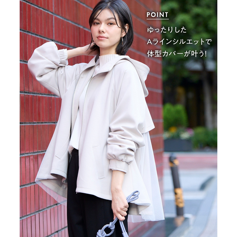 素材 [本体]ポリエステル52%・レーヨン41%・ポリウレタン7% [チュール]ポリエステル100% [裏地]有(総裏)前ファスナー 袖口ゴム ポケット両脇 着丈前後差有 引っかかりにご注意ください。 透け感:透けにくい 伸縮性:あり(裏地は伸びません) 生地の厚み:普通 光沢感:なし 裏地:あり ポケット:あり 季節:秋・冬・春 シルエット:ゆったり