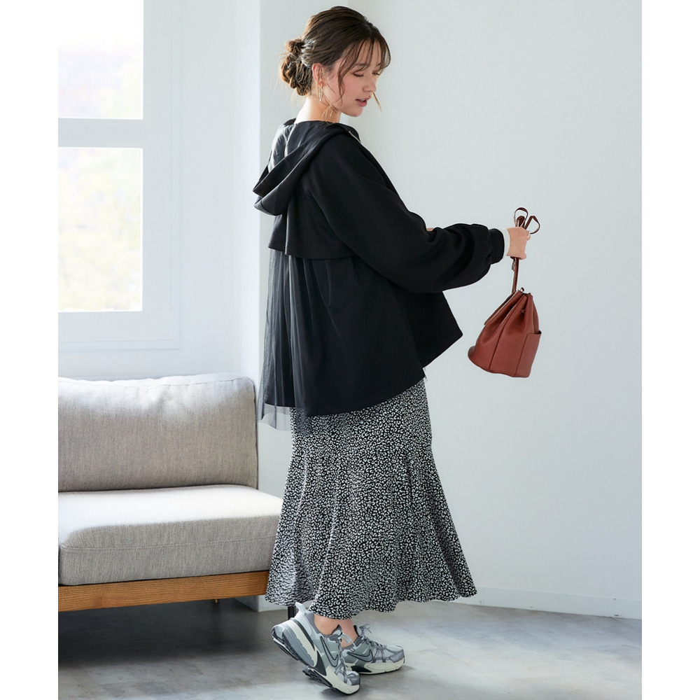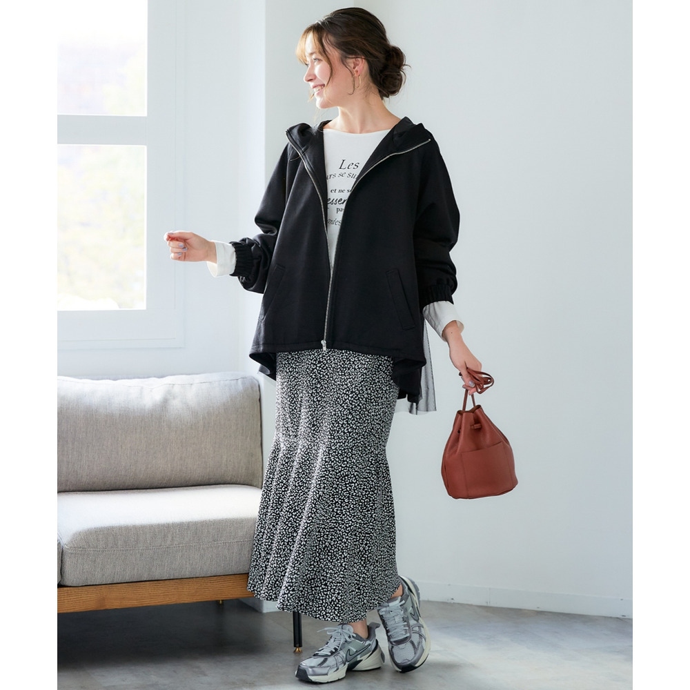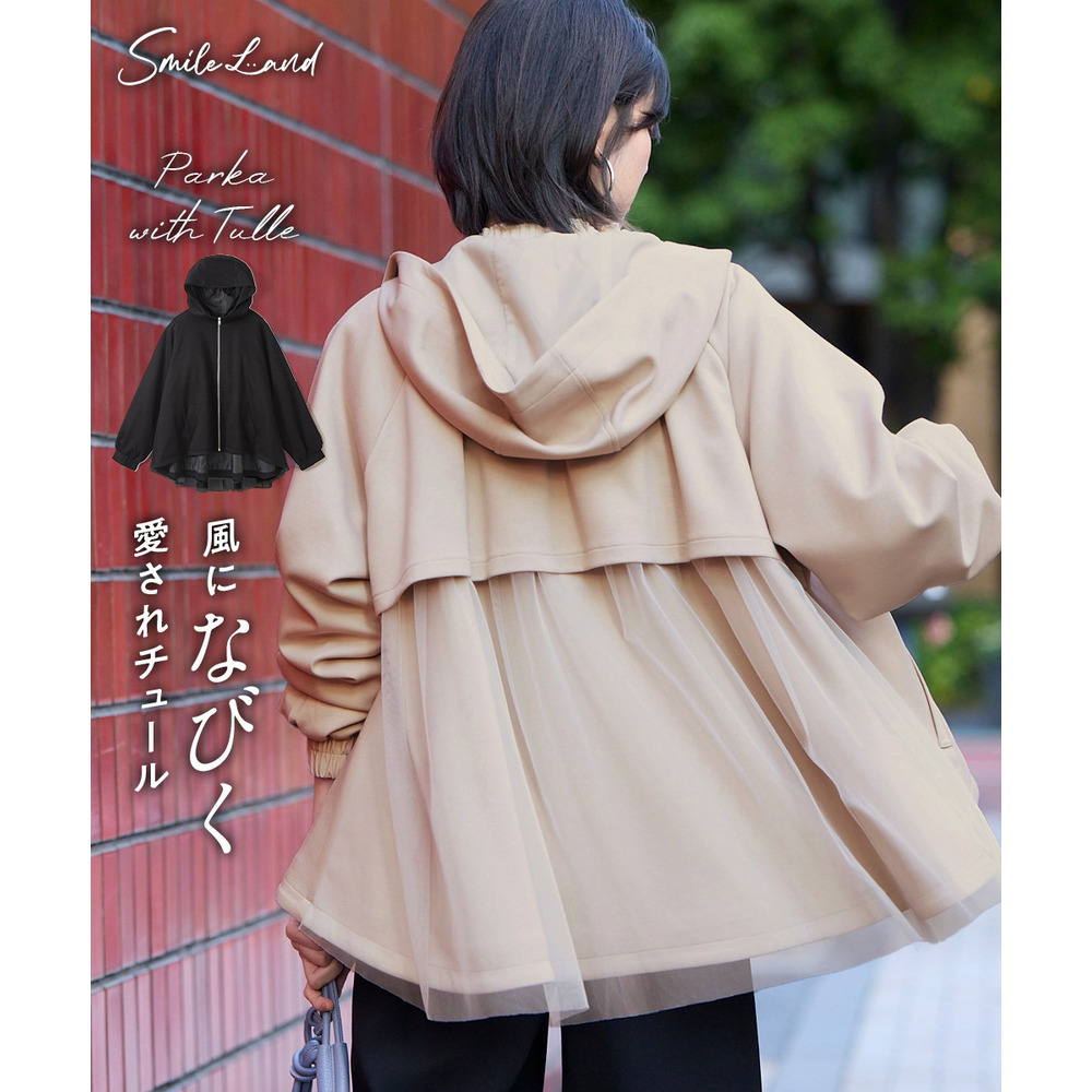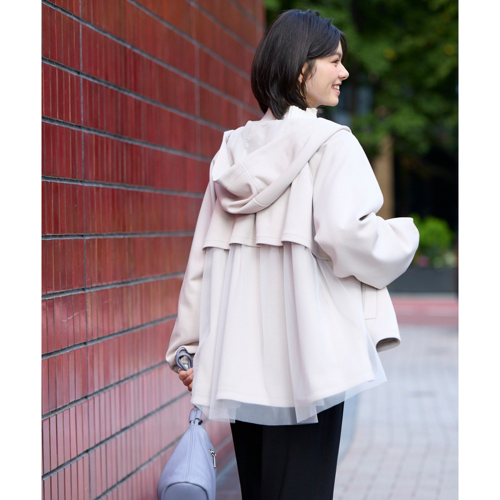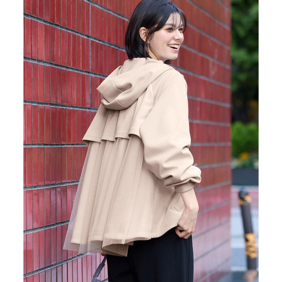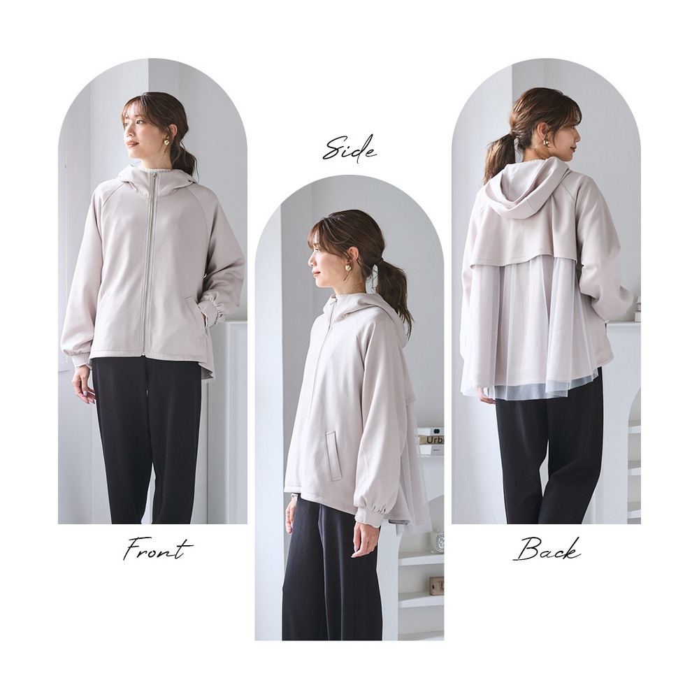 素材 [本体]ポリエステル52%・レーヨン41%・ポリウレタン7% [チュール]ポリエステル100% [裏地]有(総裏)前ファスナー 袖口ゴム ポケット両脇 着丈前後差有 引っかかりにご注意ください。 透け感:透けにくい 伸縮性:あり(裏地は伸びません) 生地の厚み:普通 光沢感:なし 裏地:あり ポケット:あり 季節:秋・冬・春 シルエット:ゆったり
