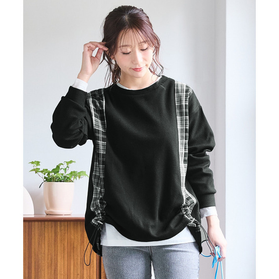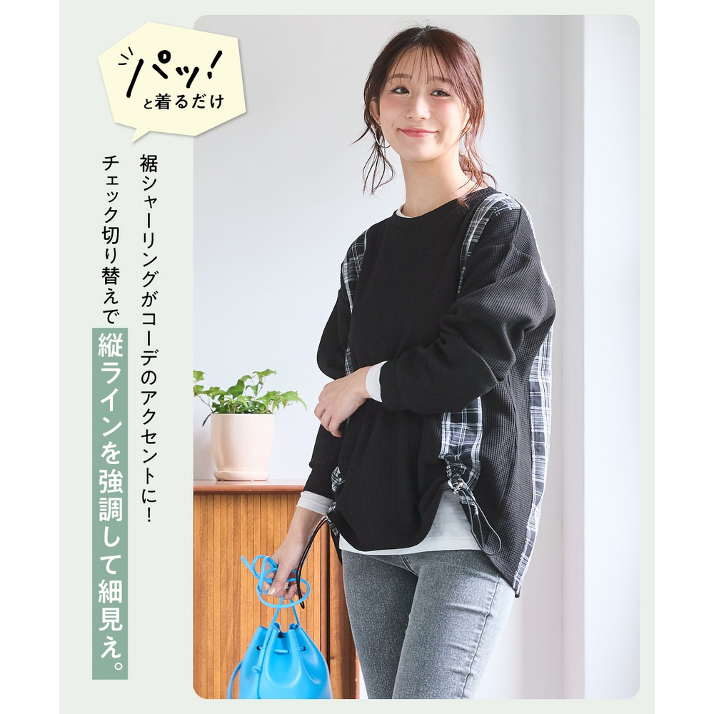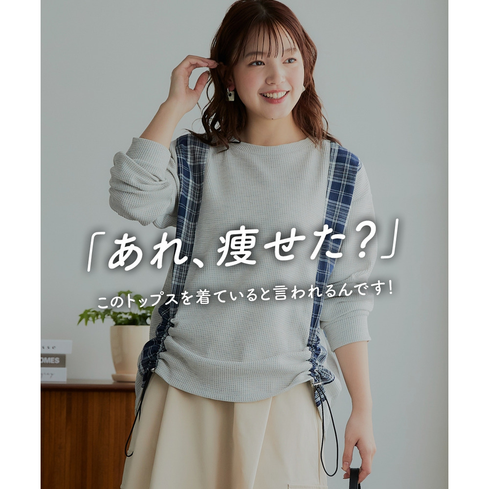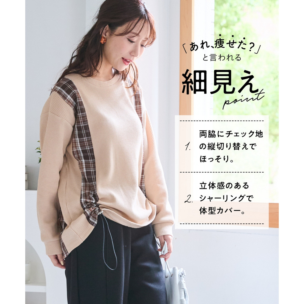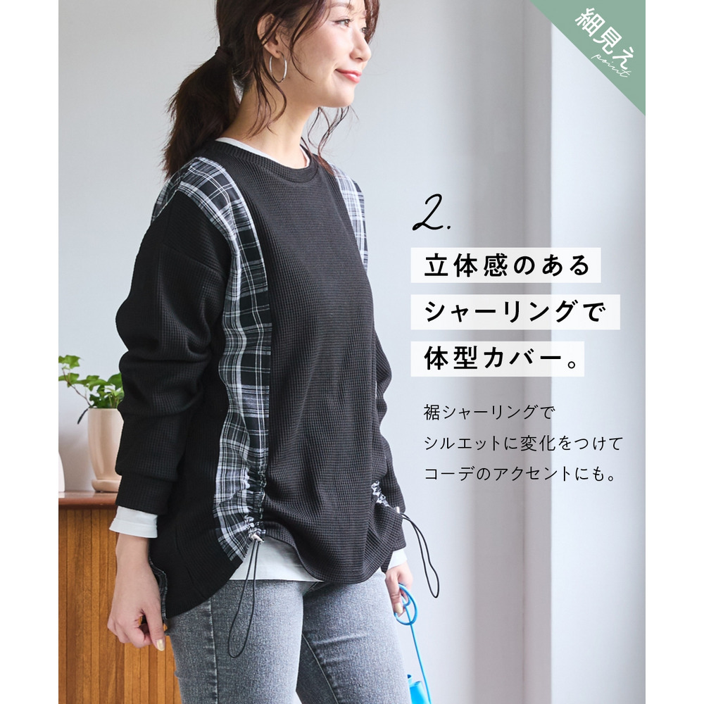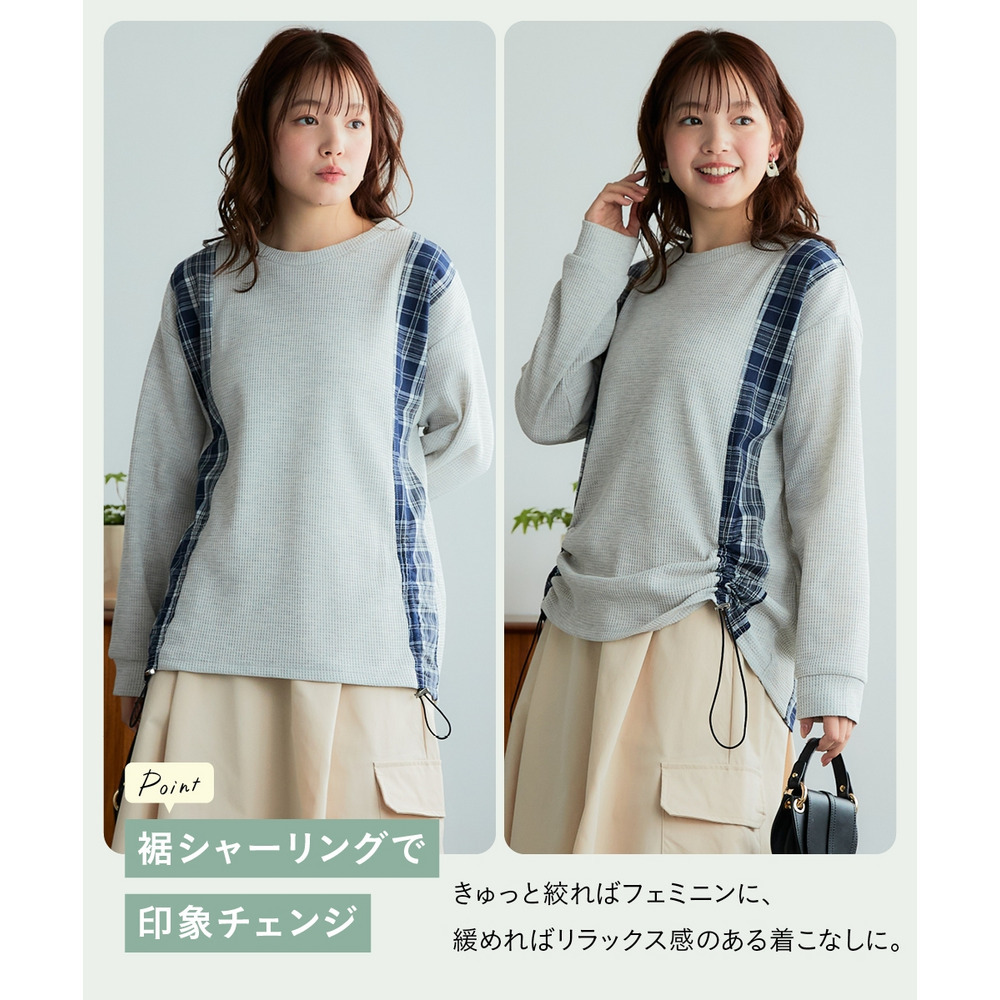 縦チェック切替シャーリングワッフルトップス 大きいサイズ