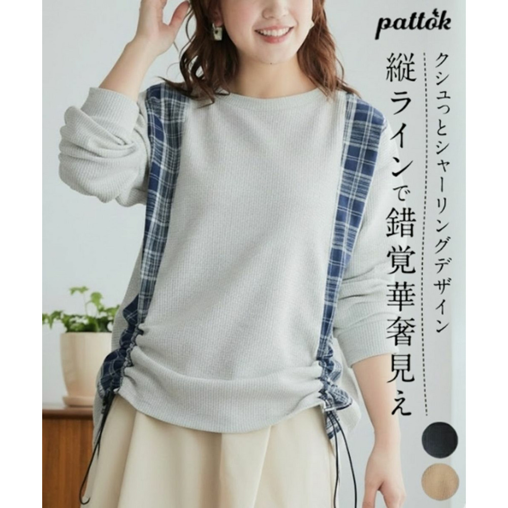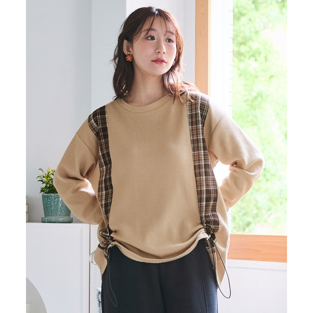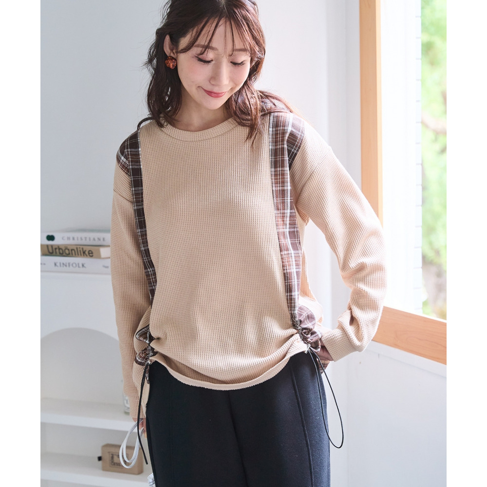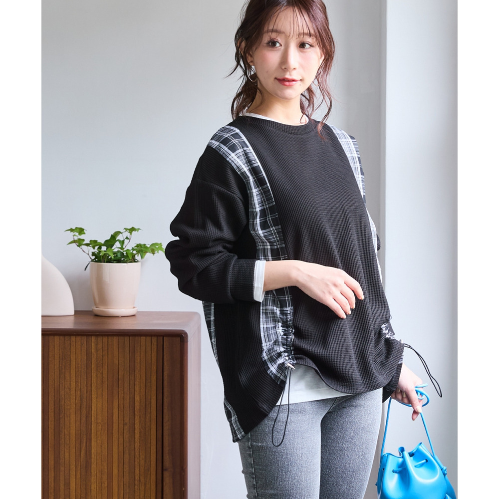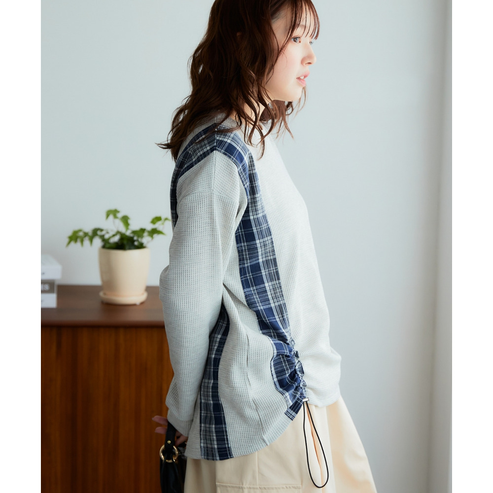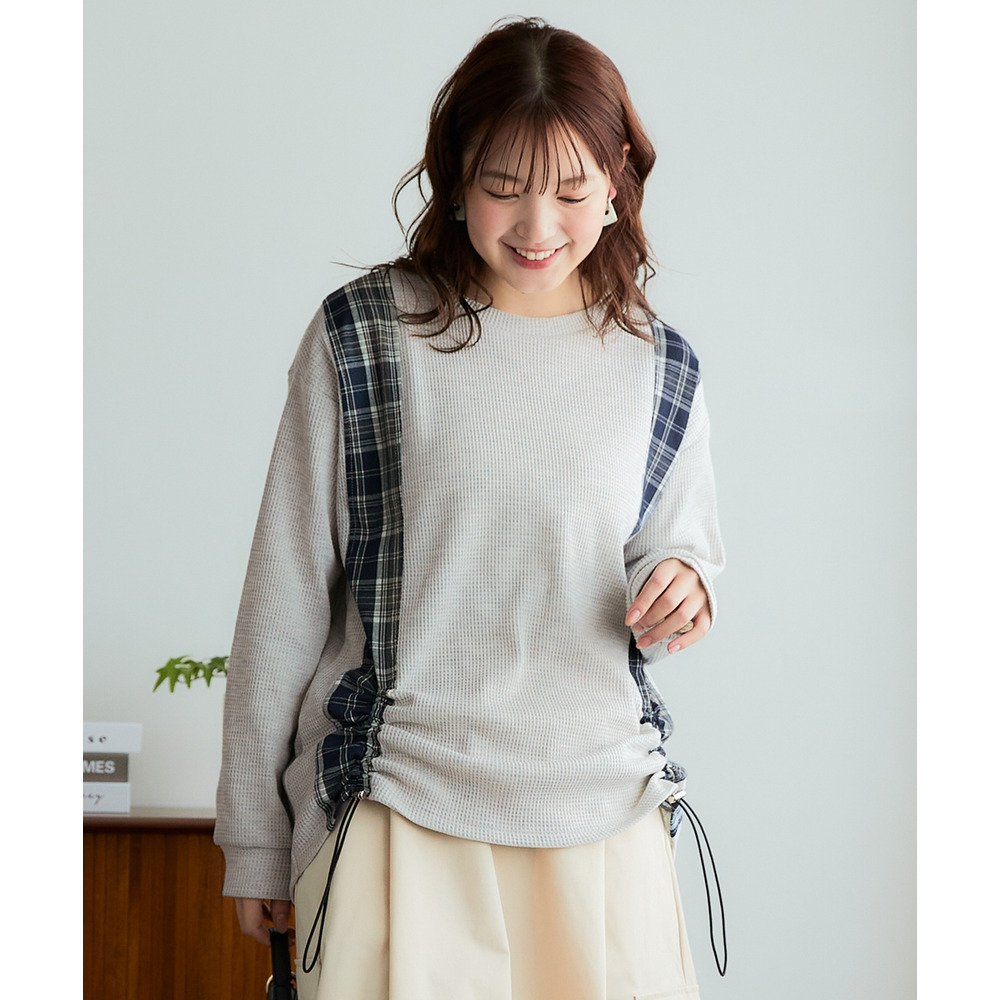 縦チェック切替シャーリングワッフルトップス 大きいサイズ