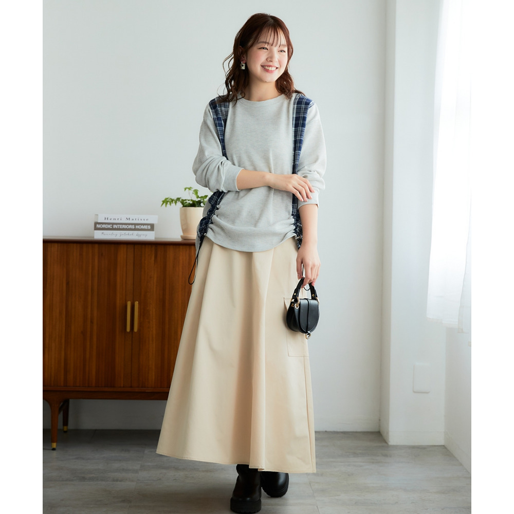 トップスのシャーリングで丈感を微調整できるため、ボリュームのあるスカートと合わせてもバランス良くまとまり、脚長効果も期待できます。