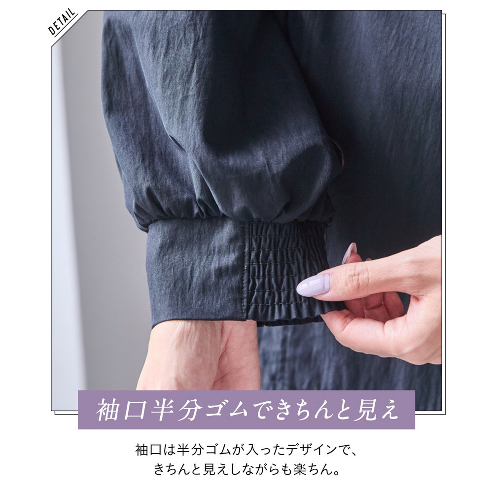 袖口のギャザーが女性らしい柔らかさをプラスし、どんなスタイルにも合わせやすい一着です。