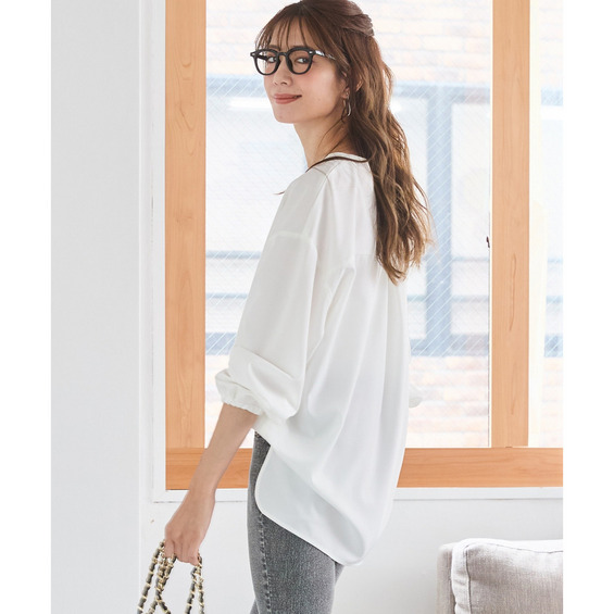 涙あきにはさりげなくゴールドのボタンを使って大人ブラウスを演出。