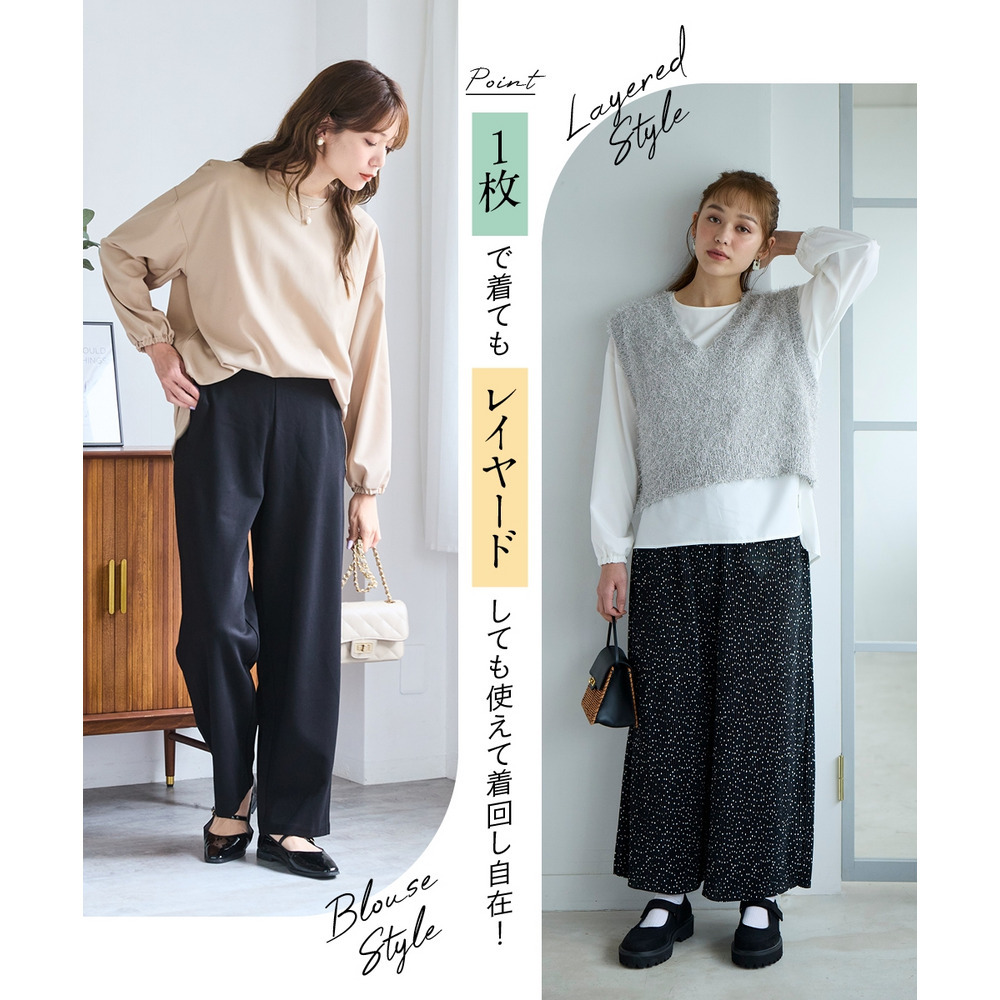 素材 ポリエステル95%・ポリウレタン5% 後ボタン涙開き 袖口ゴム 着丈前後差有 透け感:やや透ける ※色によって透け感が異なる場合があります。淡色カラーはベージュ系インナー着用をおすすめします。 伸縮性:ややあり 生地の厚み:普通 光沢感:なし 裏地:なし ポケット:なし ウエスト:総ゴム 季節:春・夏・秋 シルエット:ゆったり