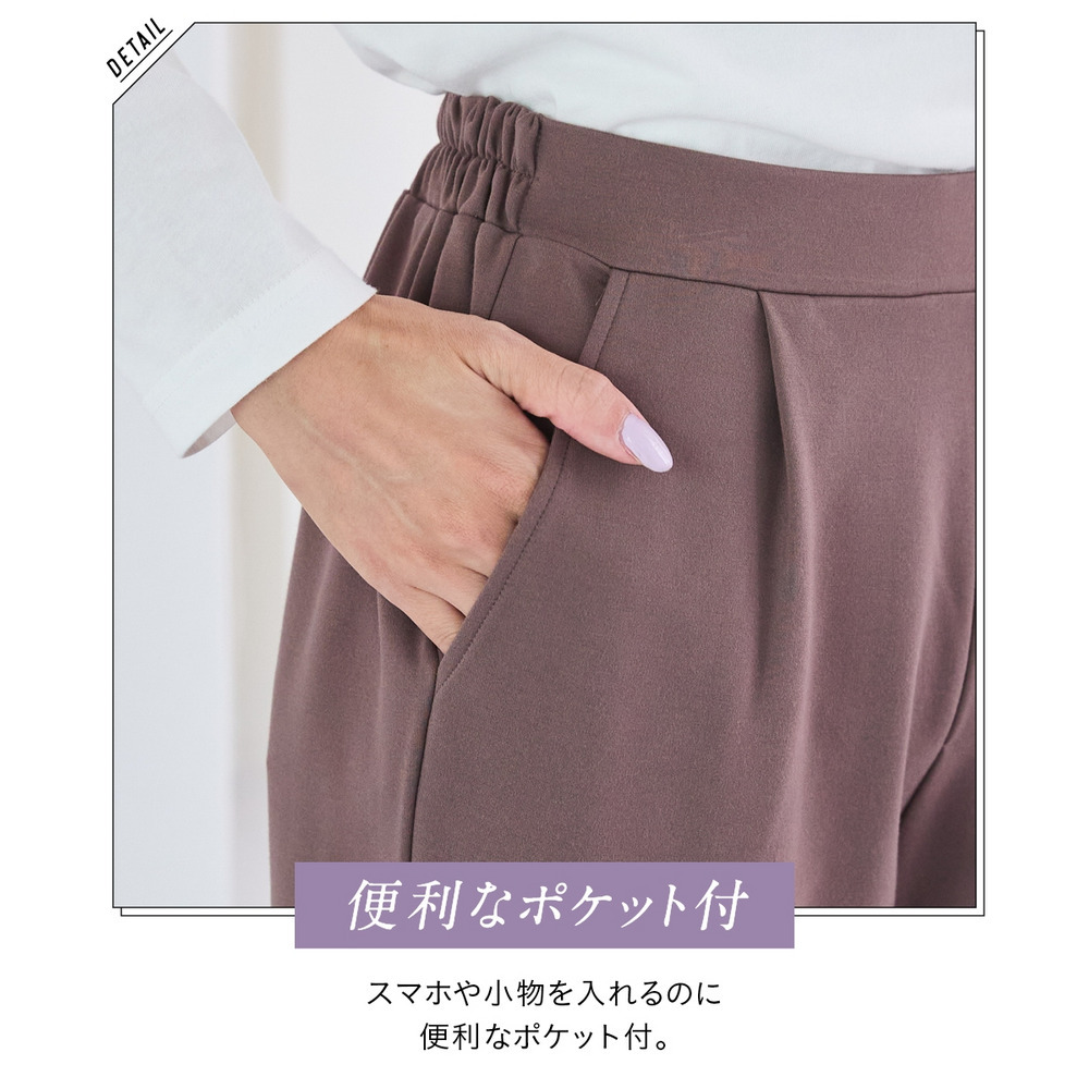 | 素材 | ポリエステル80%・レーヨン14%・ポリウレタン6% ウエスト後ゴム ポケット両脇 股上深め 透け感:透けにくい 伸縮性:あり 生地の厚み:普通 光沢感:なし 裏地:なし ポケット:あり ウエスト:ゴム入 季節:秋・冬・春 シルエット:ゆったり |