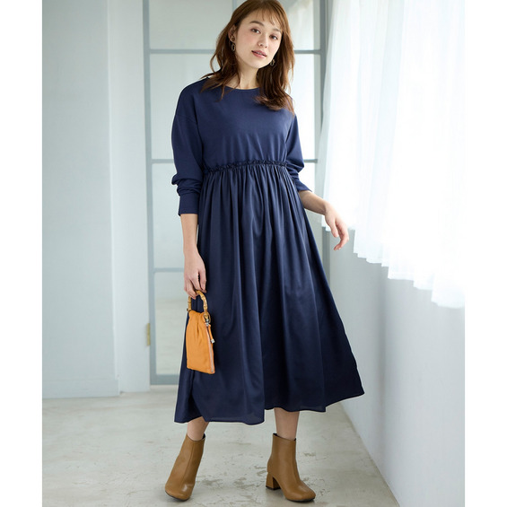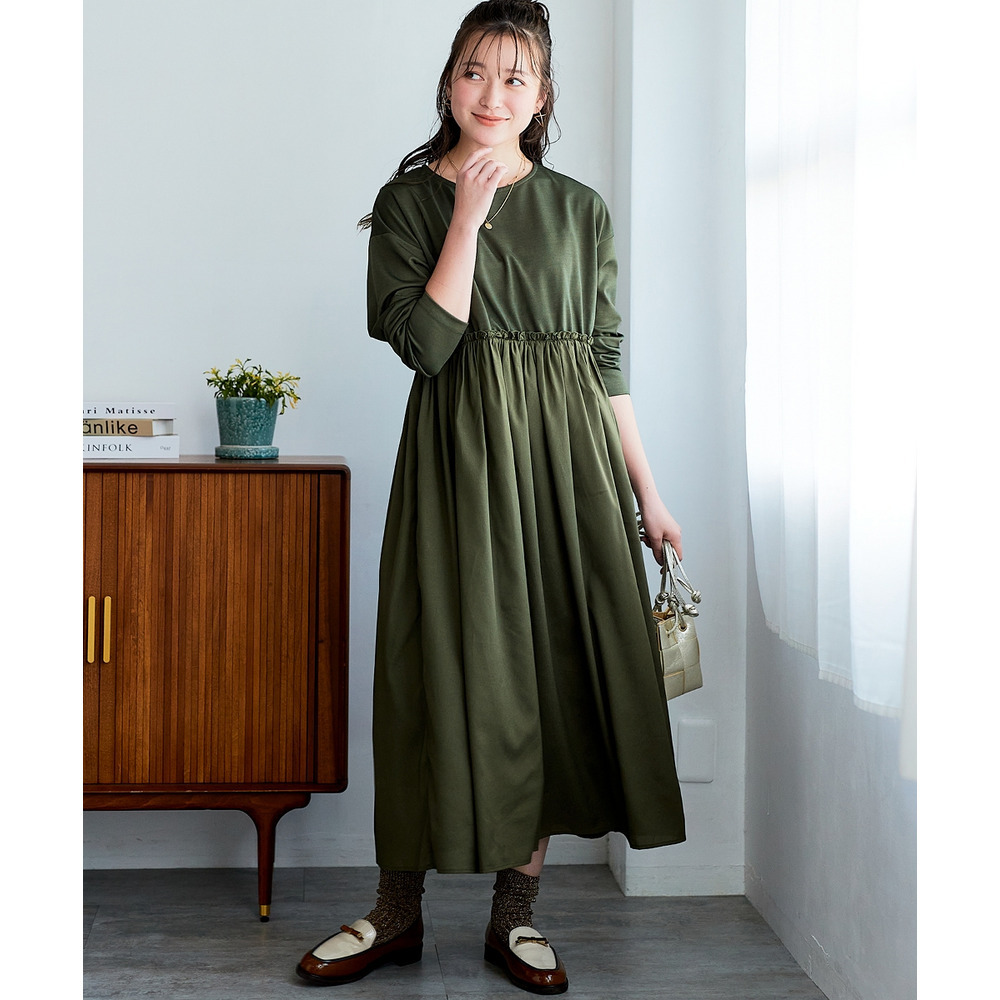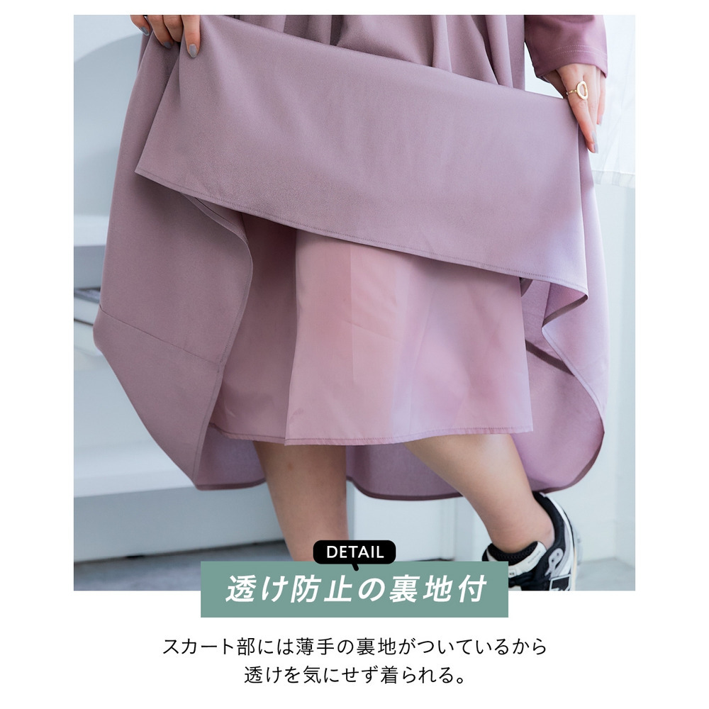 素材 [本体]ポリエステル98%・ポリウレタン2% [スカート部]ポリエステル100% [裏地]有(スカート部)ウエストゴム入 透け感:透けにくい 伸縮性:ややあり(切替上部) 生地の厚み:普通 光沢感:ややあり 裏地:あり※スカート部のみ ポケット:なし 季節:春・秋 シルエット:ゆったり
