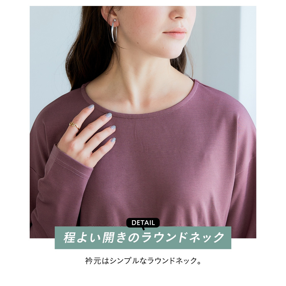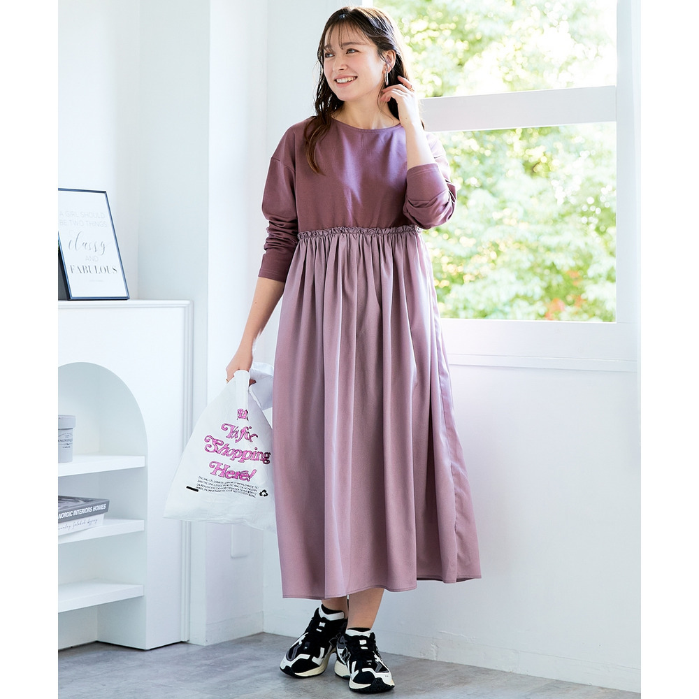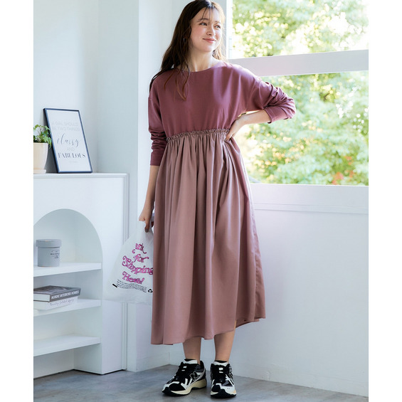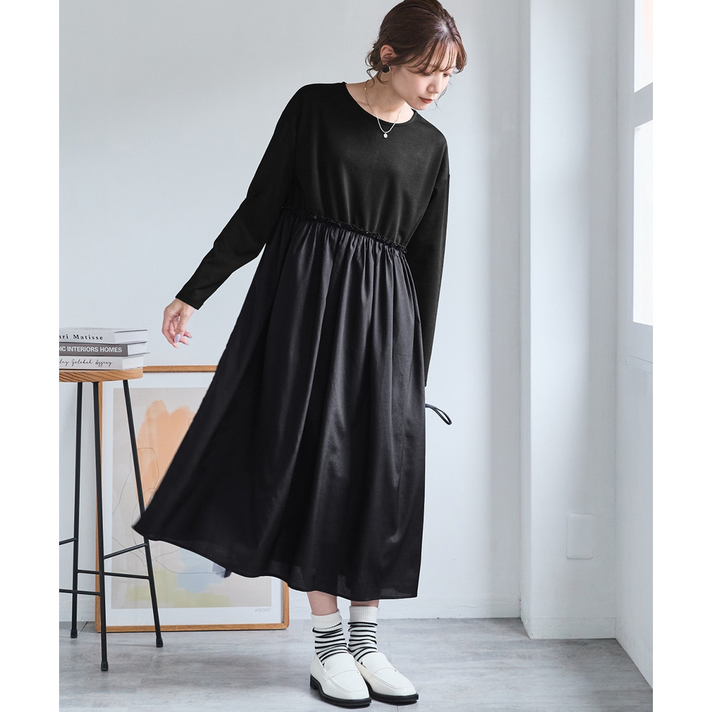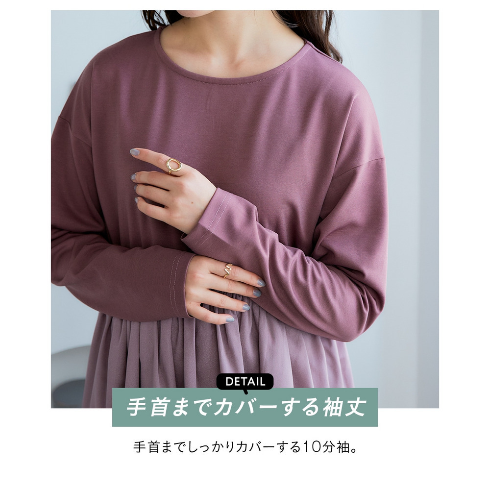上身頃は柔らかなカットソー素材、スカート部分は軽やかな布帛素材を使用。