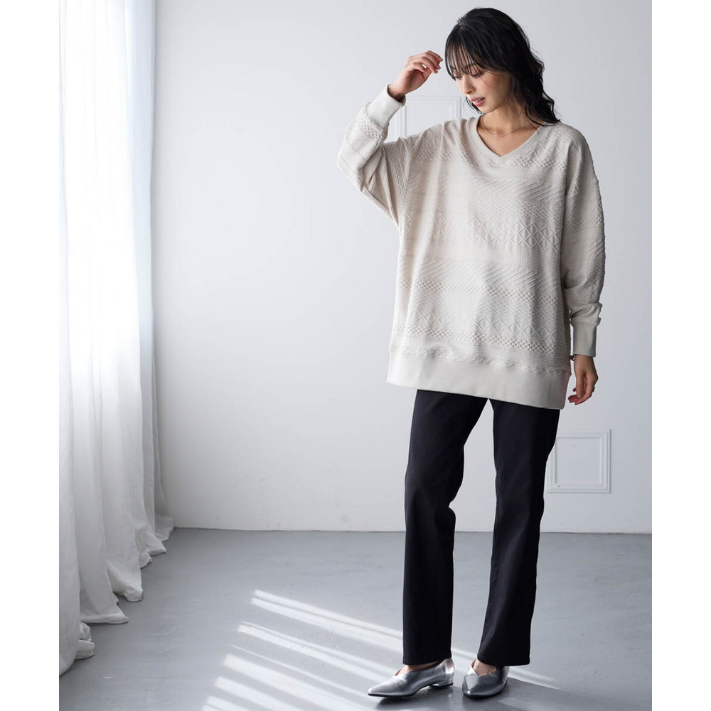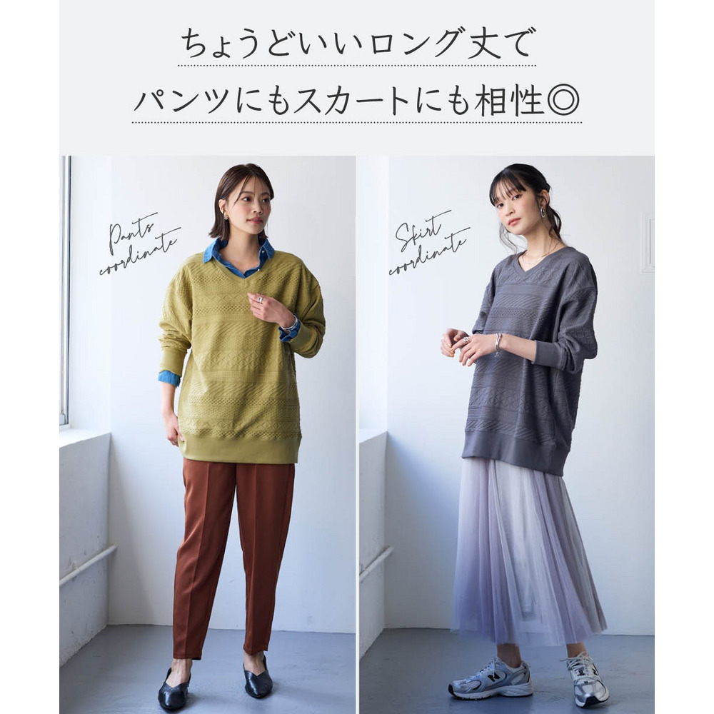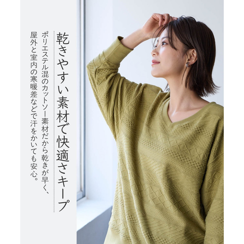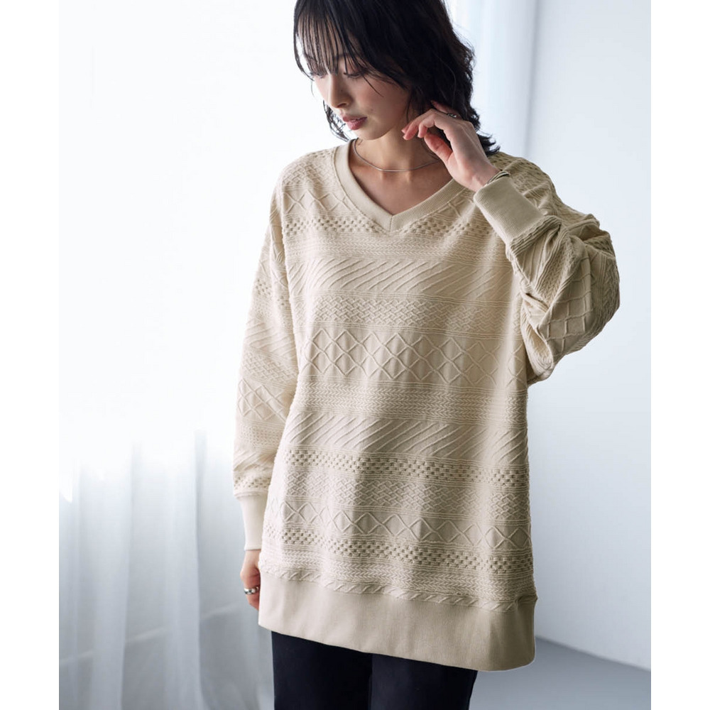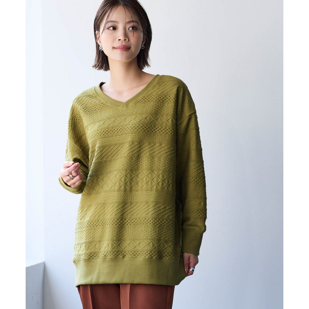 コットンブレンドニットライクジャガードVネックロング丈ゆるトレーナー 大きいサイズ