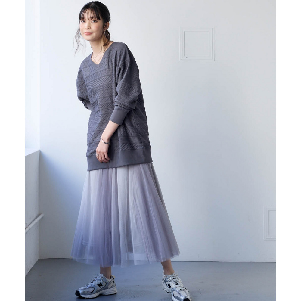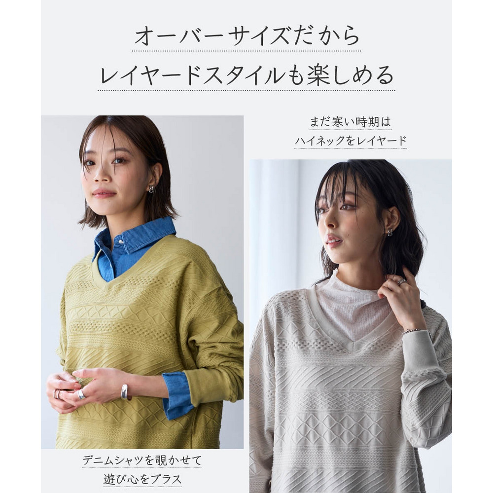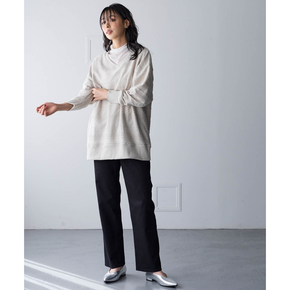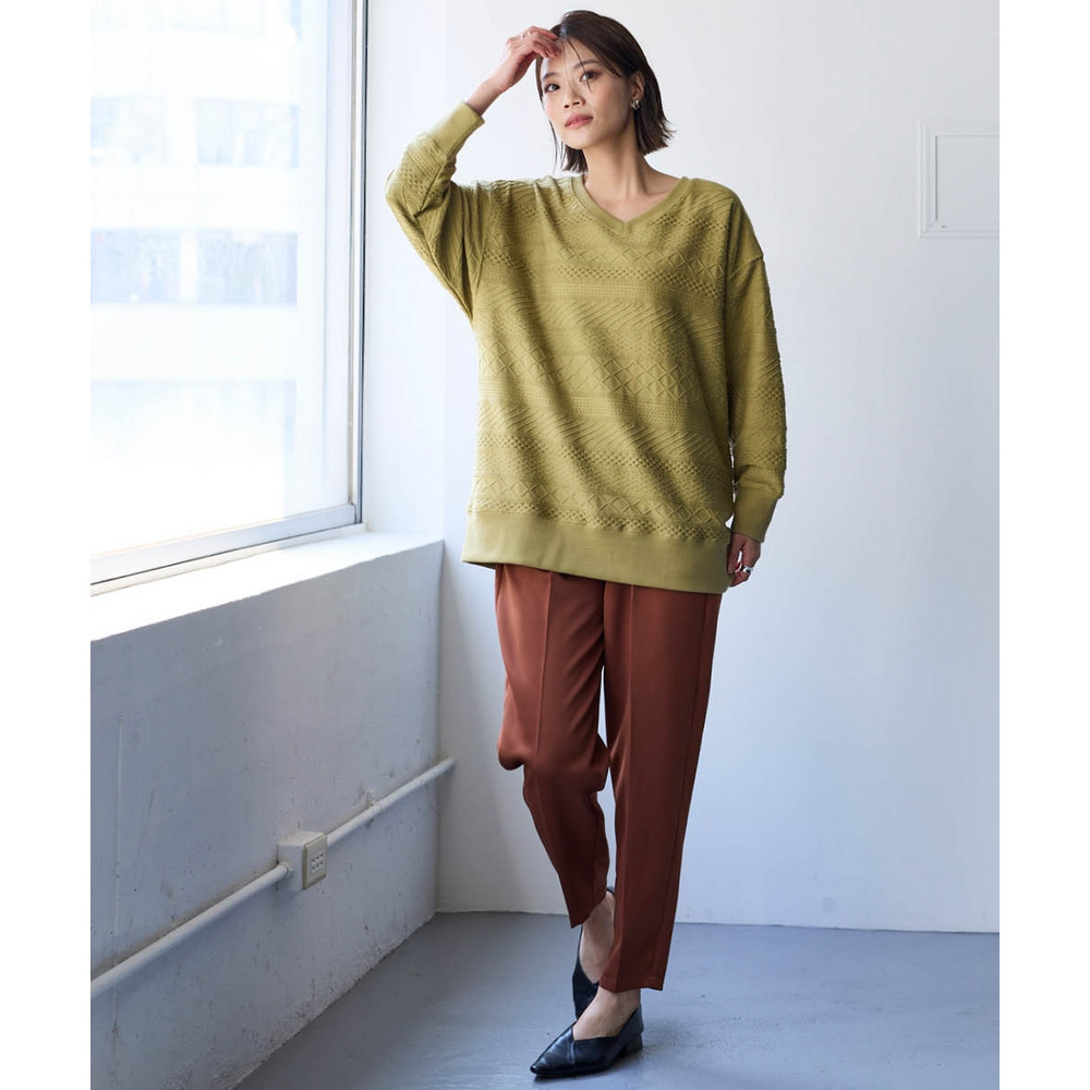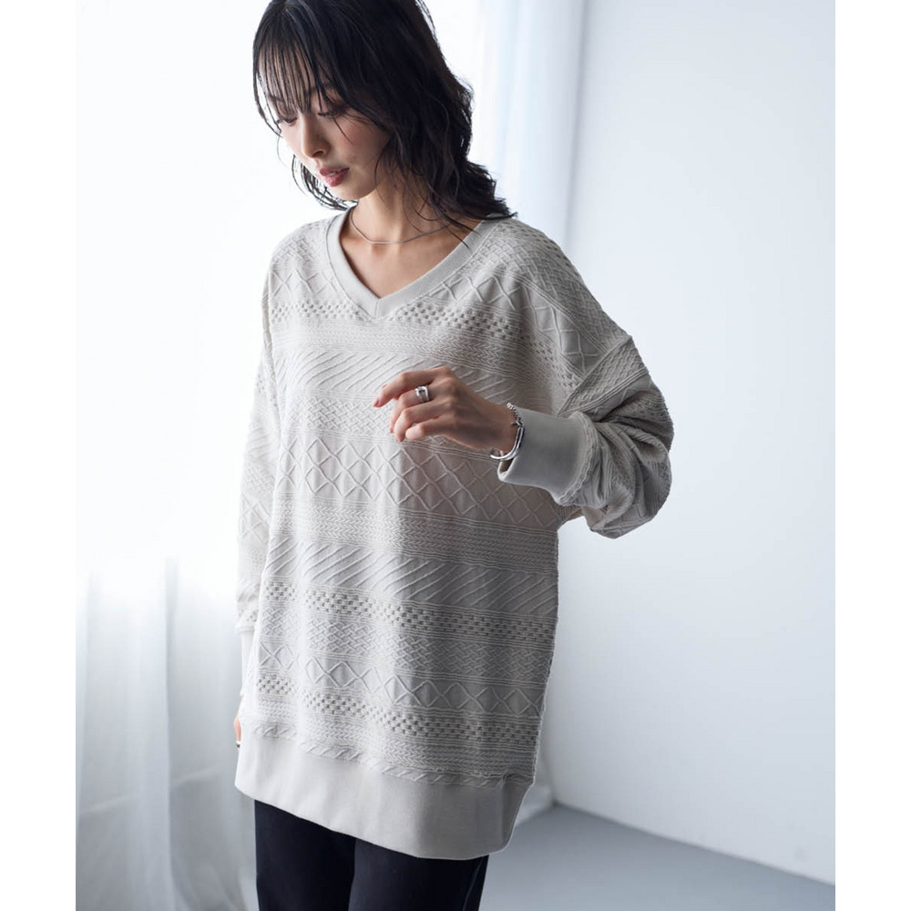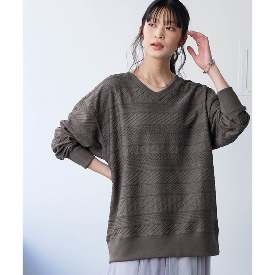 コットンブレンドニットライクジャガードVネックロング丈ゆるトレーナー 大きいサイズ