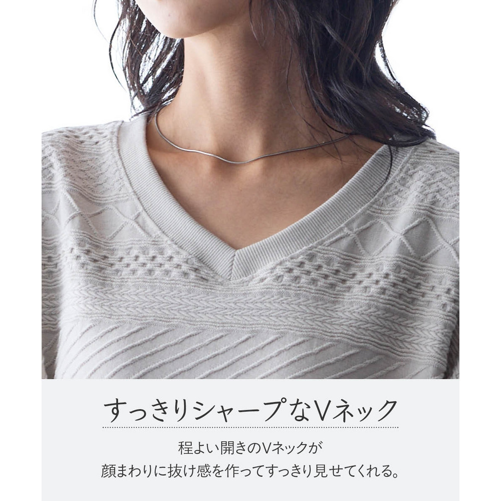 Vネックで顔周りをスッキリ見せてくれます。