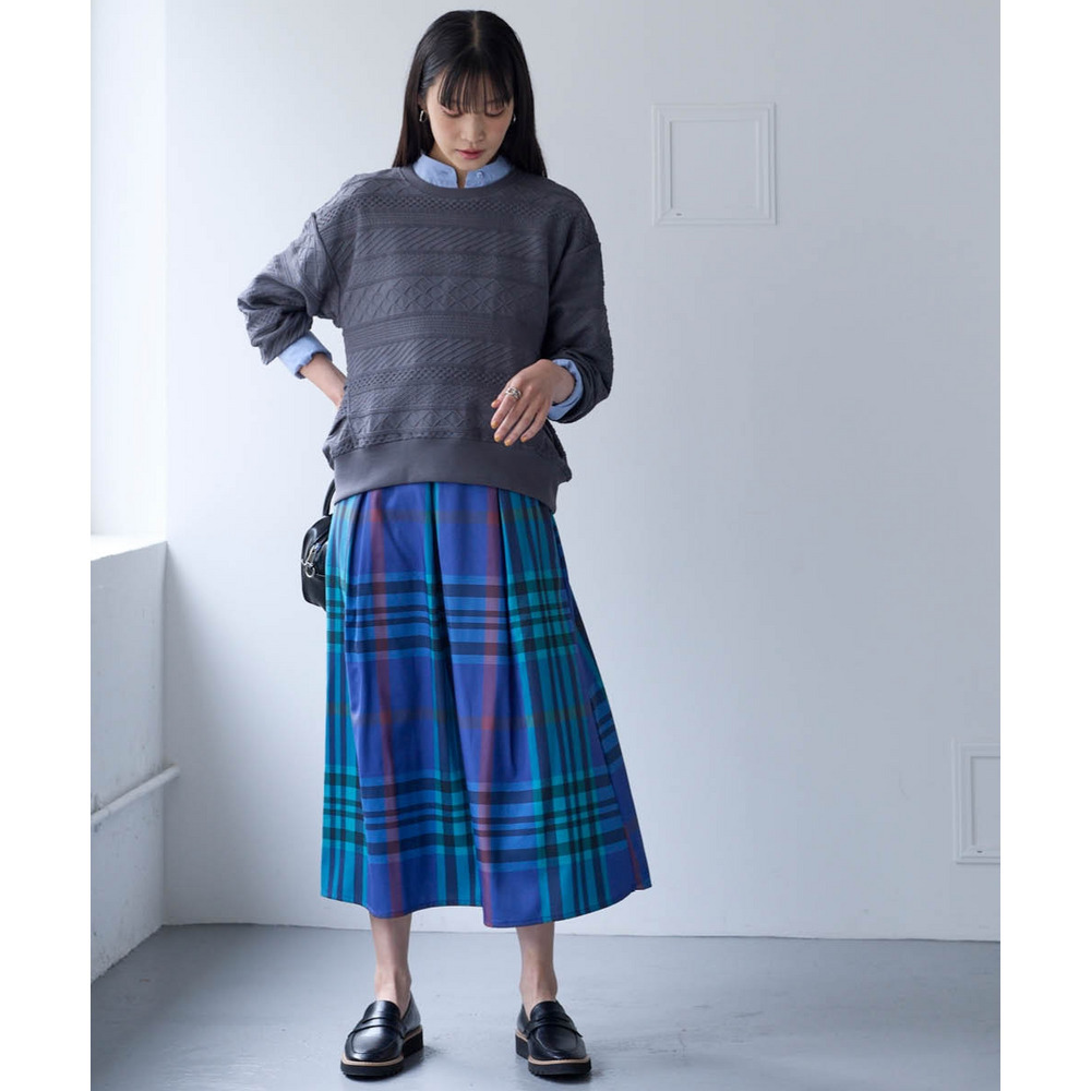 綿混素材で肌触りがよく、ほどよい厚みとハリ感で体型を拾いにくい素材です。
