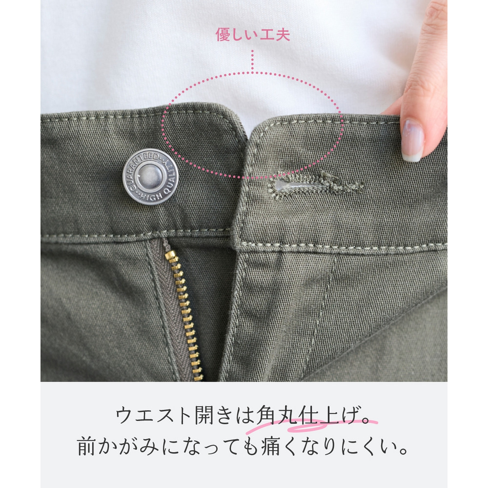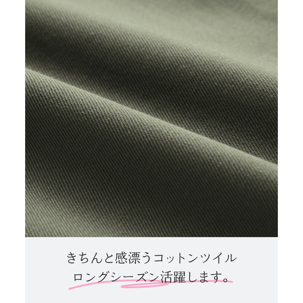 素材 品質=綿95%・ポリウレタン5% 前ボタン開き・前ファスナー  透け感:なし 伸縮性:あり 生地の厚み:普通 光沢感:なし 裏地:なし ポケット:両脇 ウエスト:後ゴム入 季節:春・秋向き シルエット:ゆったり