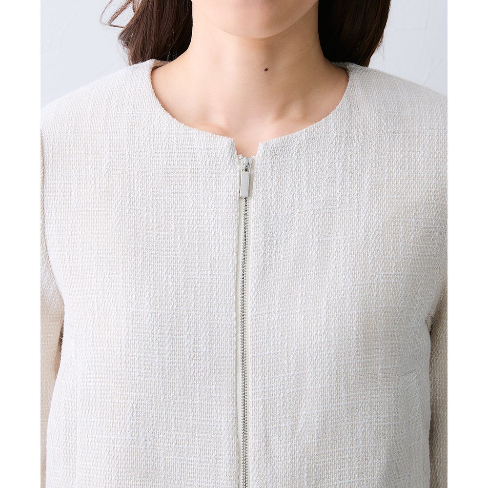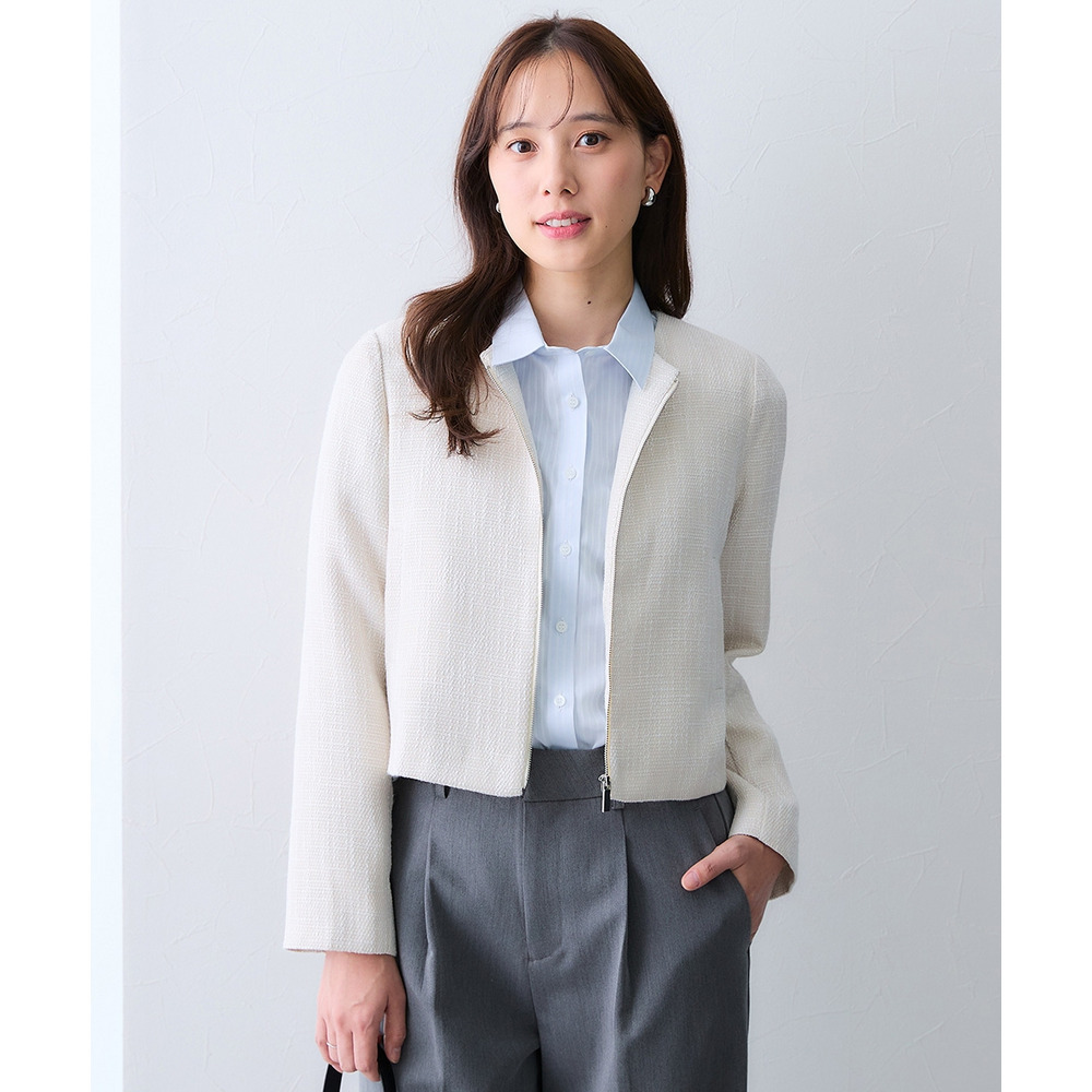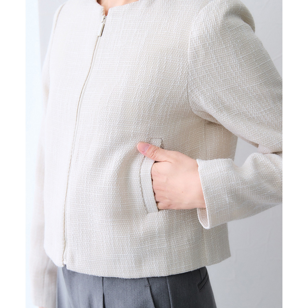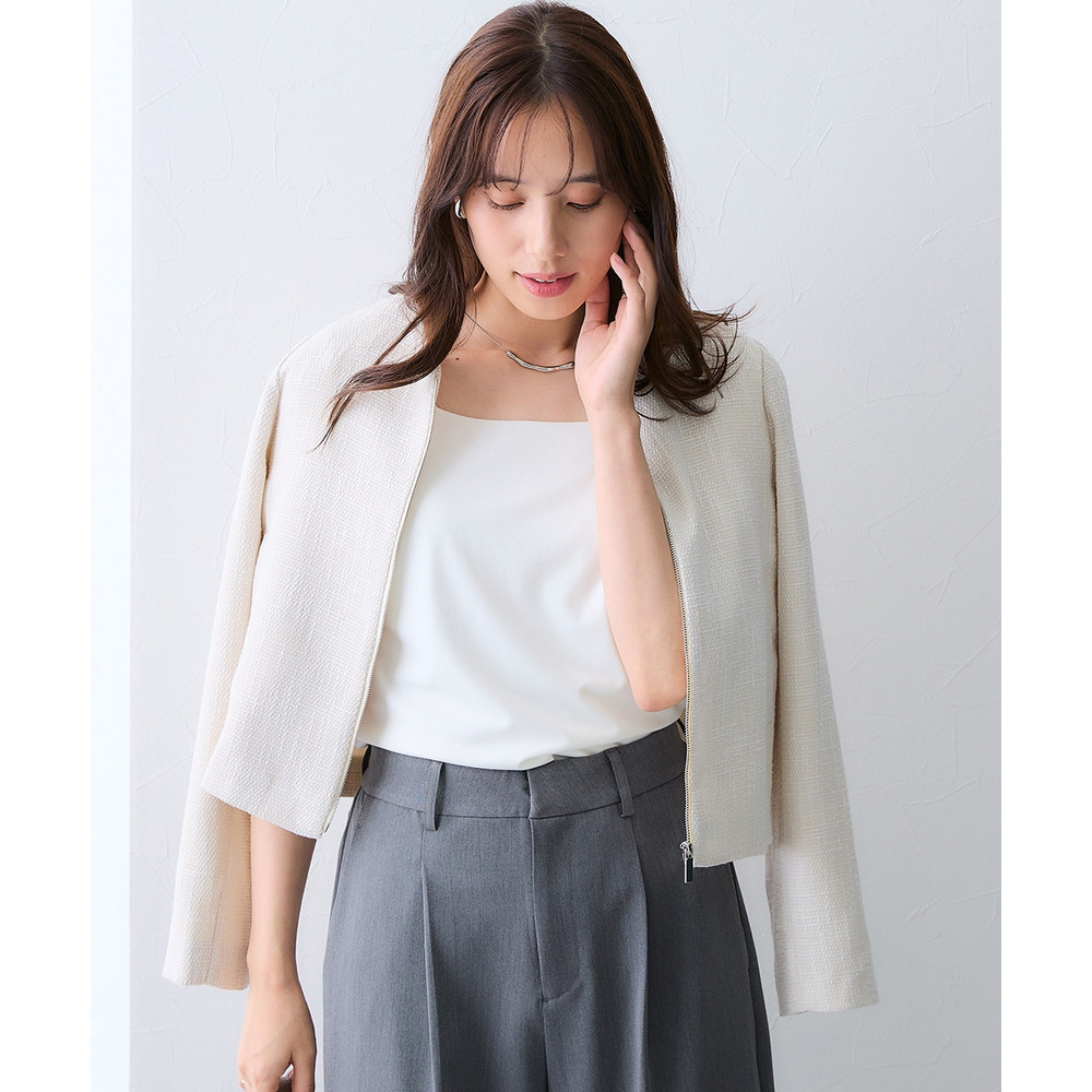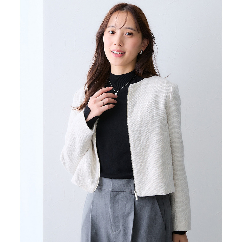 ボタンではなくジップ仕様を採用することで、コンサバになりすぎず、程よくトレンド感のある洗練された印象に仕上げています。