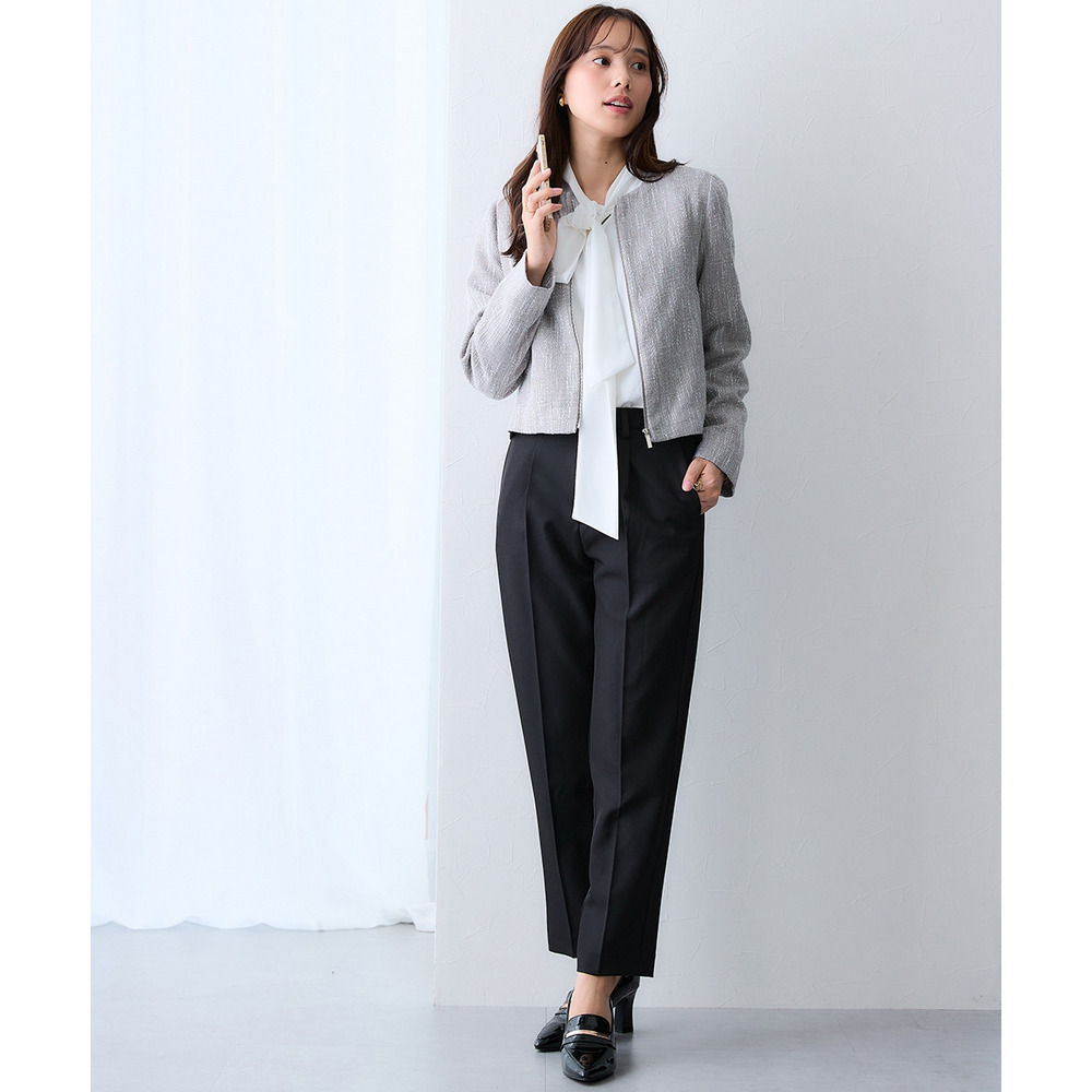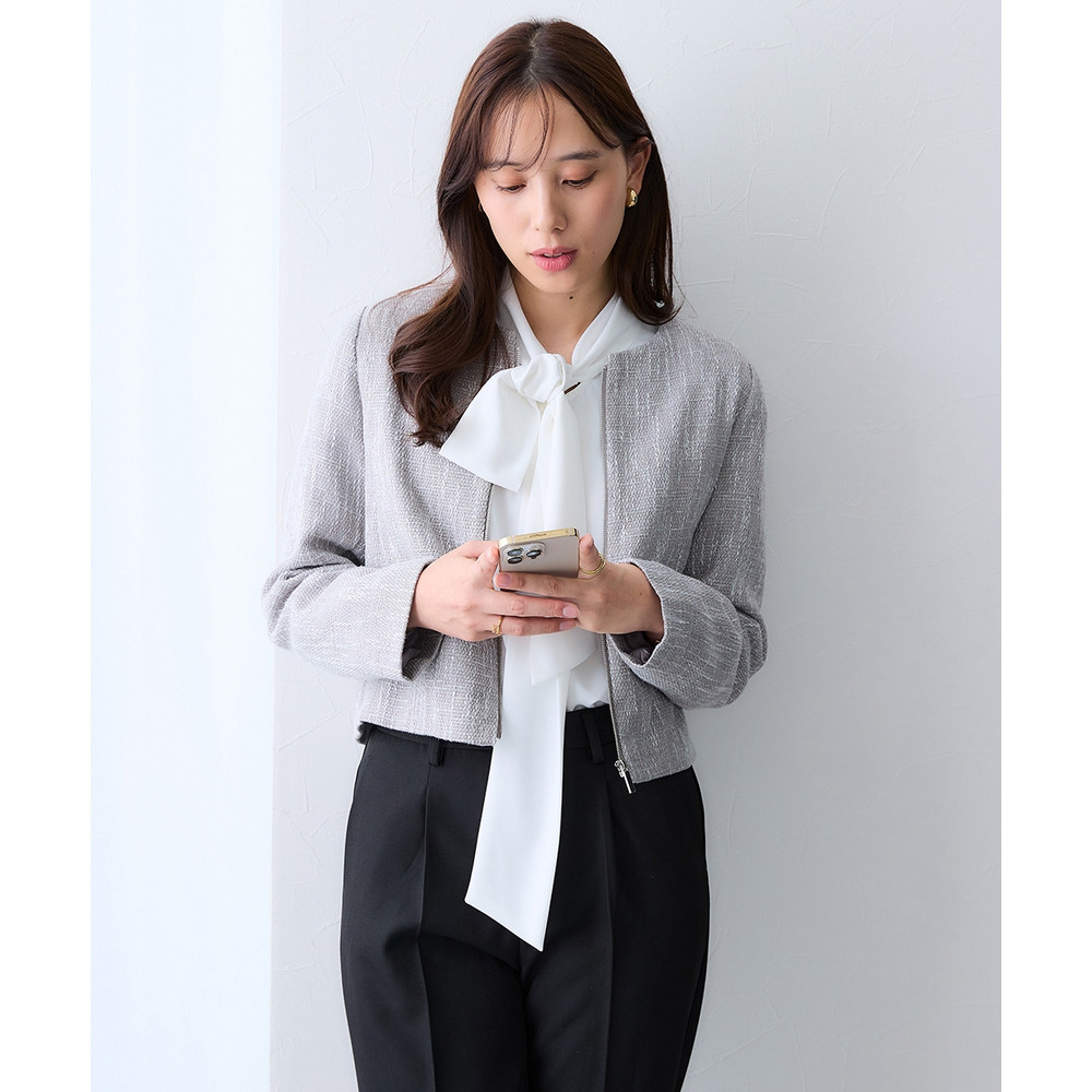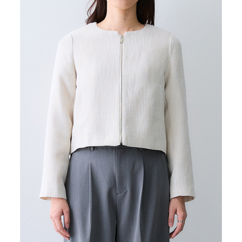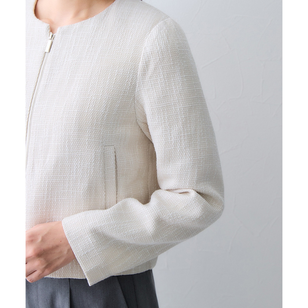 ボタンではなくジップ仕様を採用することで、コンサバになりすぎず、程よくトレンド感のある洗練された印象に仕上げています。
