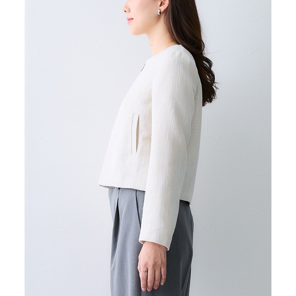 首元すっきりのノーカラーデザインが顔周りを明るく見せ、ブラウスやフリルとのレイヤードが美しく映えます。