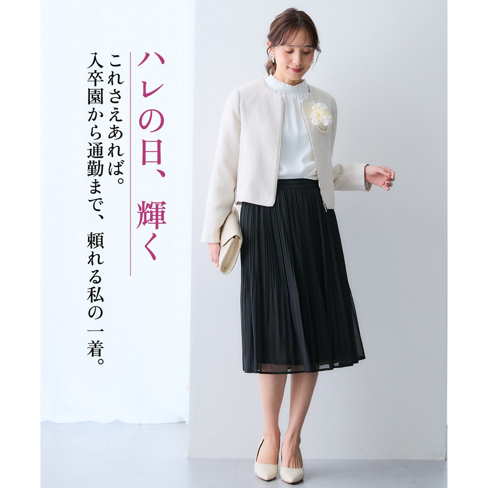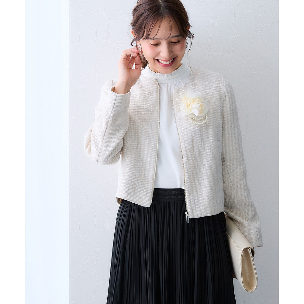 【Ceremony Style】 コサージュやパールを添え、プリーツスカートと合わせれば、入学式や結婚式など華やかな席にぴったりの品格ある装いに。