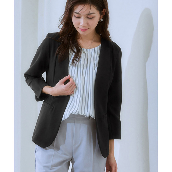 • 洗えるストレッチダブルクロス7分袖ノーカラージャケット(ストレッチ・しわになりにくい・UVカット・洗濯機OK) 大きいサイズ24