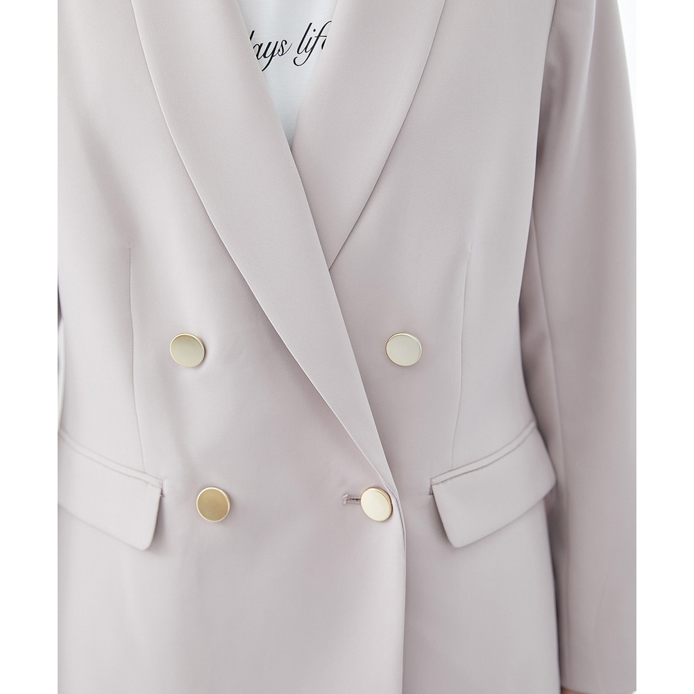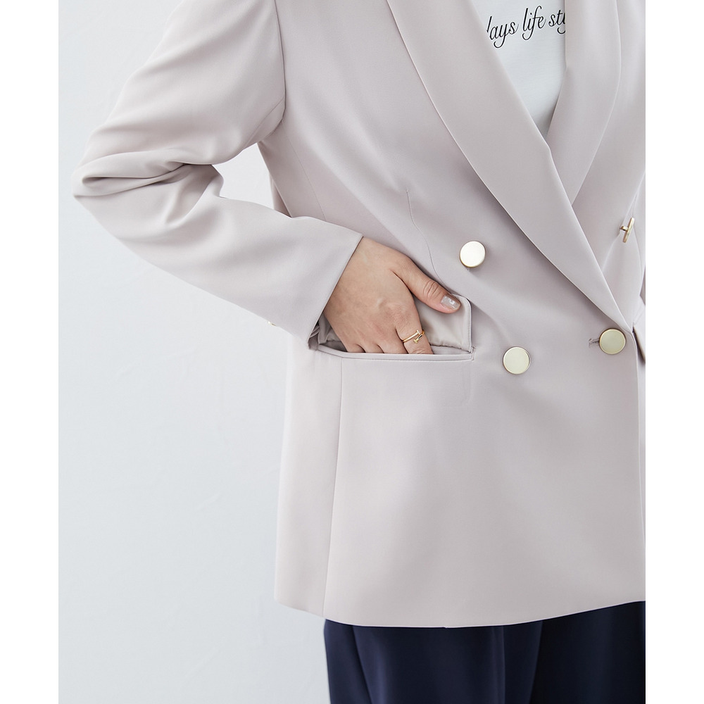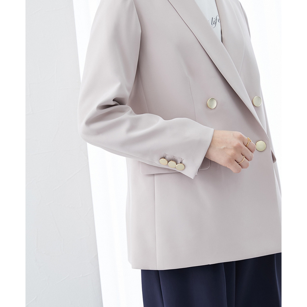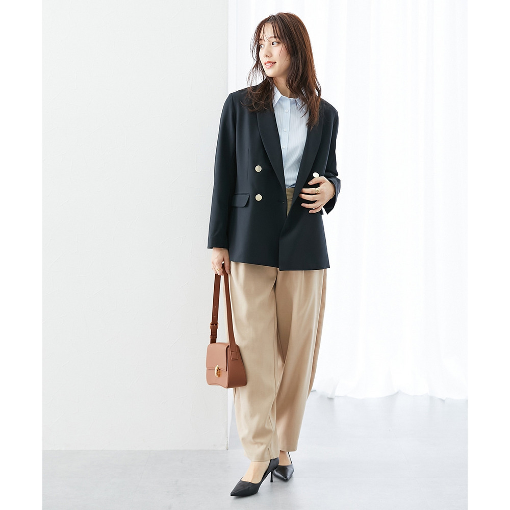 クラシックなダブルボタンとピークドカラーのデザインが、装いに程よい重厚感と品格を与えます。