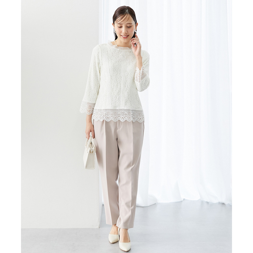 【Ceremony Style】 同素材のジャケットを合わせ、インナーに華やかなレースブラウスをプラス。