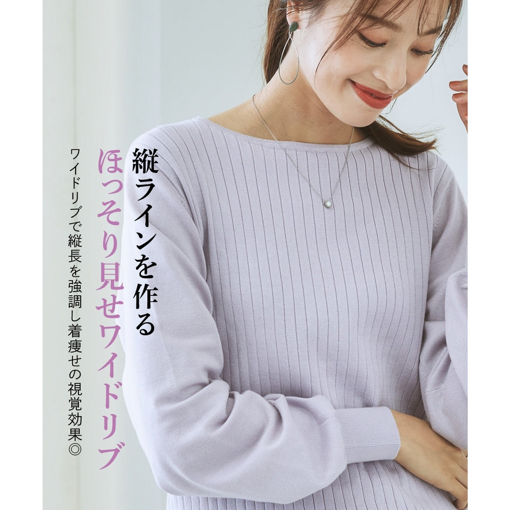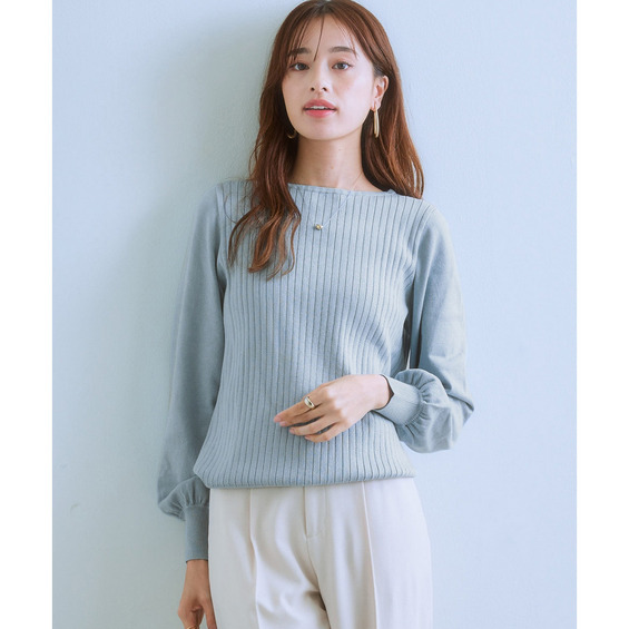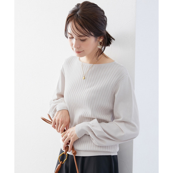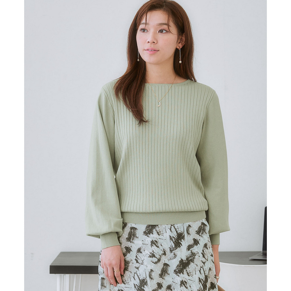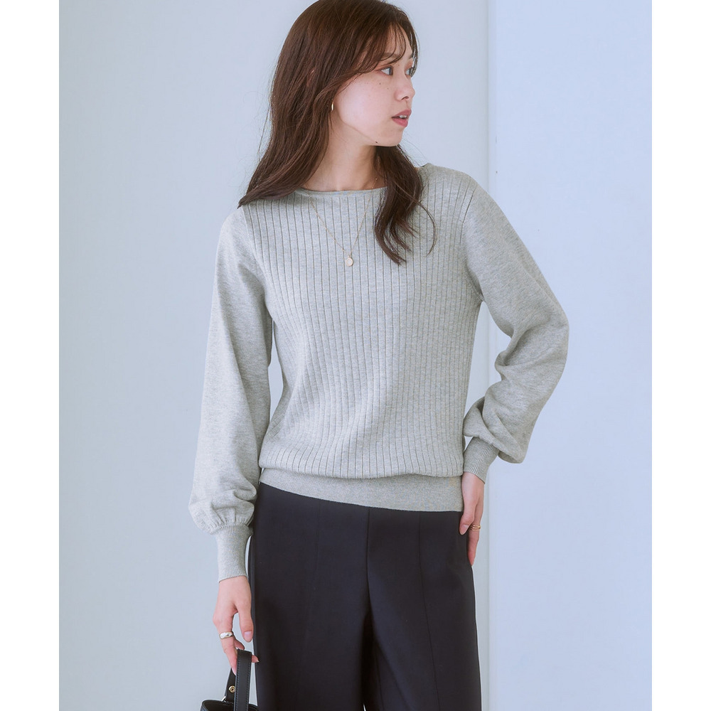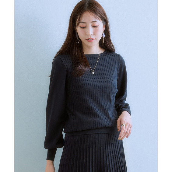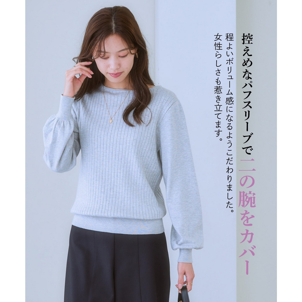 体の線を拾い過ぎないのにすっきり見せてくれるワイドリブとボリューム袖が人気のデザイン