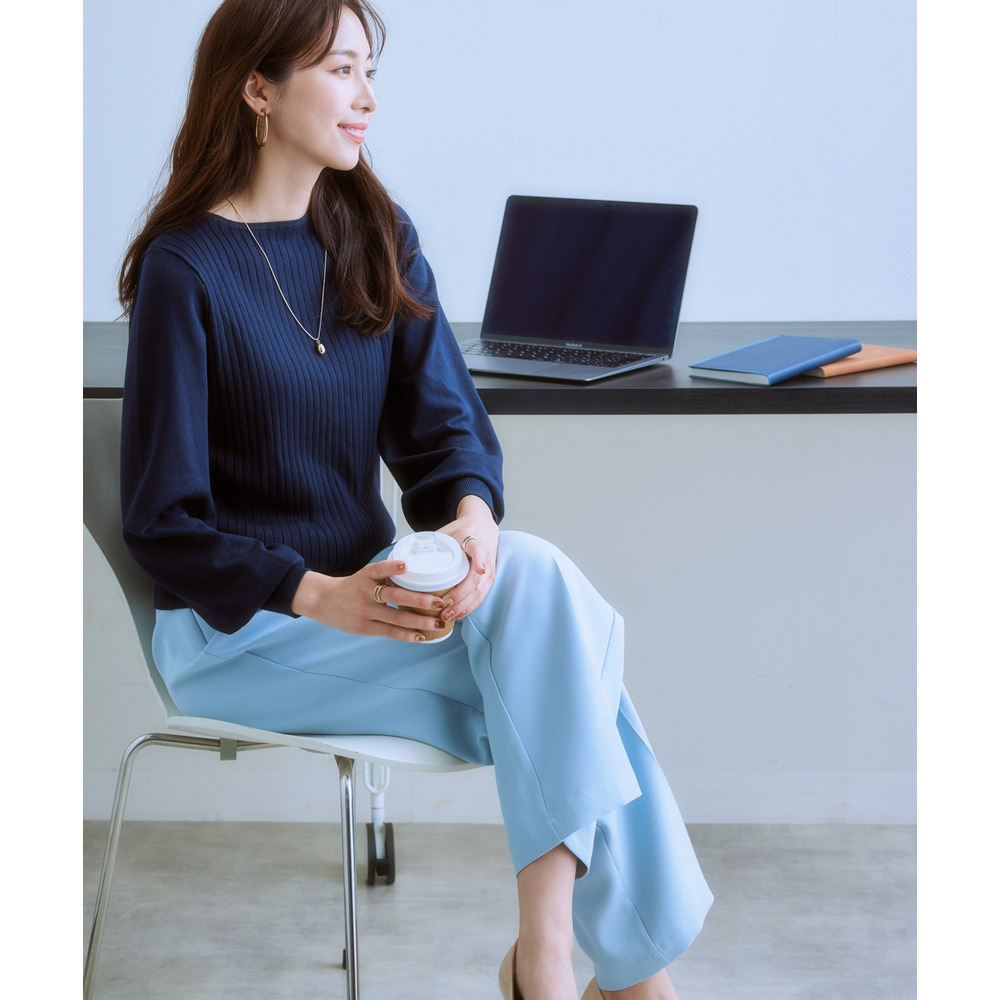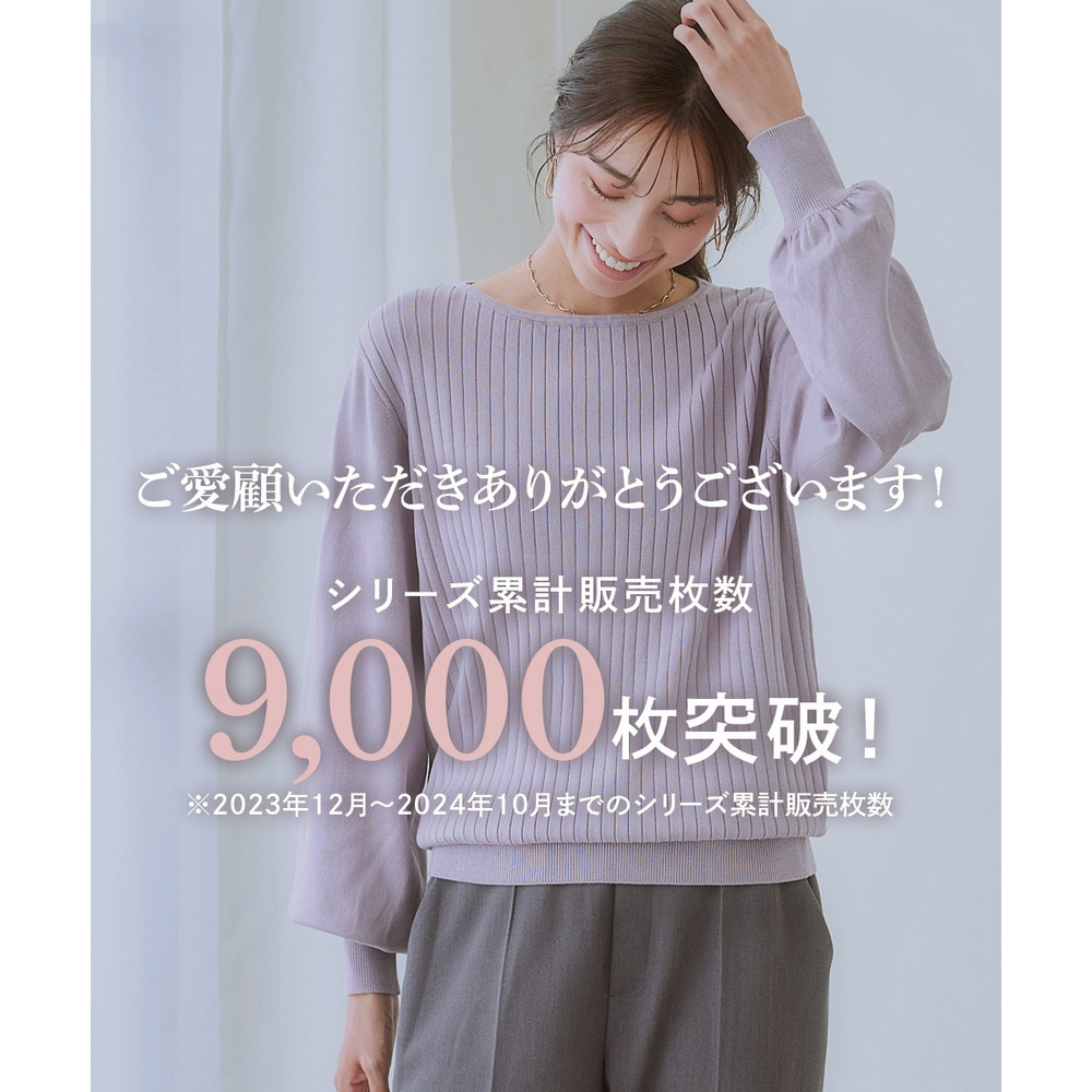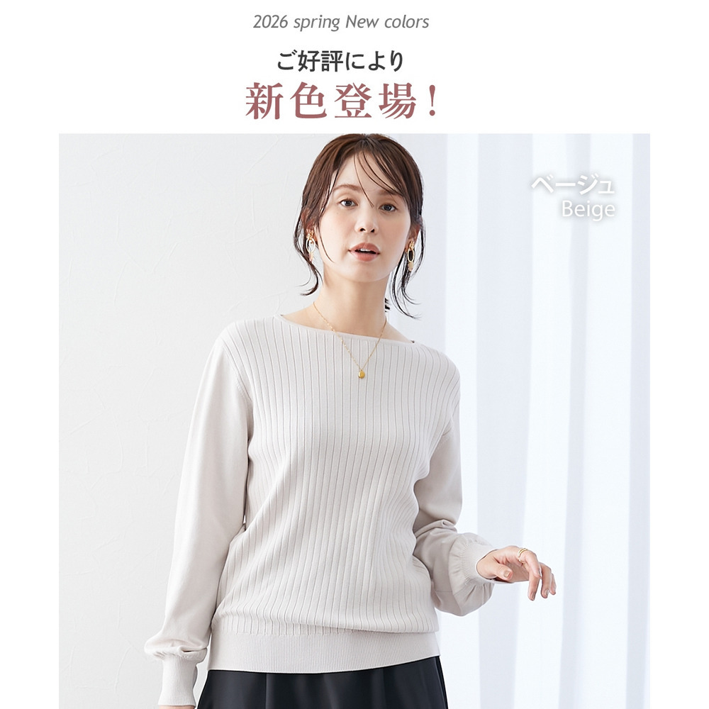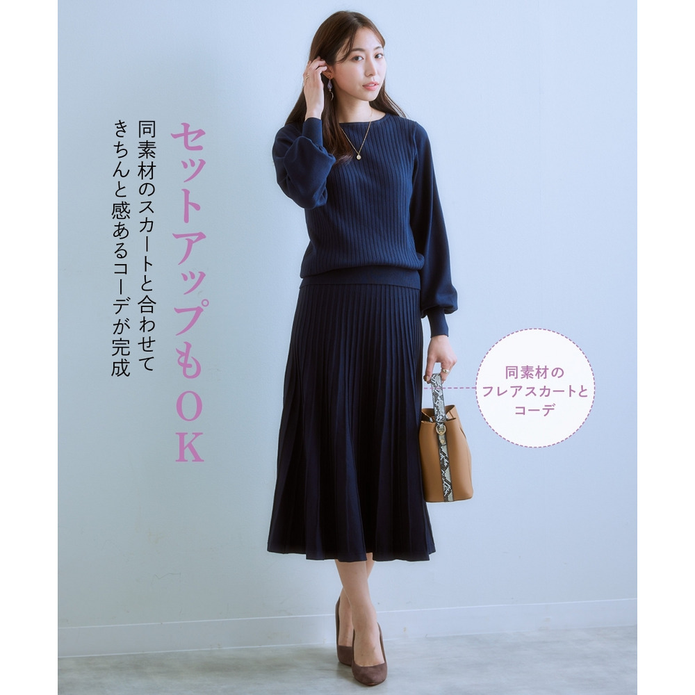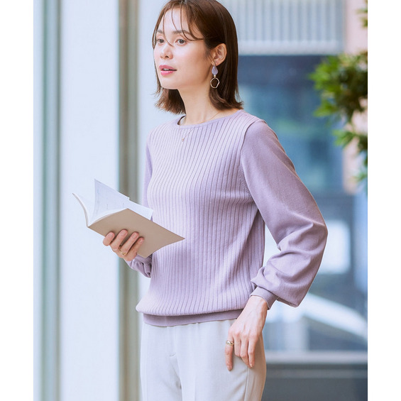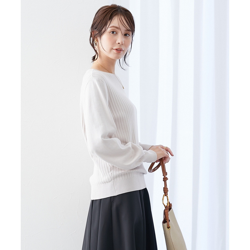 体の線を拾い過ぎないのにすっきり見せてくれるワイドリブとボリューム袖が人気のデザイン