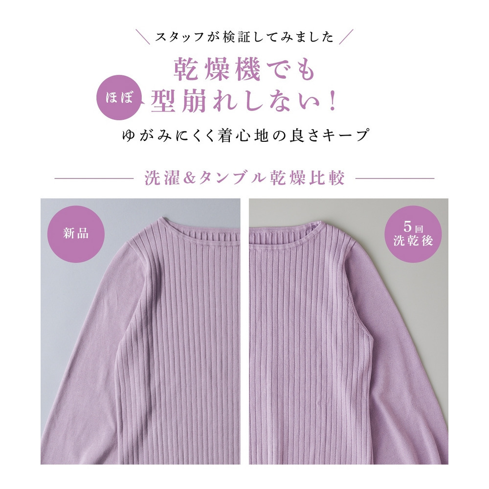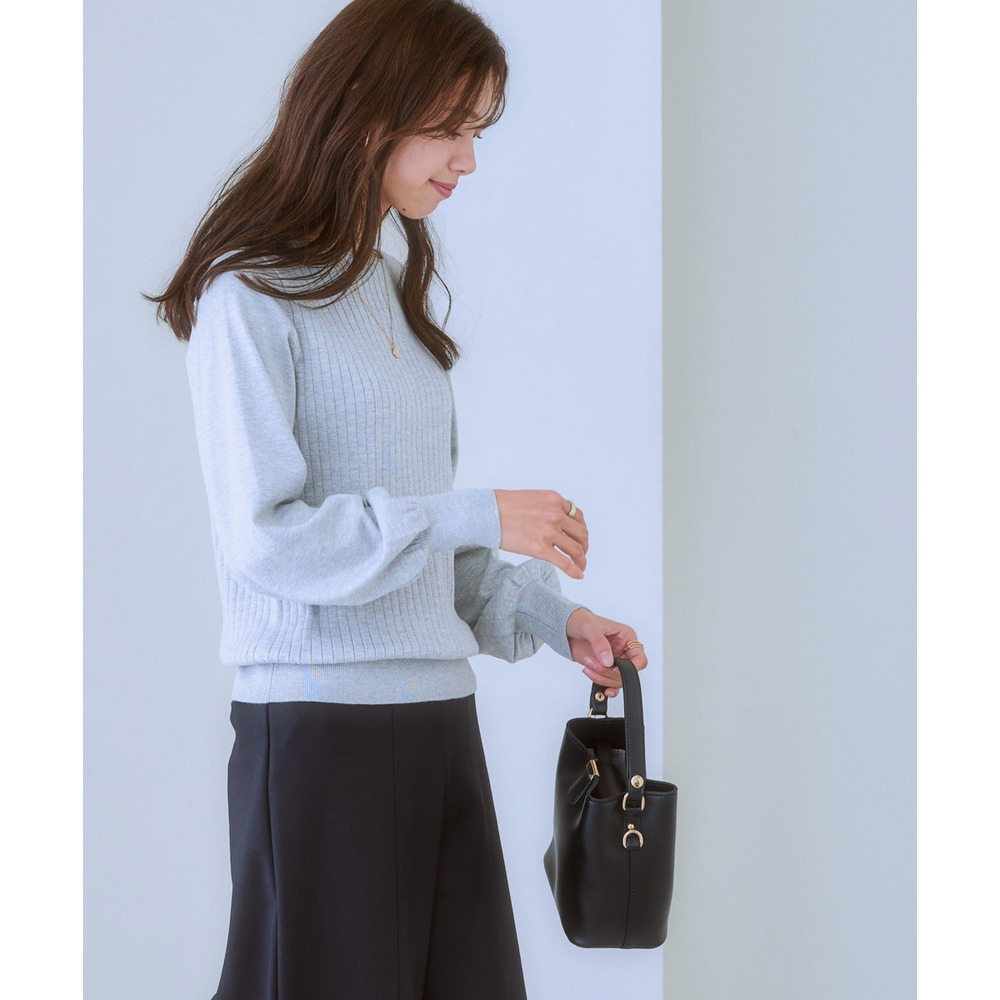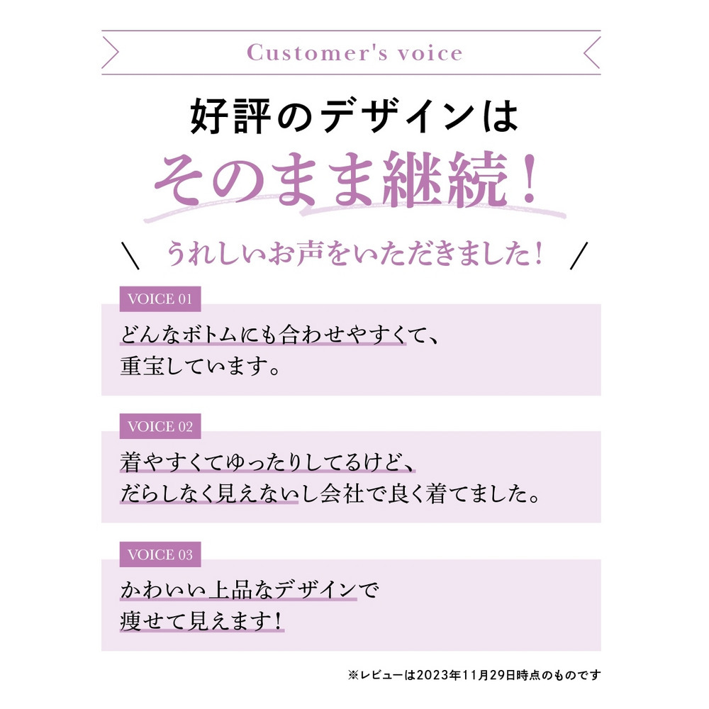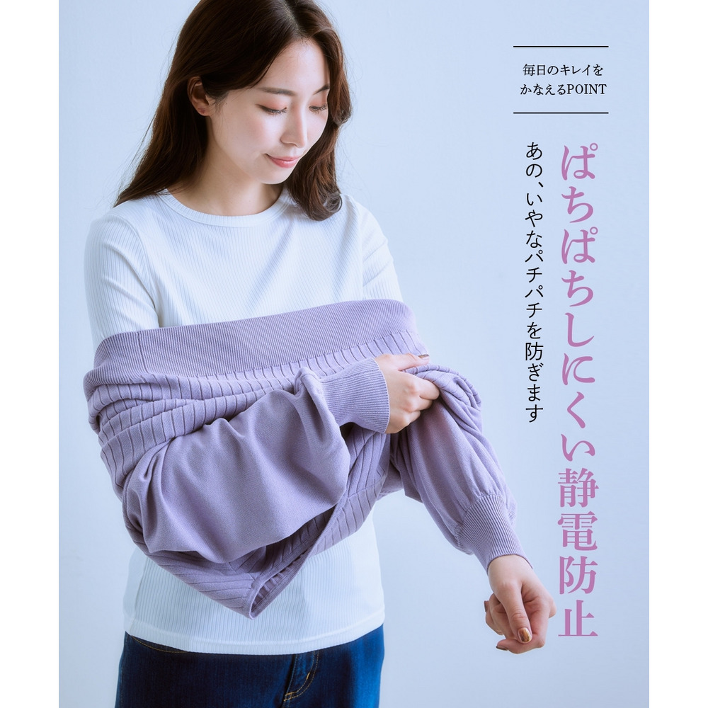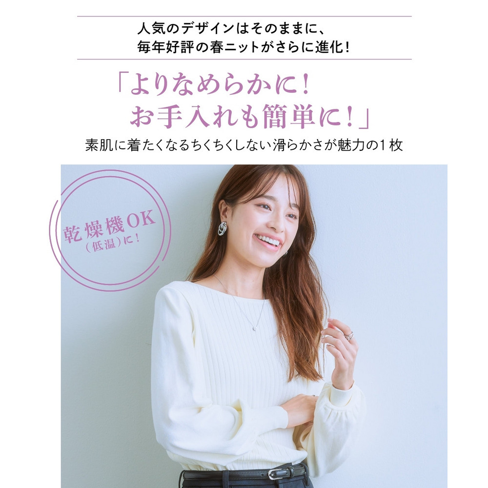 体の線を拾い過ぎないのにすっきり見せてくれるワイドリブとボリューム袖が人気のデザイン