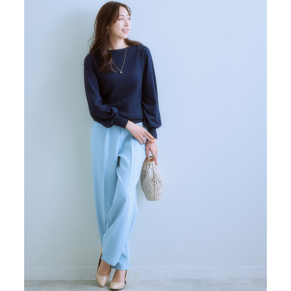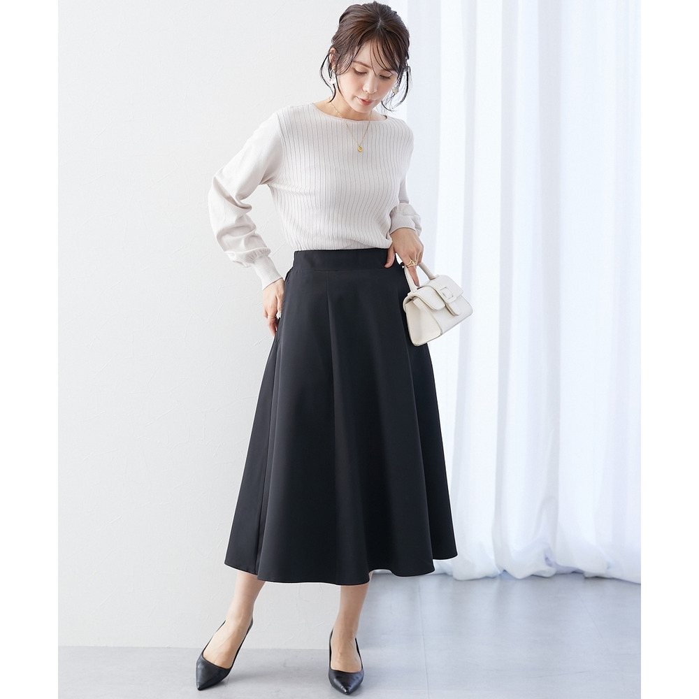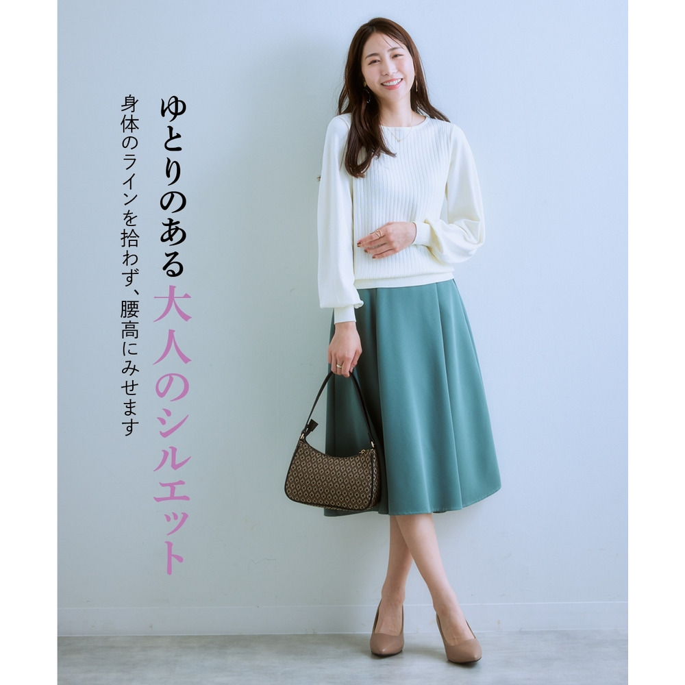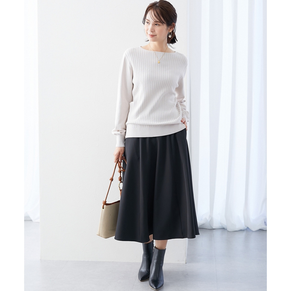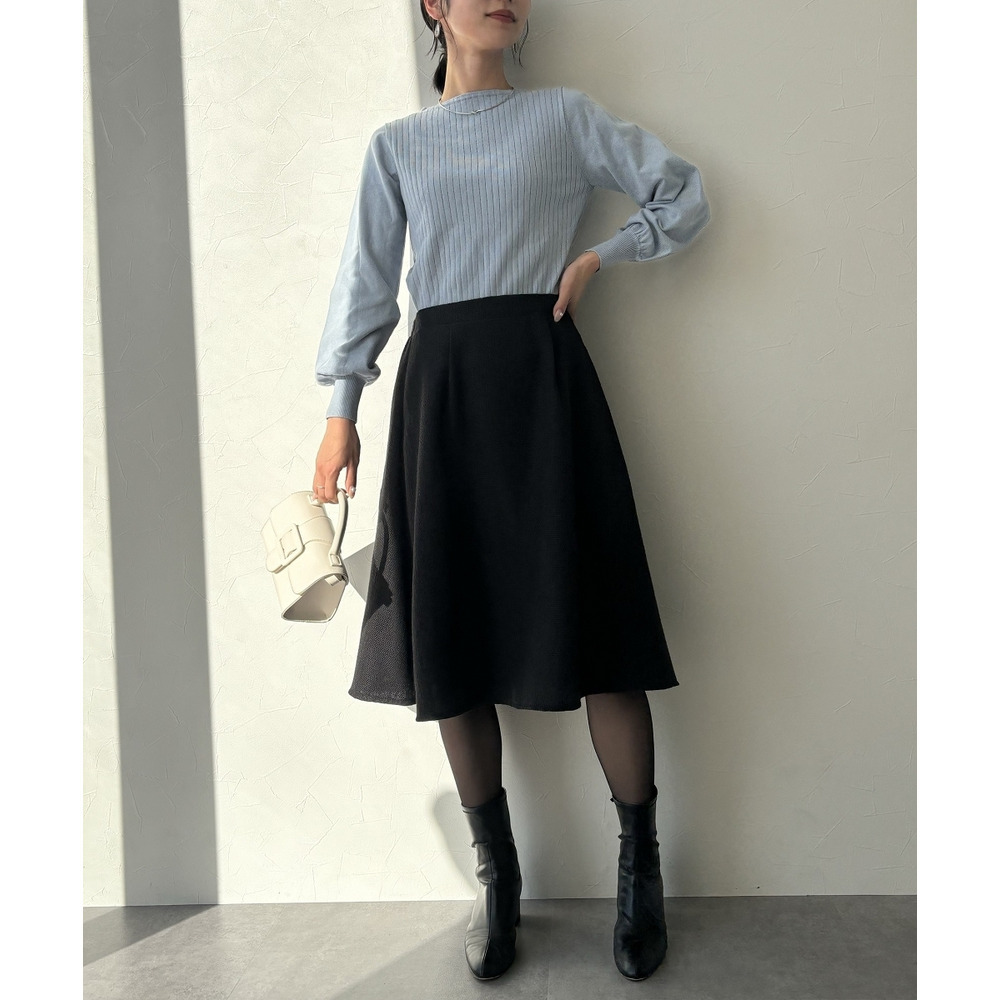 広がらずすっきり見せるデザインなのでフレアスカートやワイドパンツなどボリューム感のあるシルエットのボトム合わせがおすすめです