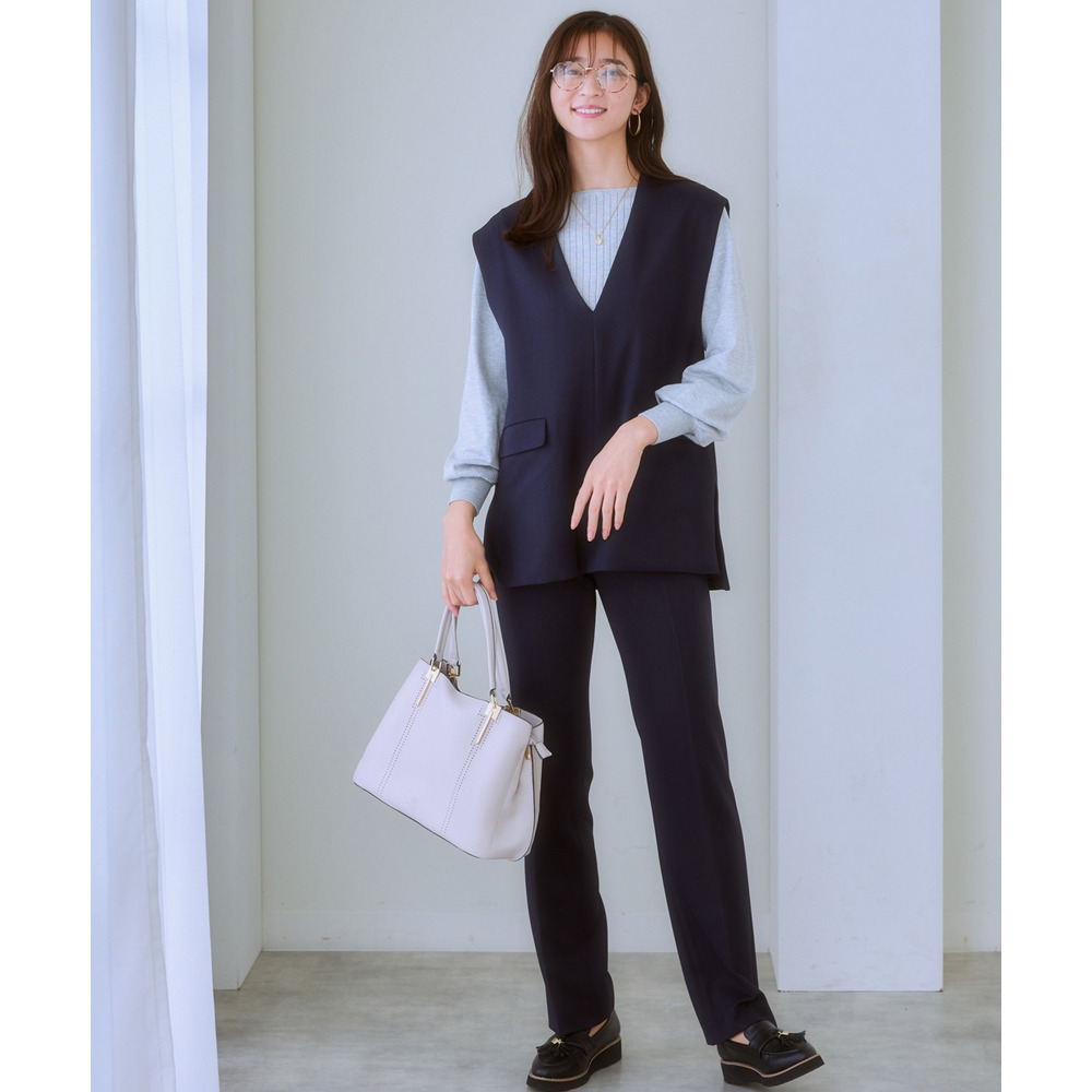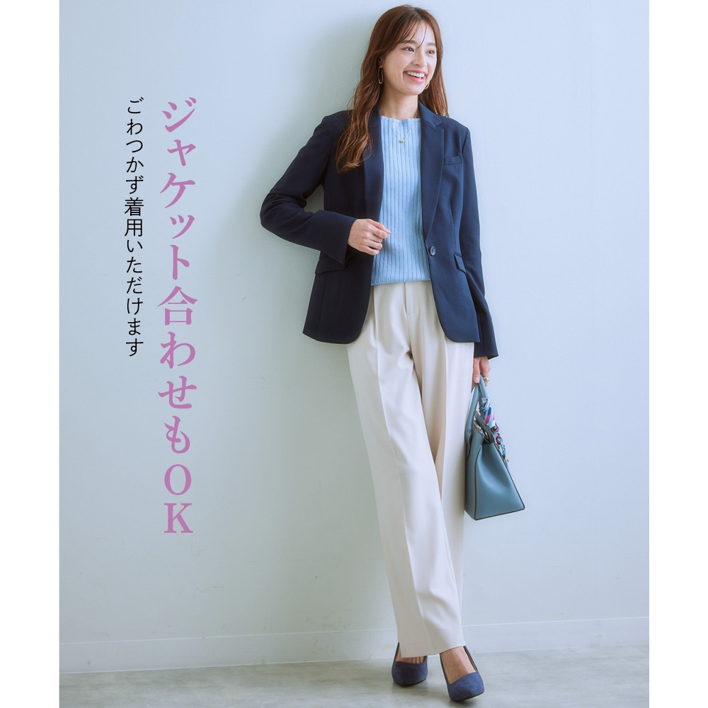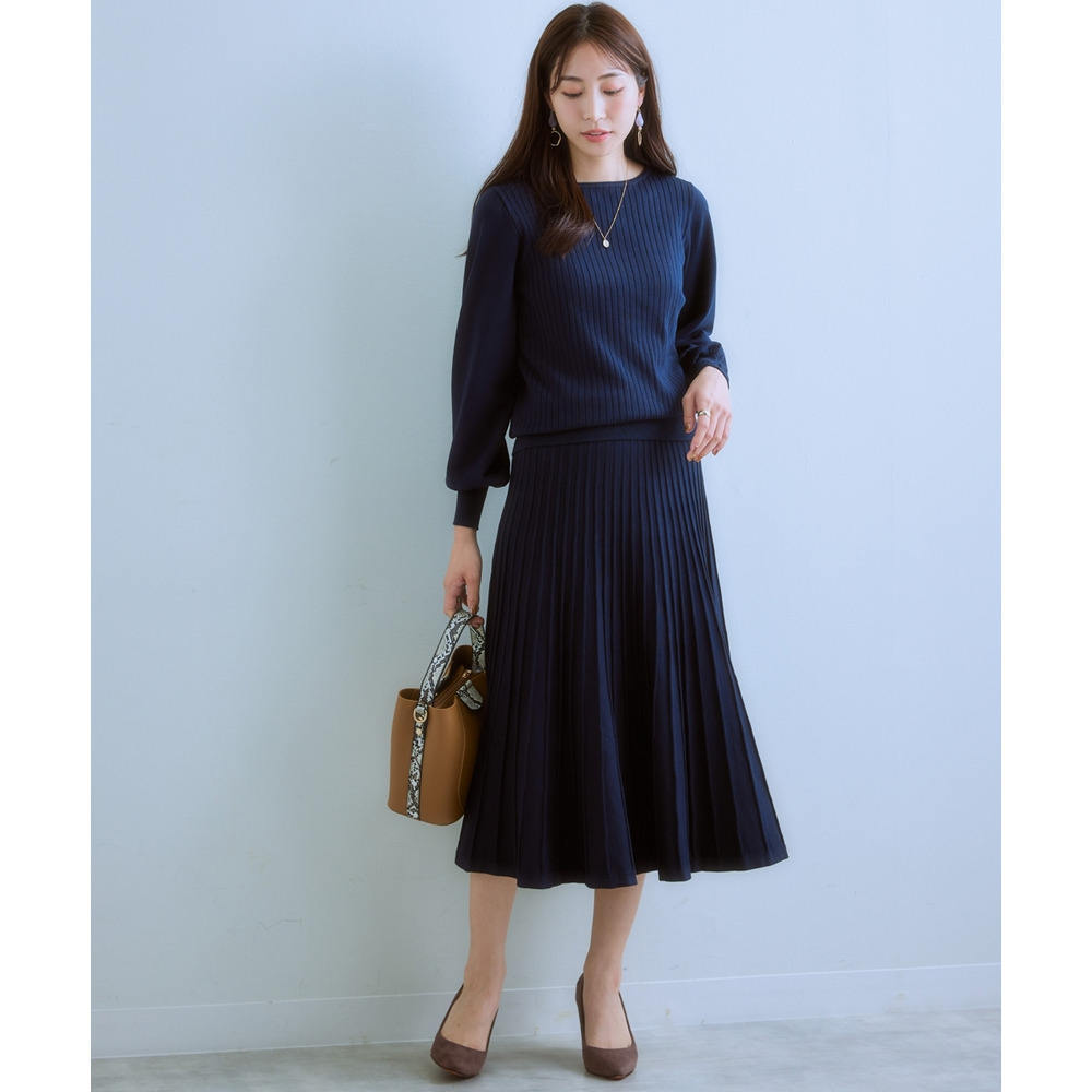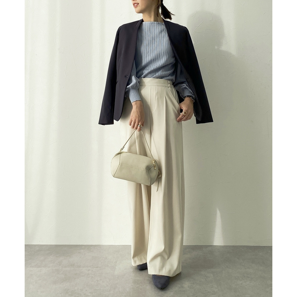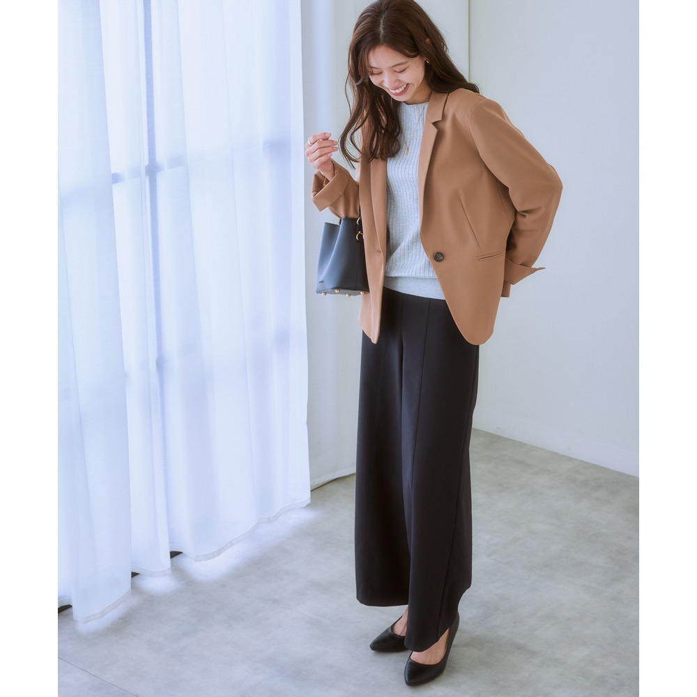 広がらずすっきり見せるデザインなのでフレアスカートやワイドパンツなどボリューム感のあるシルエットのボトム合わせがおすすめです