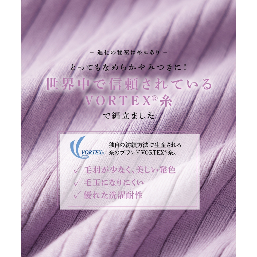 毛羽が少なく美しい表面感と発色が特徴で、ちくちくしにくいので素肌に一枚でも着用できるニットです。