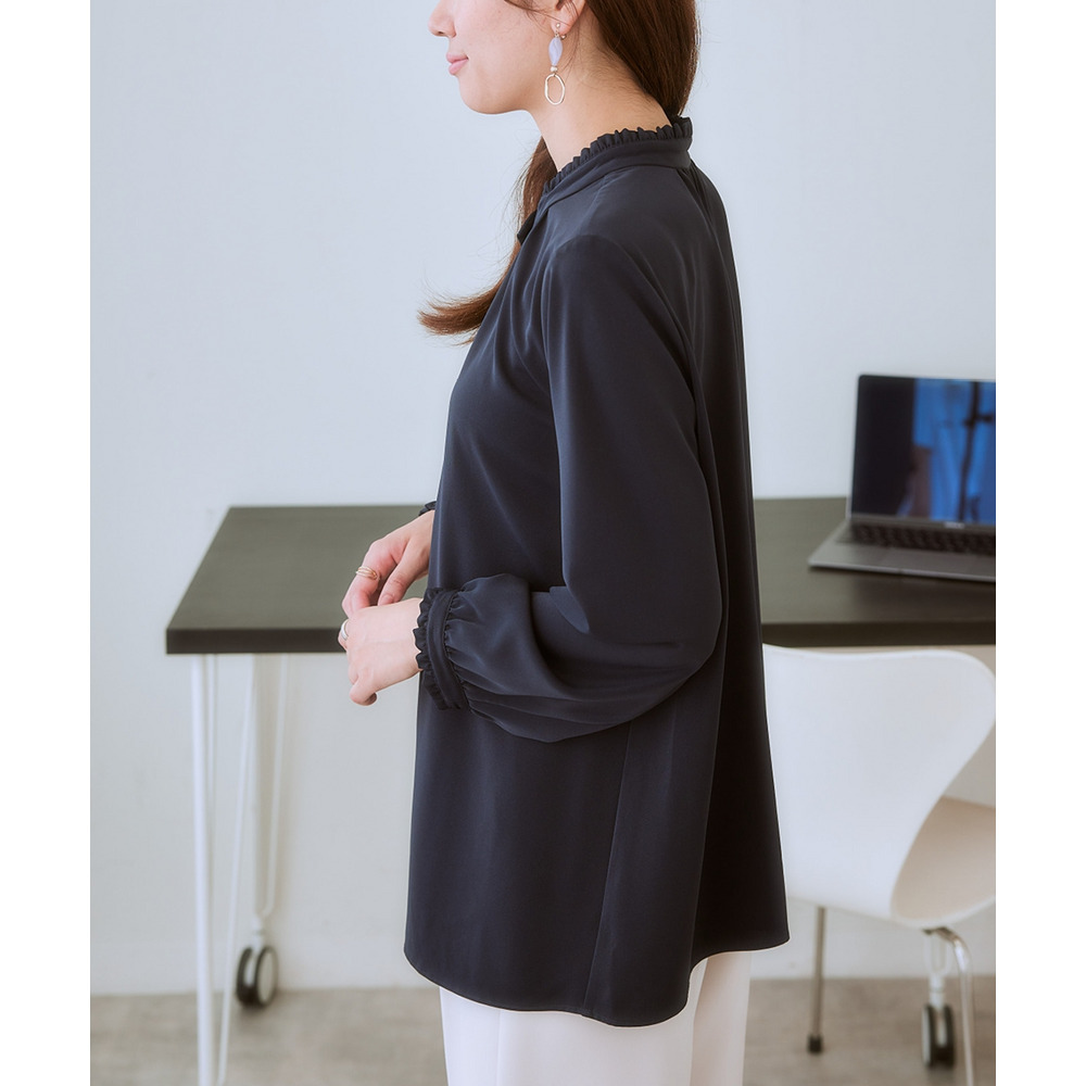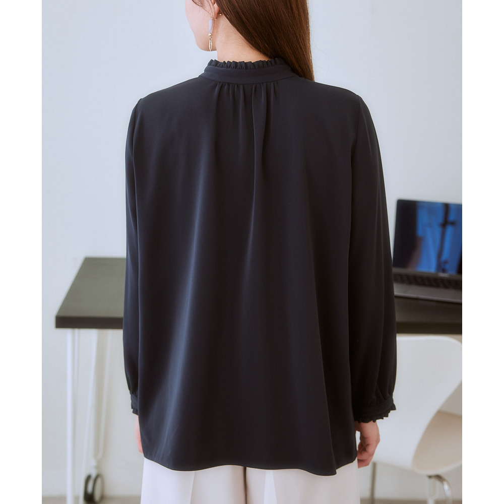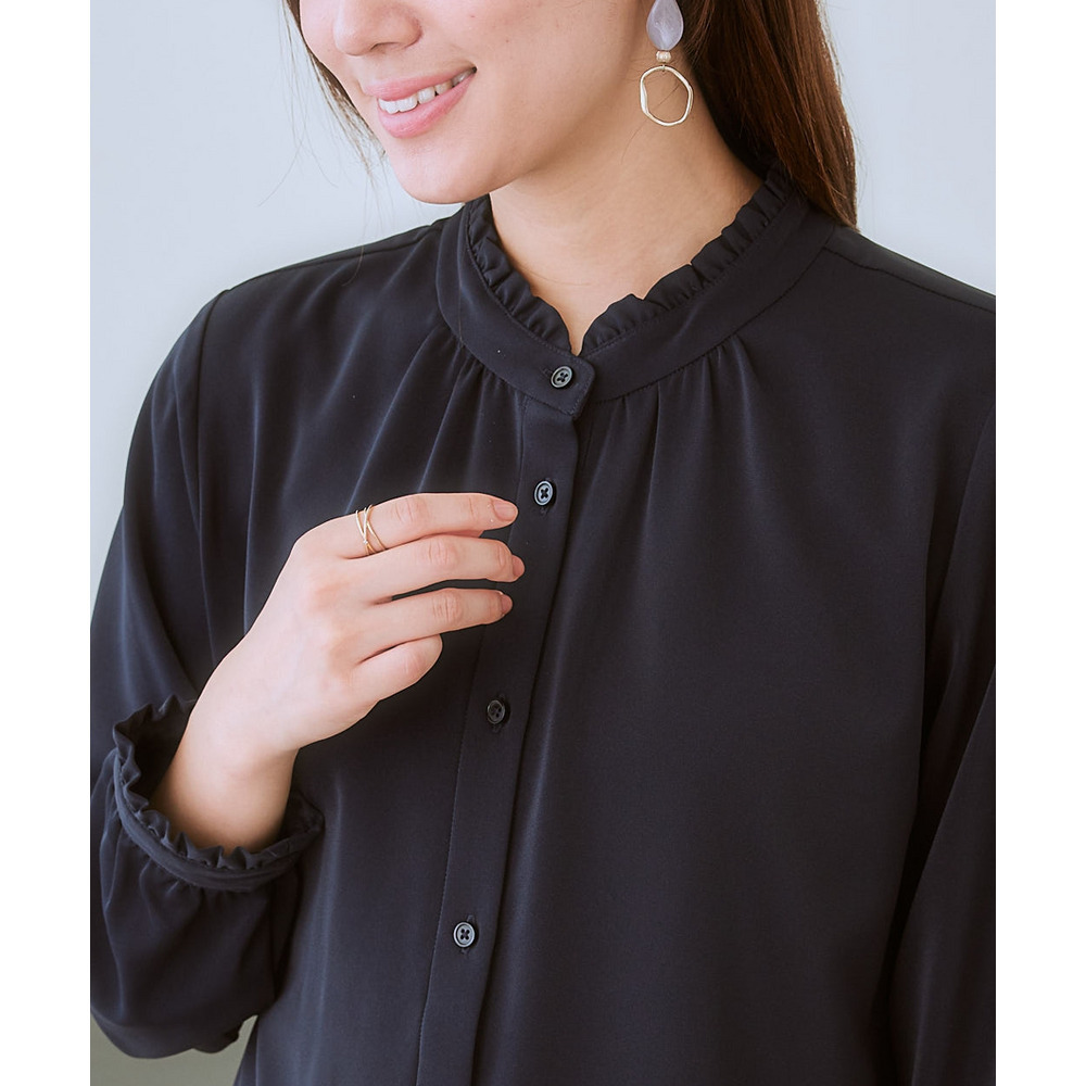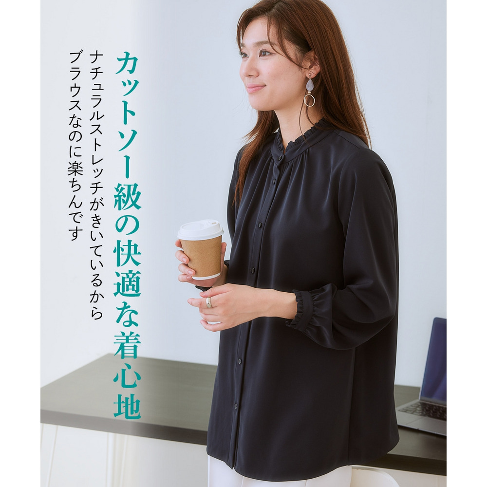 ストレッチパウダーサテン前後2WAYスタンドフリルブラウス(しわになりにくい・速乾・洗濯機OK・UVカット) 大きいサイズ