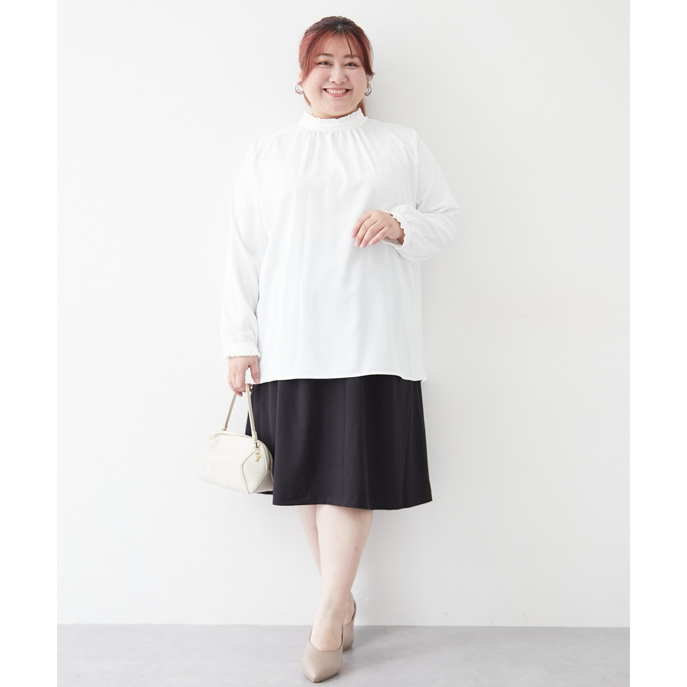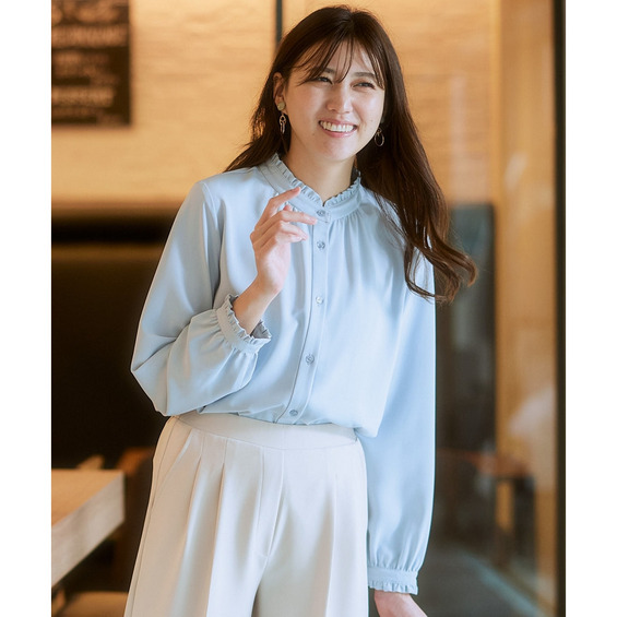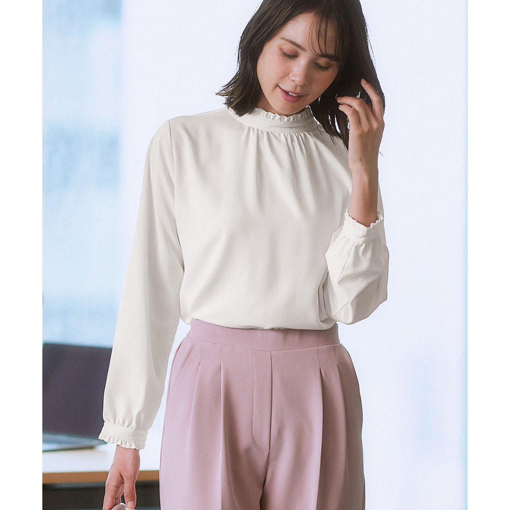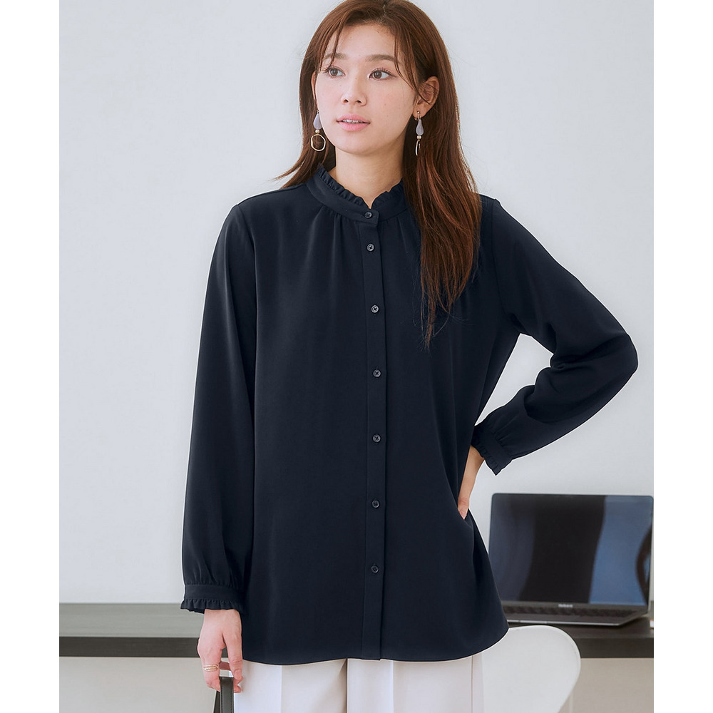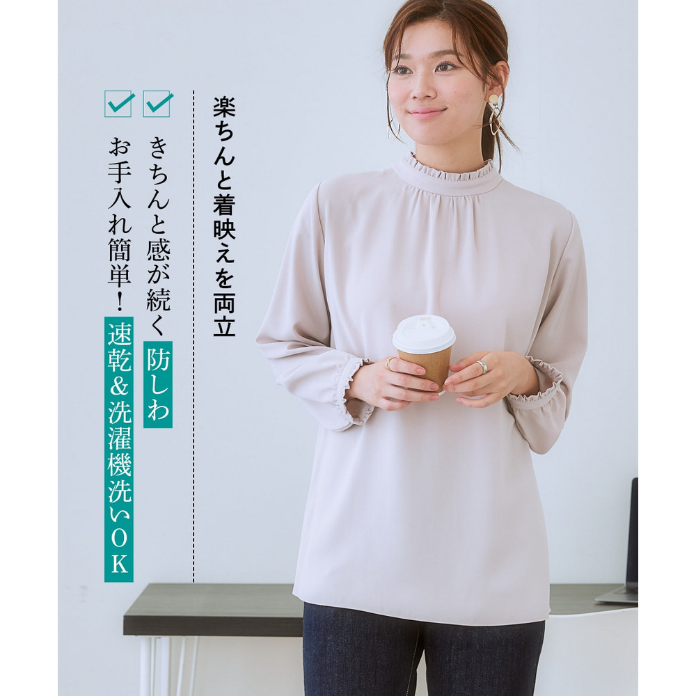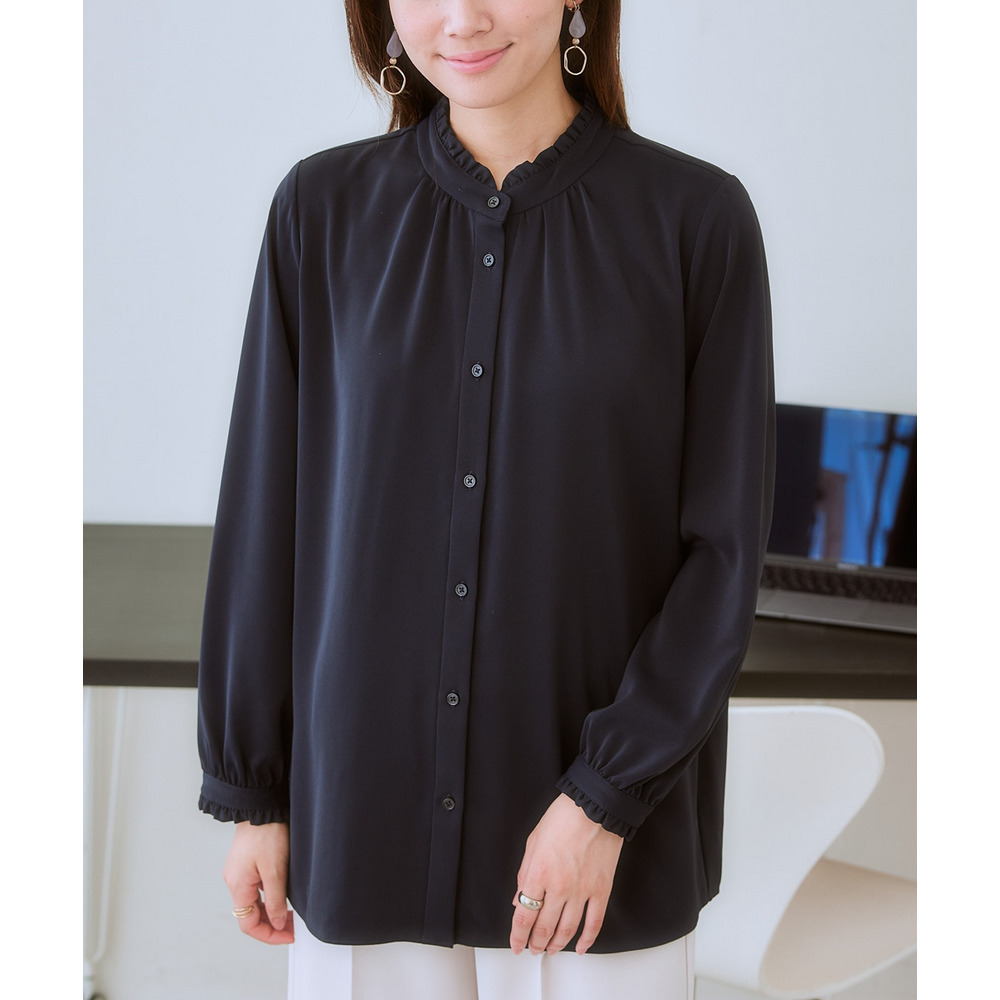 ストレッチパウダーサテン前後2WAYスタンドフリルブラウス(しわになりにくい・速乾・洗濯機OK・UVカット) 大きいサイズ