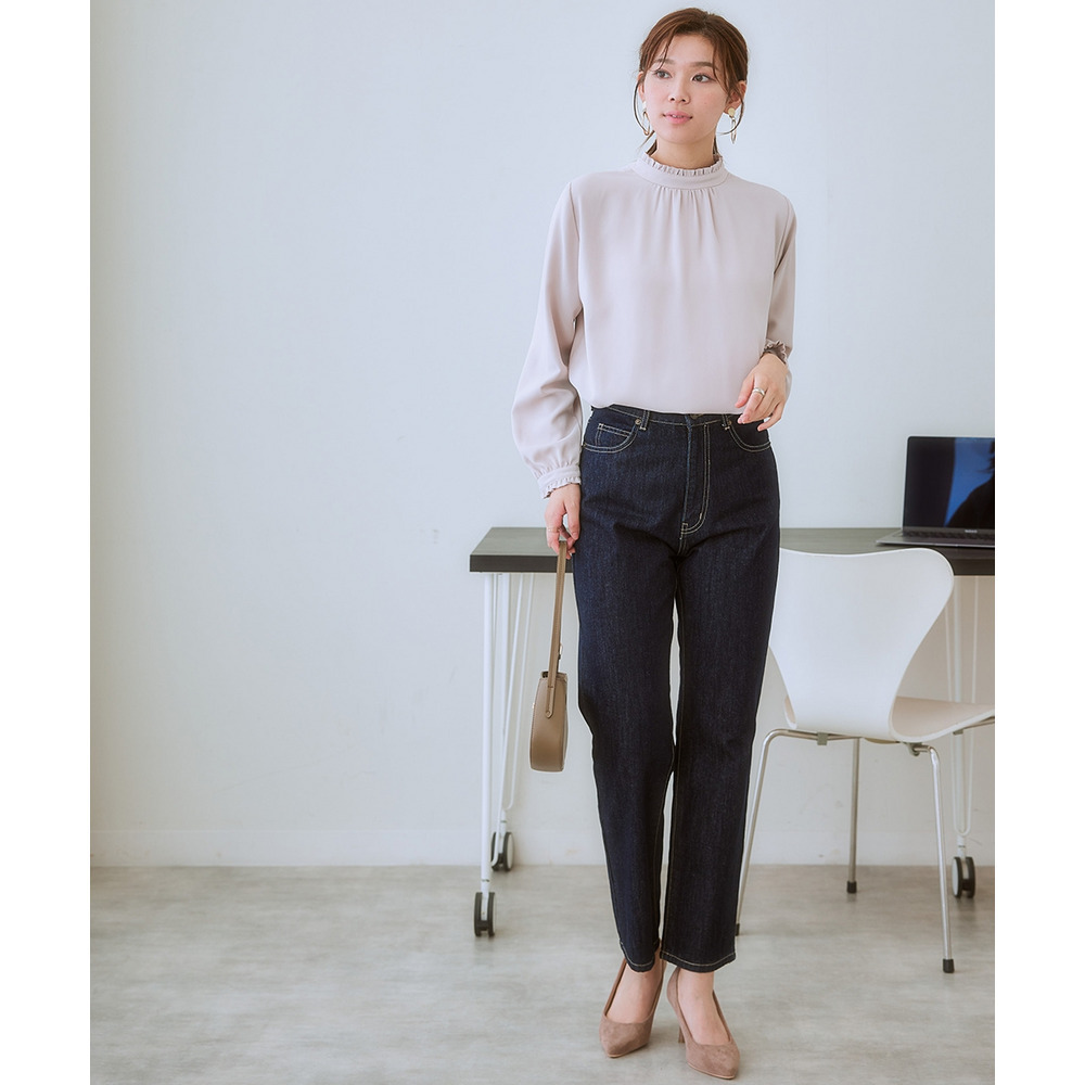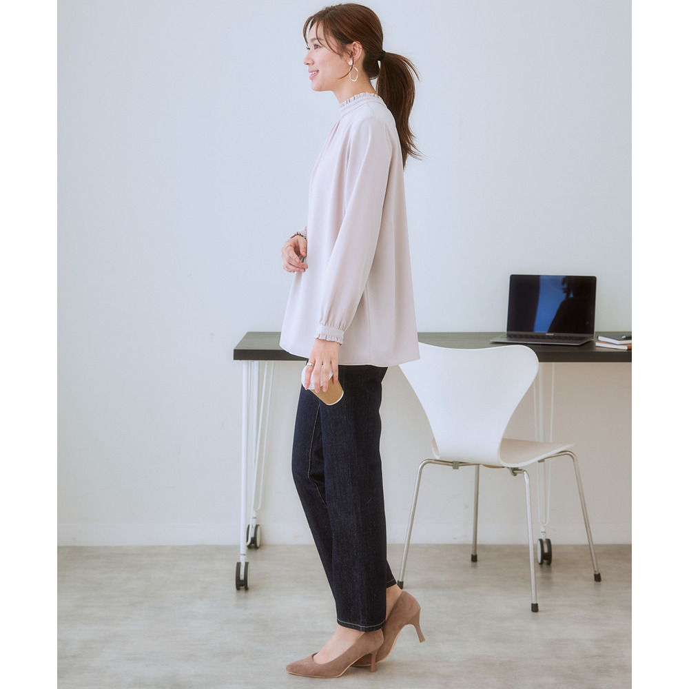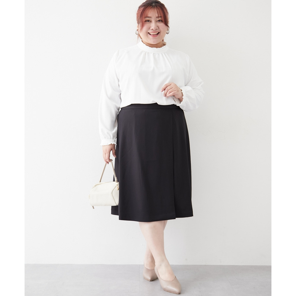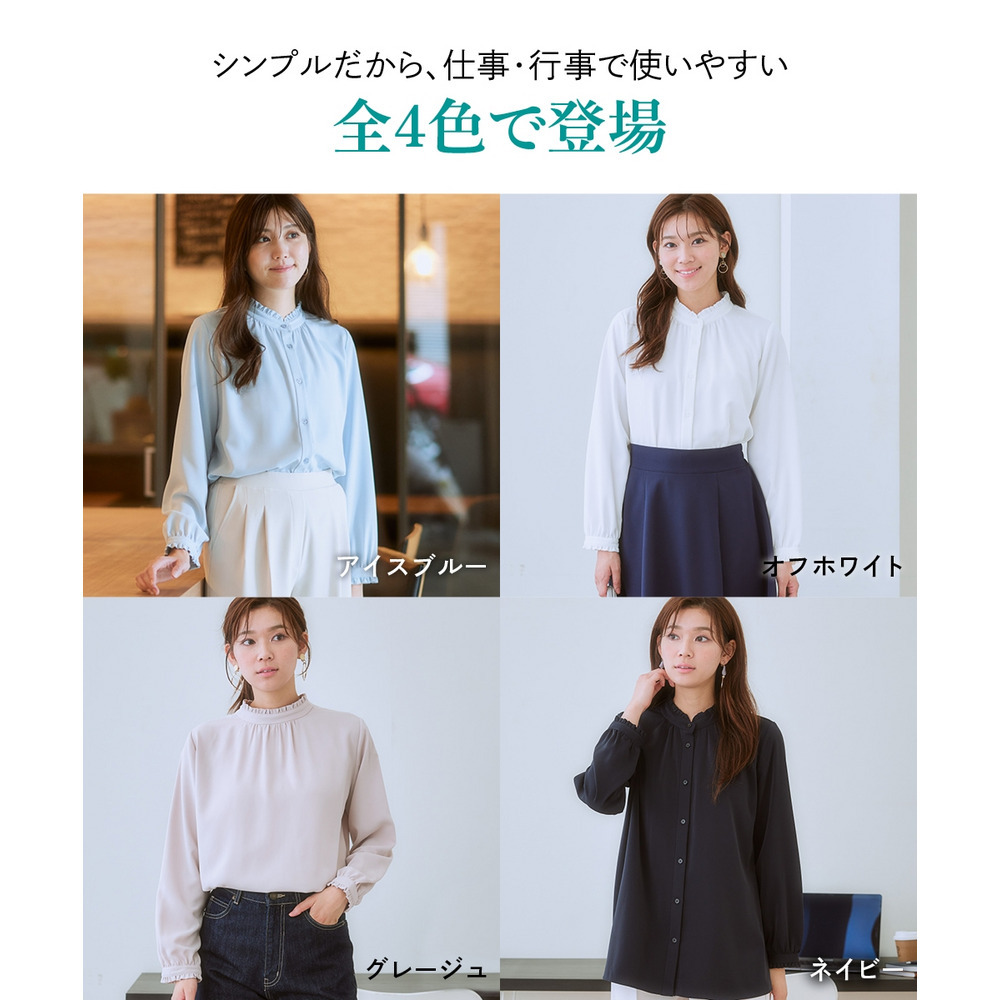 ストレッチパウダーサテン前後2WAYスタンドフリルブラウス(しわになりにくい・速乾・洗濯機OK・UVカット) 大きいサイズ