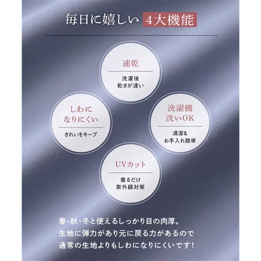 ・働く女性の毎日をサポートする「しわになりにくい、速乾、洗濯機OK、UVカット」の優秀機能素材。