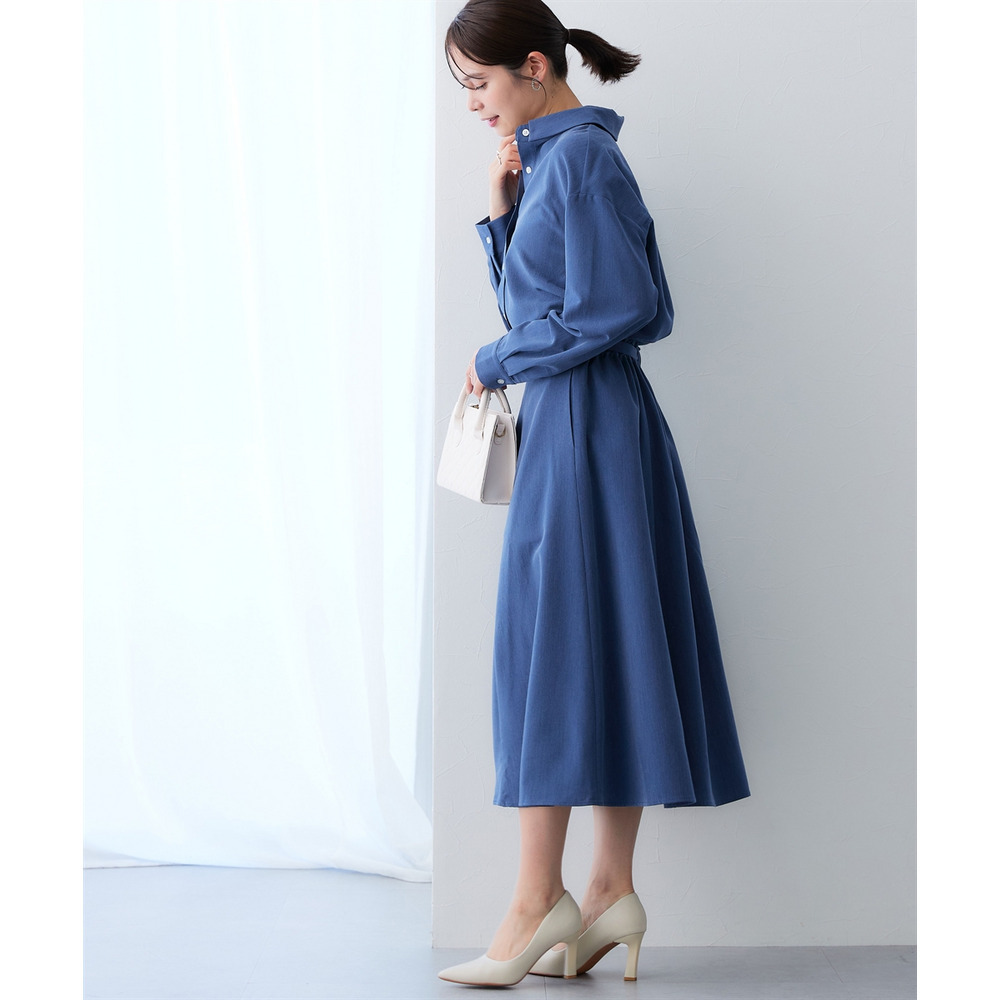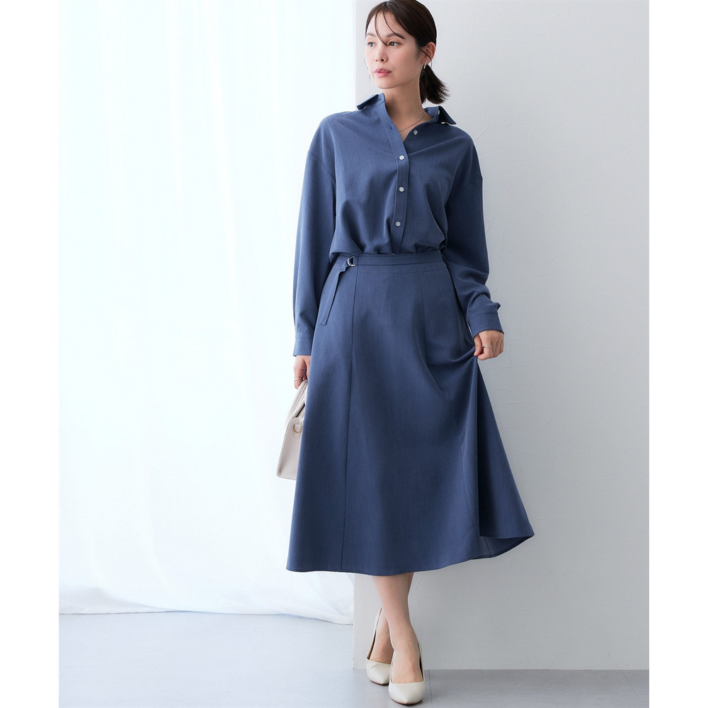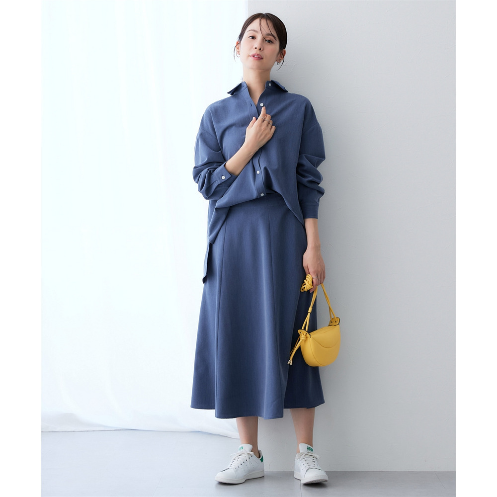 セットアップ: 同素材の「デニム調シャンブレーシャツ」や「2WAYリボンブラウス」と合わせることで、ワンピース風の洗練されたセットアップスタイルが完成します。