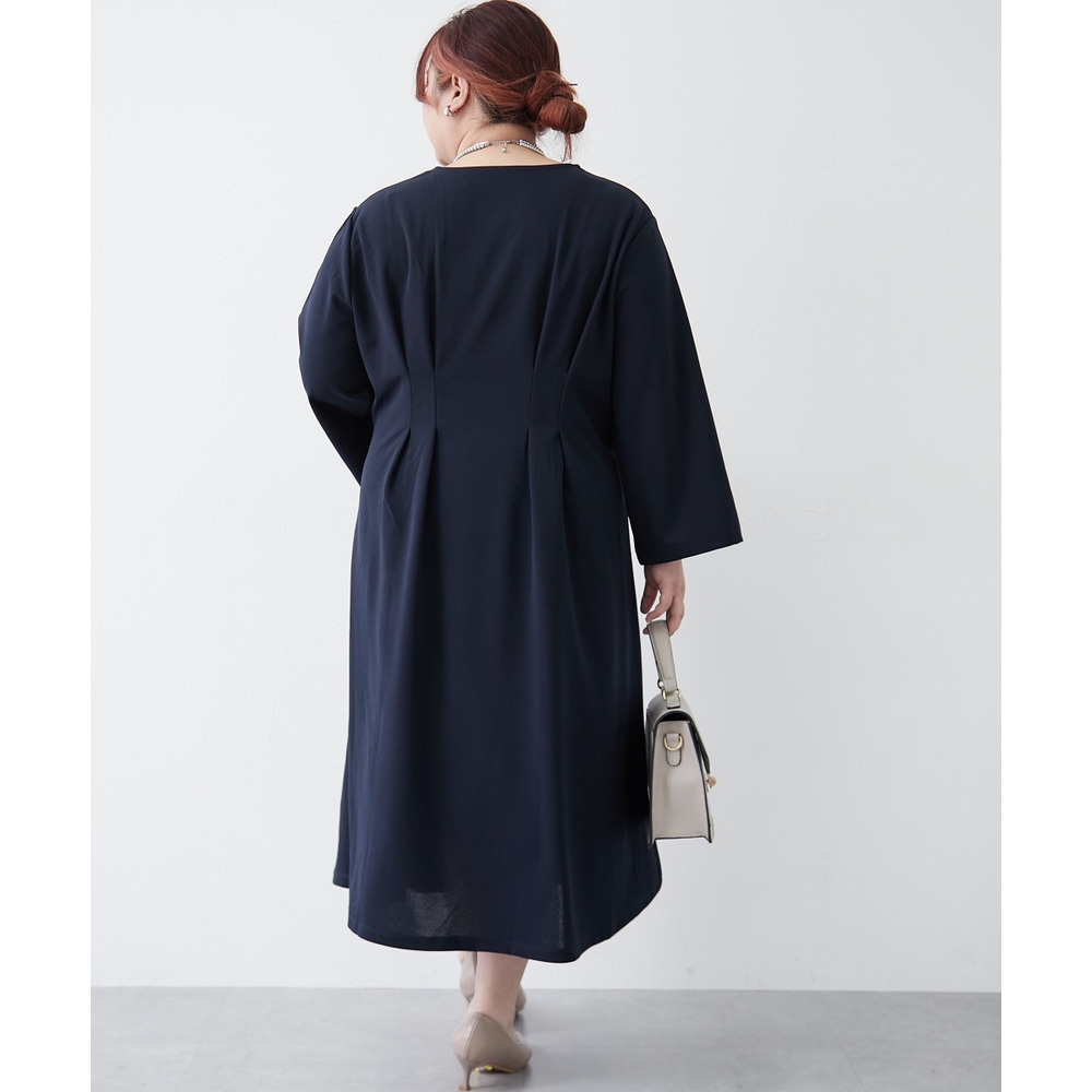 カットソー素材パール調ボタン袖スリットワンピース 大きいサイズ