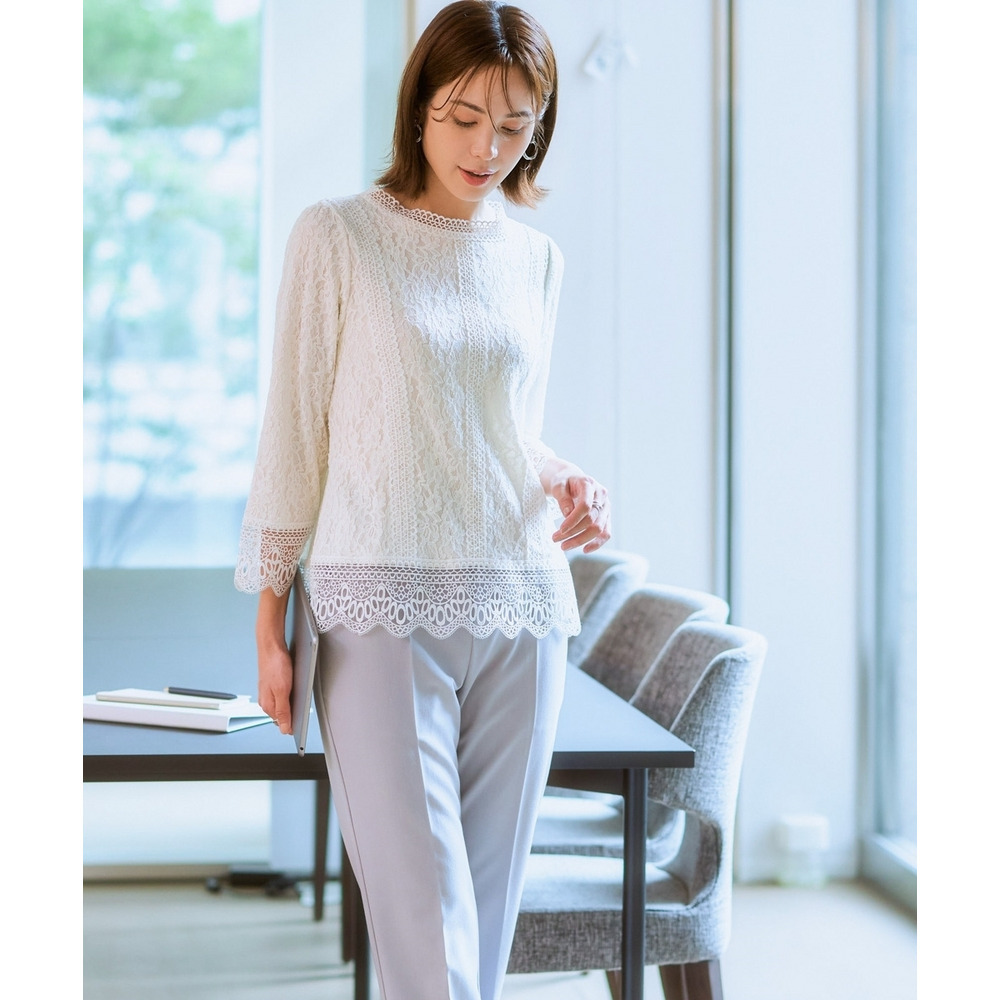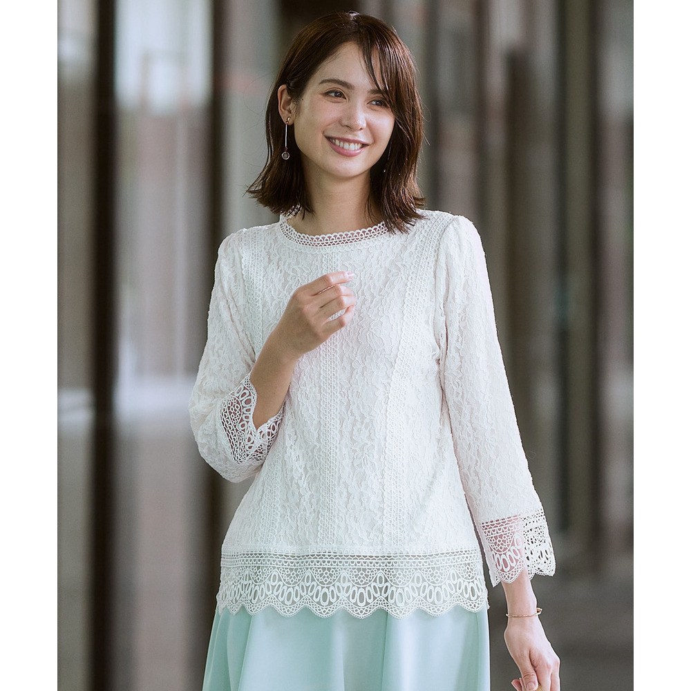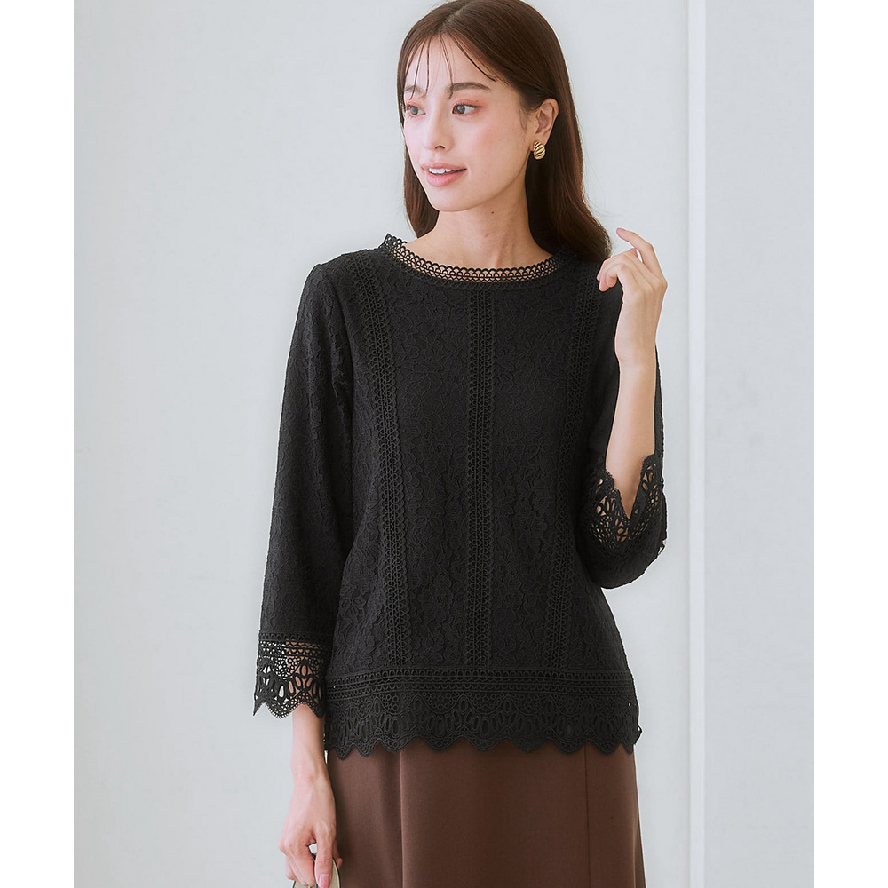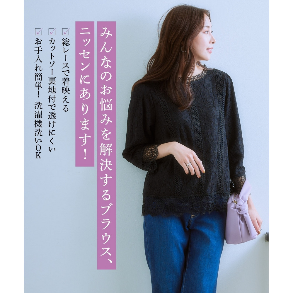 【カットソー裏地付】総レース8分袖ブラウス(ウォッシャブル) 大きいサイズ