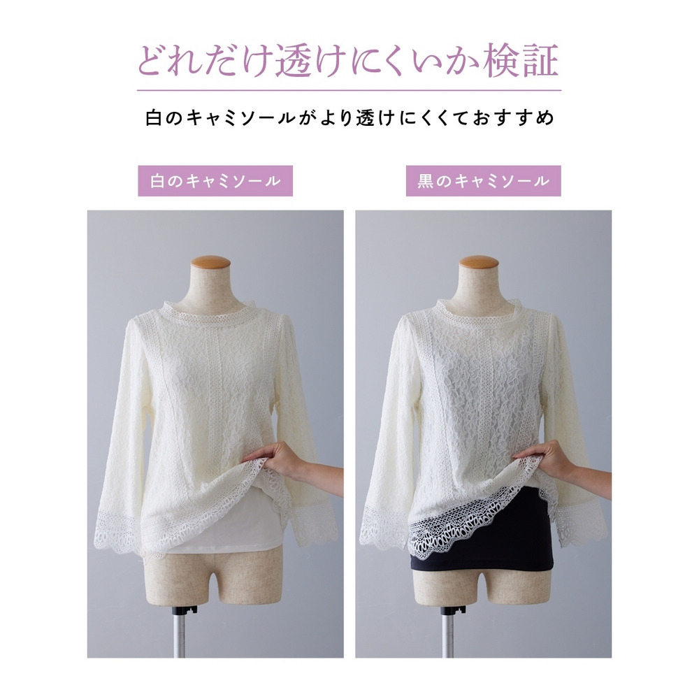 | 素材 | 品質=【レース部分】ナイロン68%・レーヨン31%・再生繊維(セルロース)1%【モチーフレース部分】ポリエステル100%【裏地部分】ポリエステル100%(織物) |