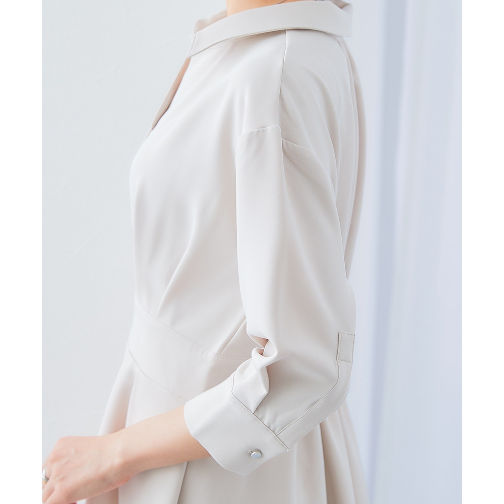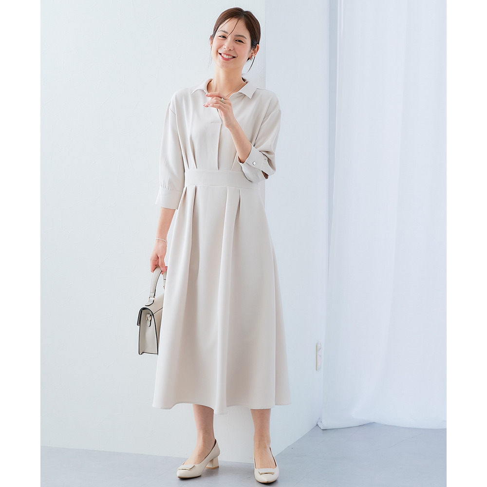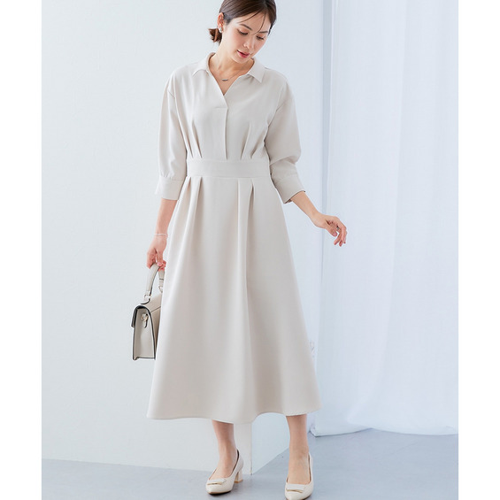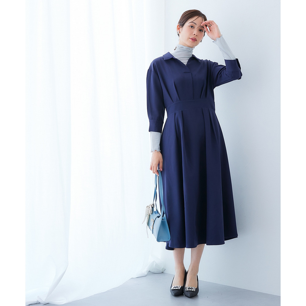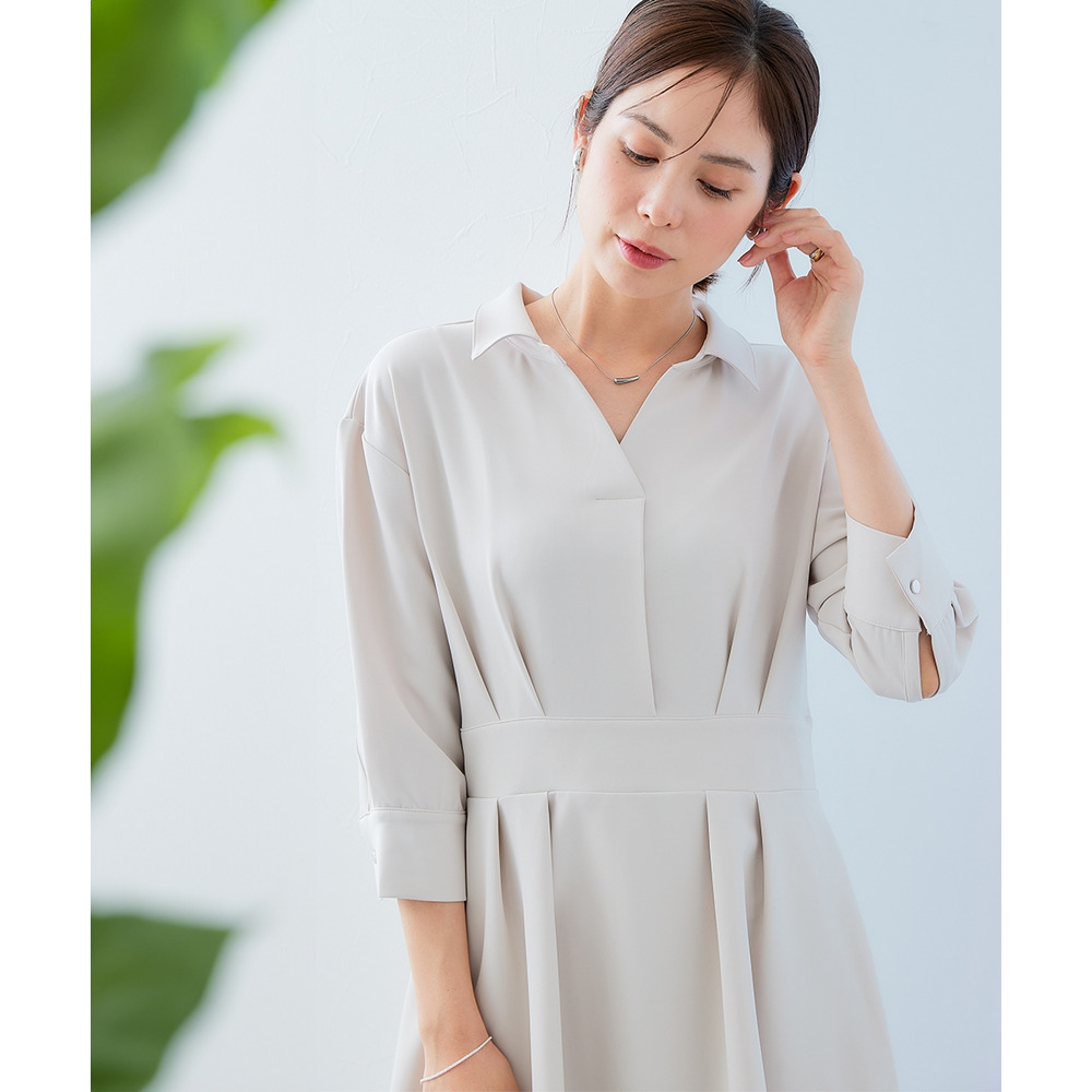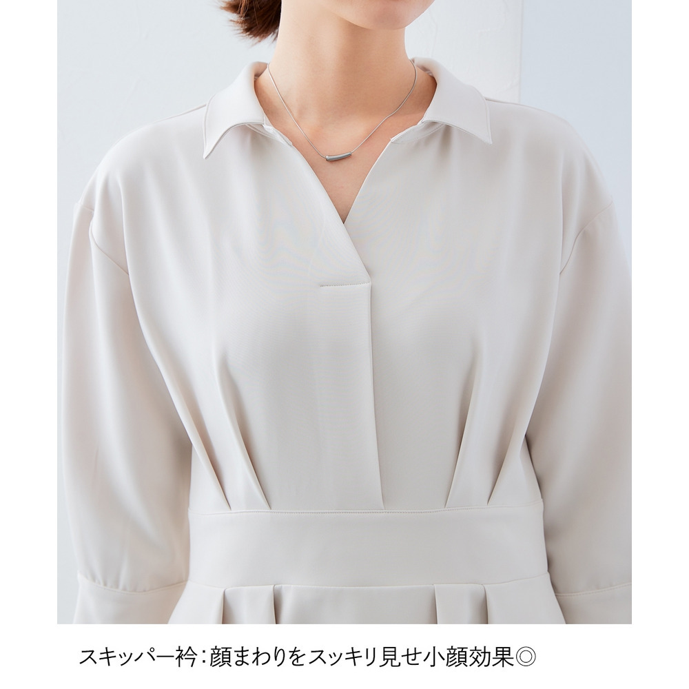 ・デコルテ周りが美しく見えるスキッパー衿と、ウエストマークされたタックデザインで自然とスタイルアップ。