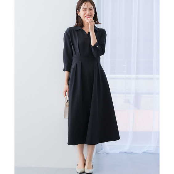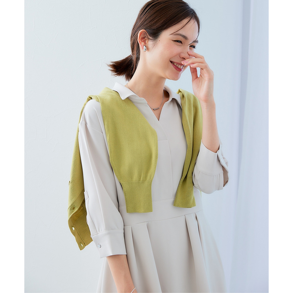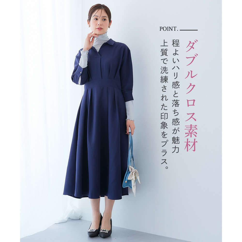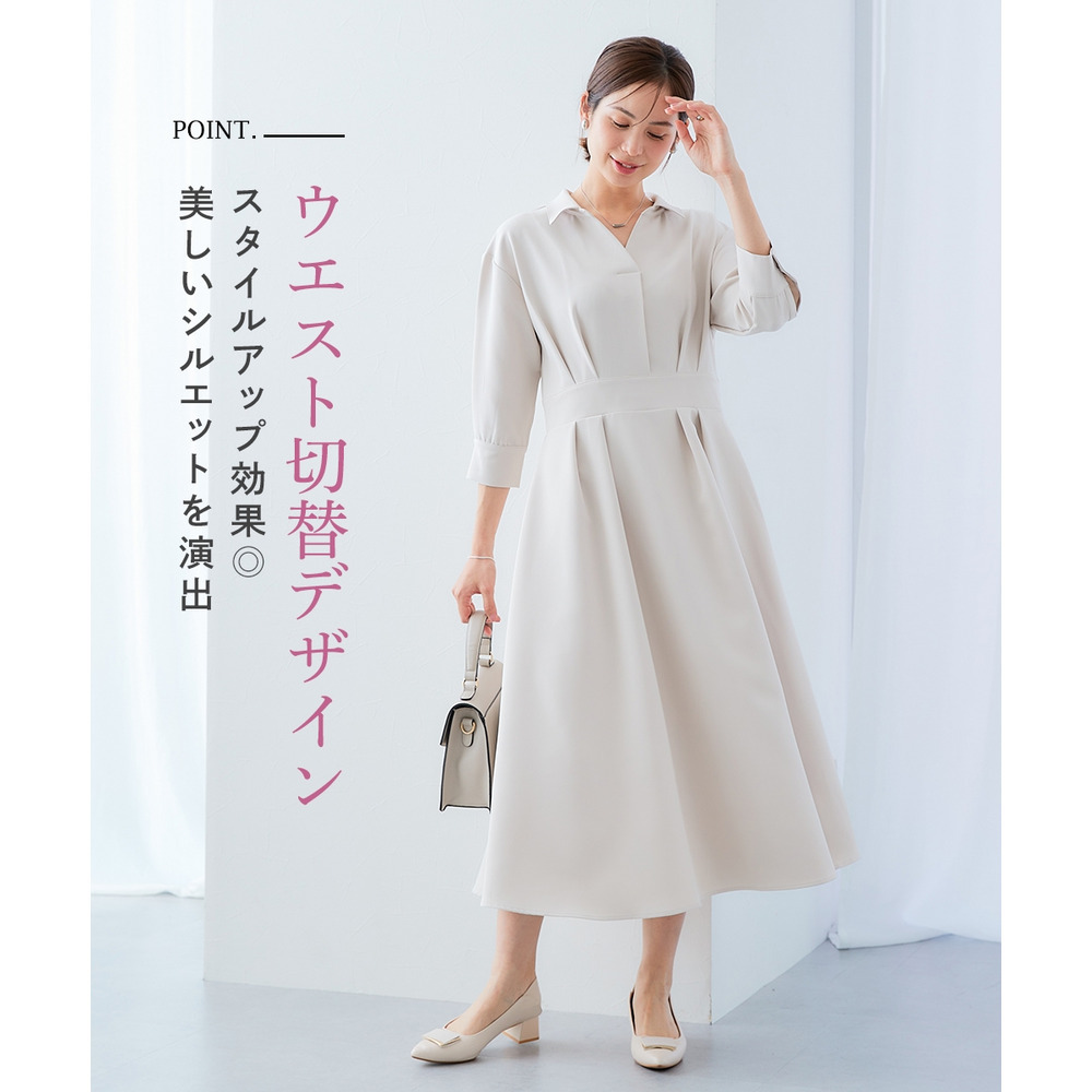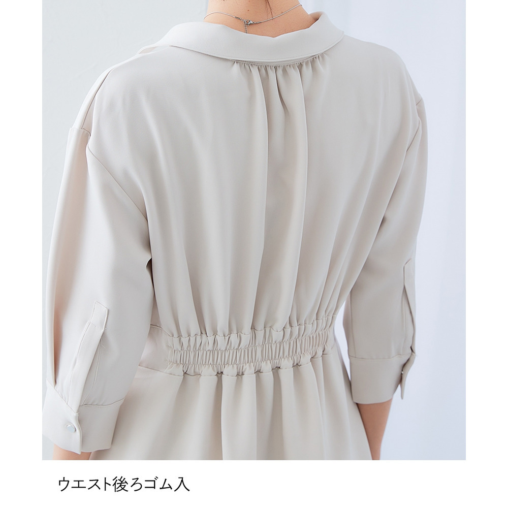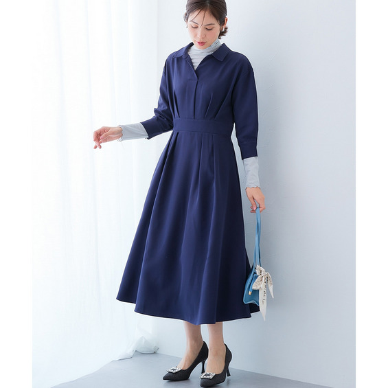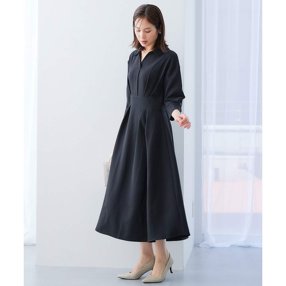 ・デコルテ周りが美しく見えるスキッパー衿と、ウエストマークされたタックデザインで自然とスタイルアップ。