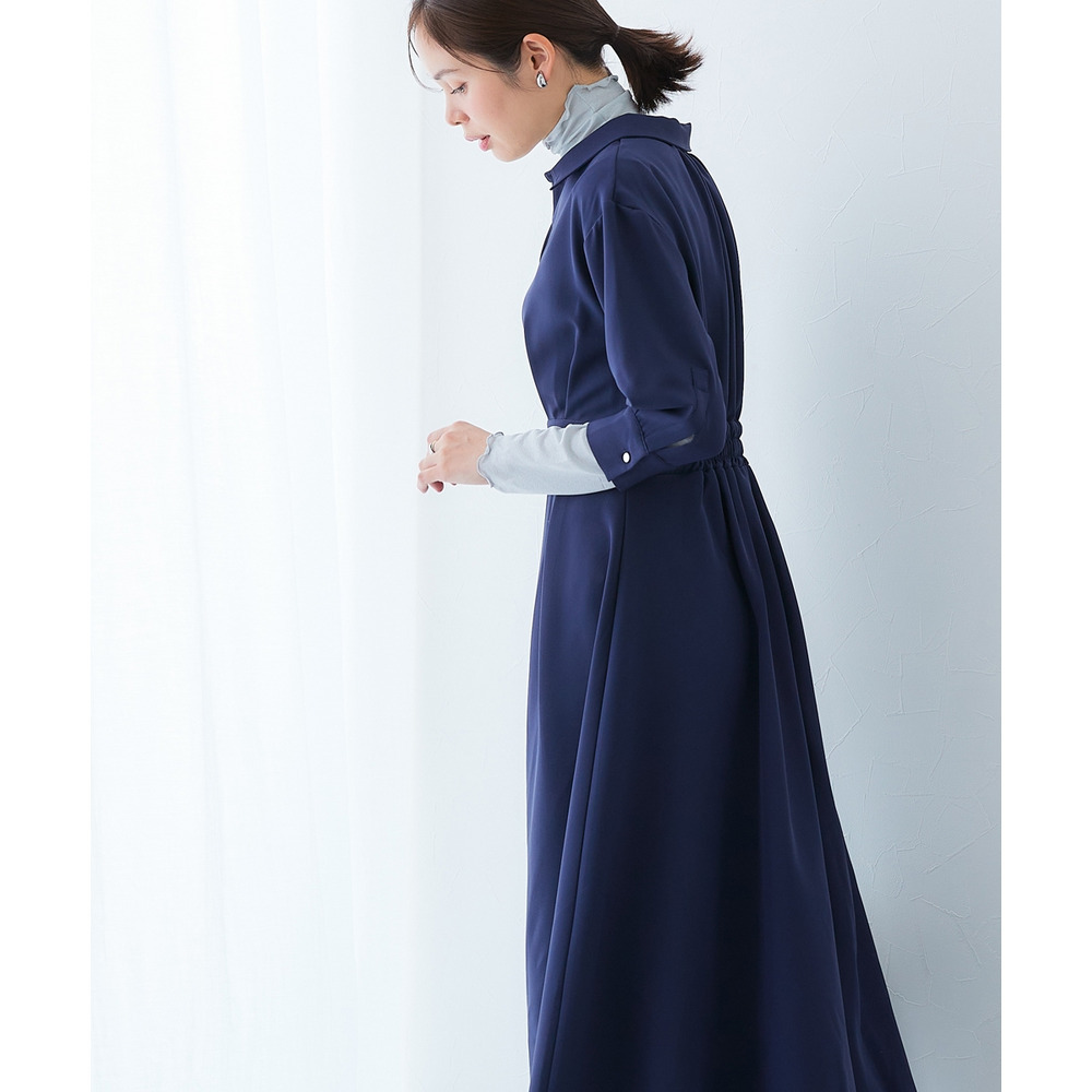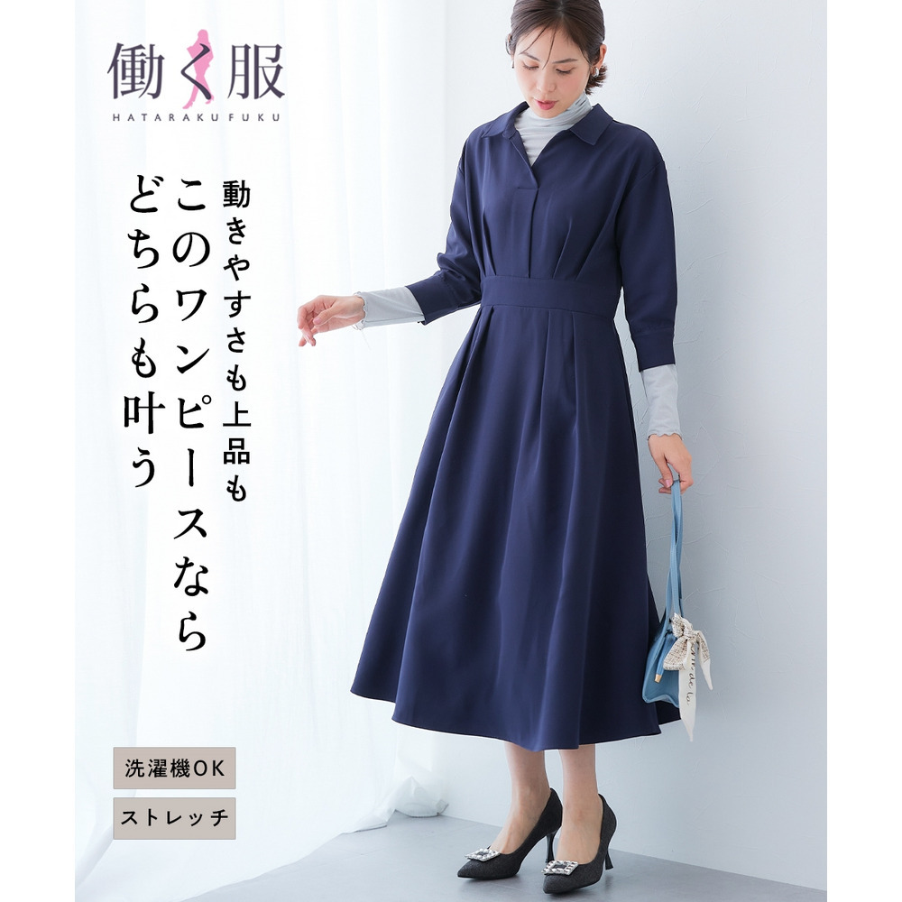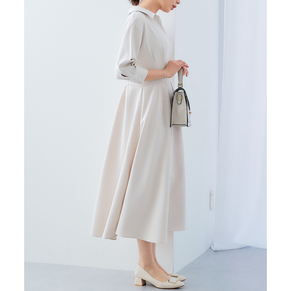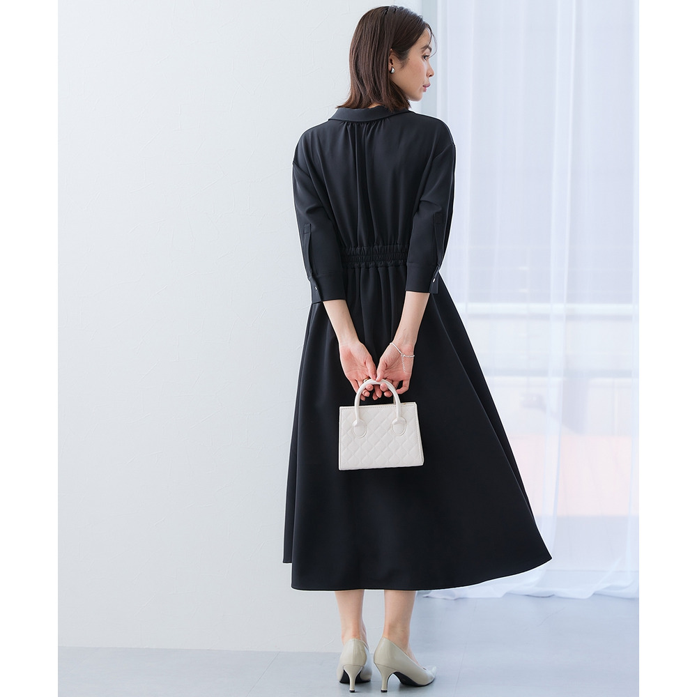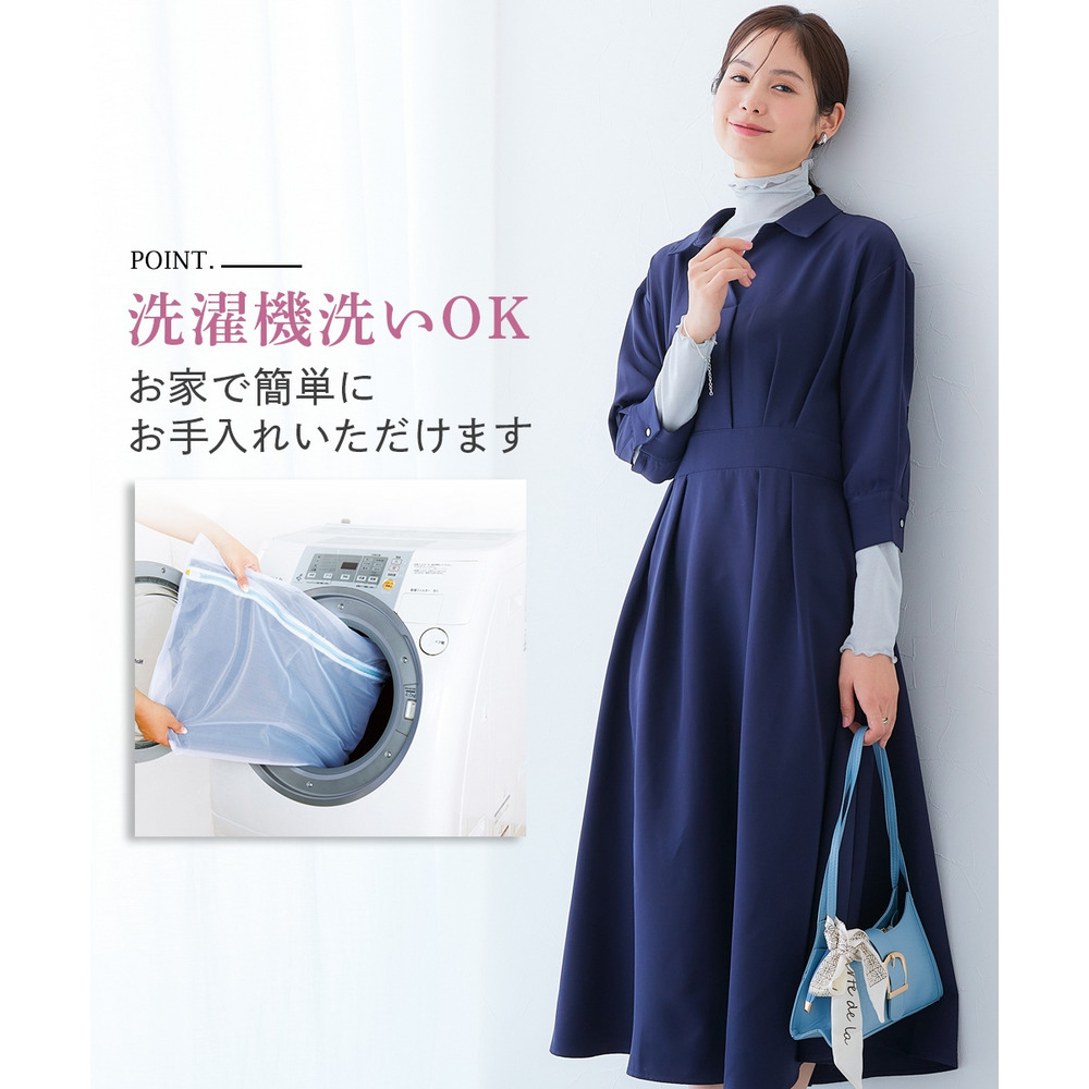 ・デコルテ周りが美しく見えるスキッパー衿と、ウエストマークされたタックデザインで自然とスタイルアップ。