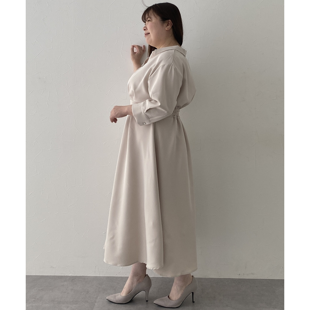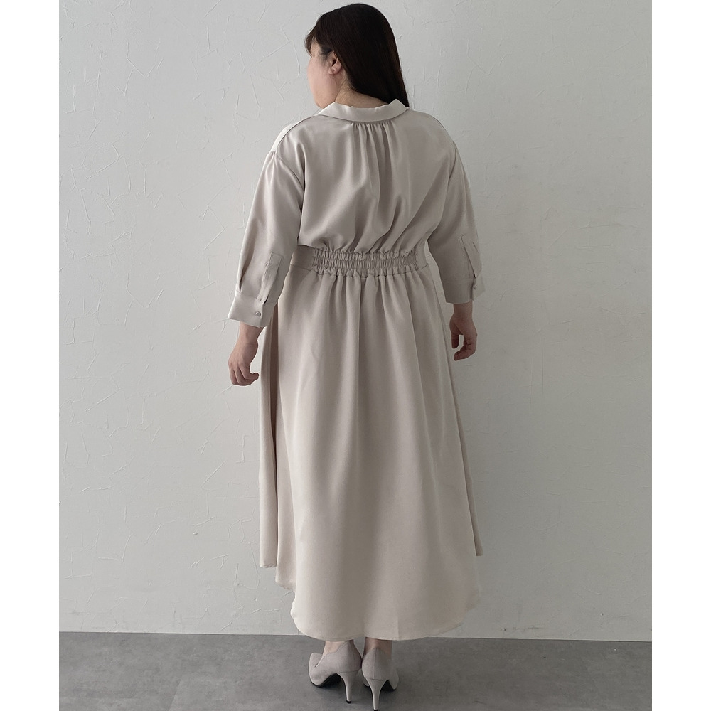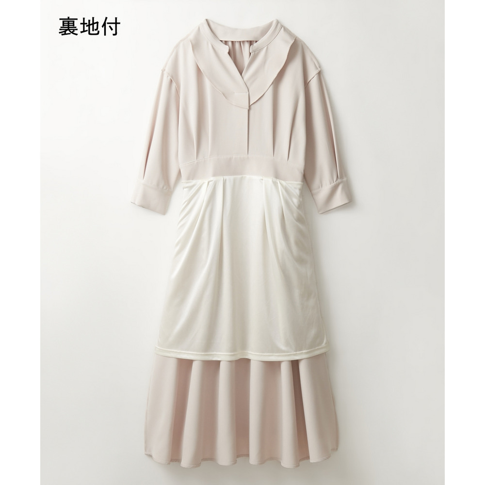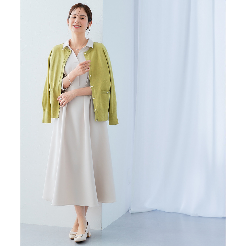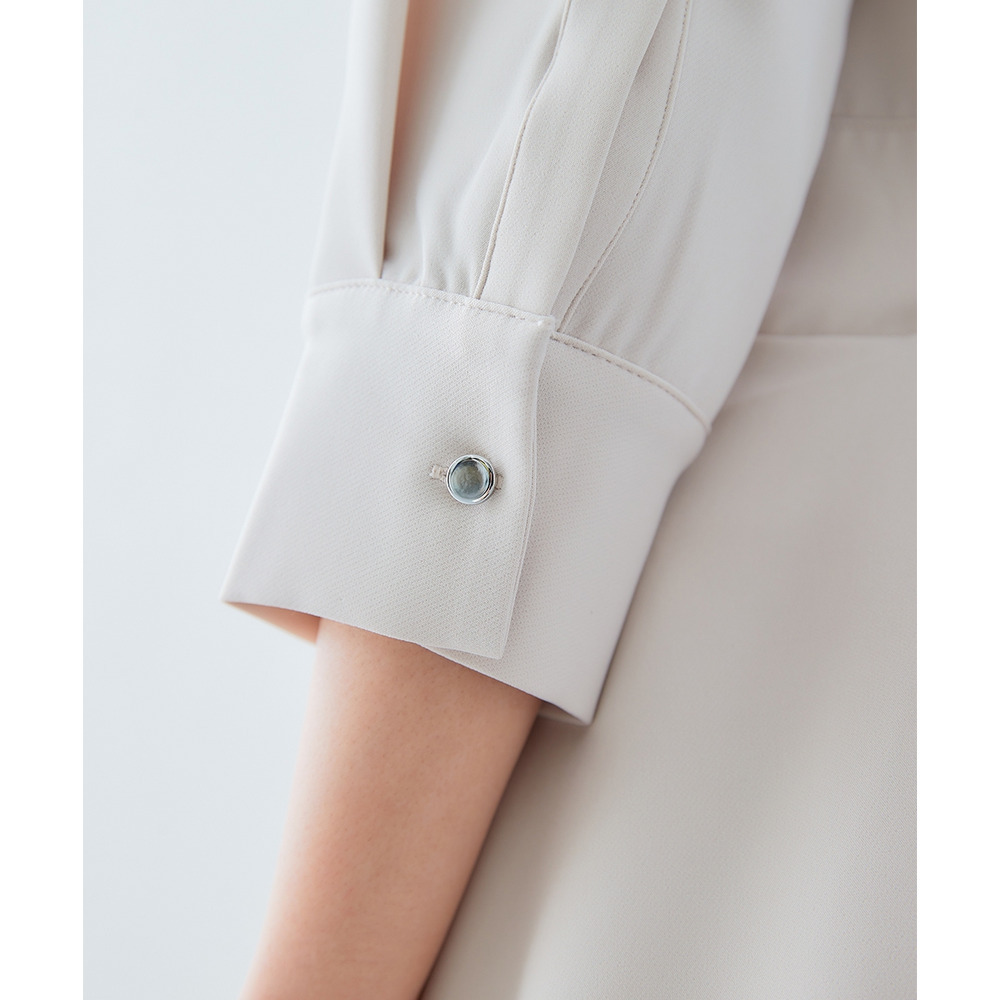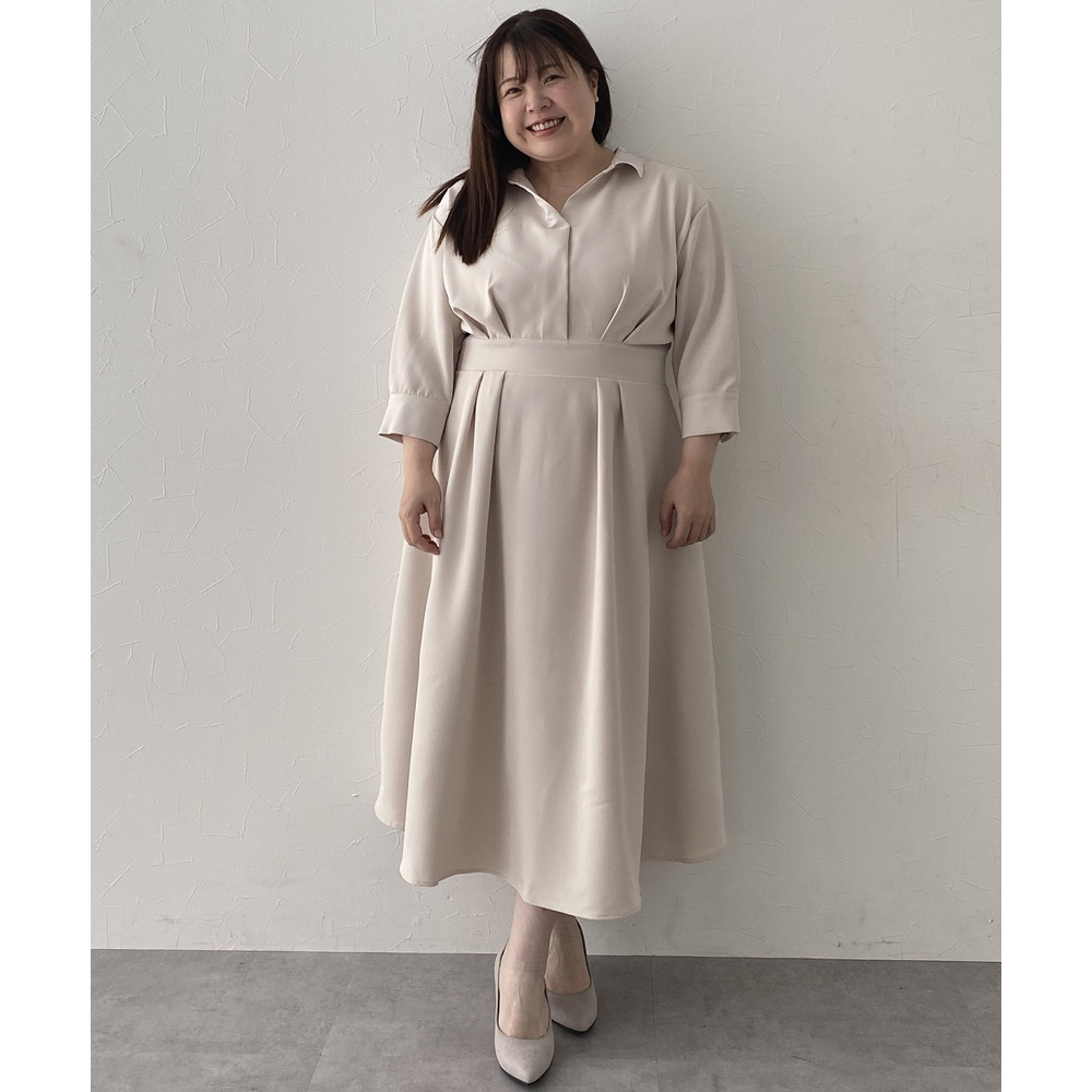 ・デコルテ周りが美しく見えるスキッパー衿と、ウエストマークされたタックデザインで自然とスタイルアップ。
